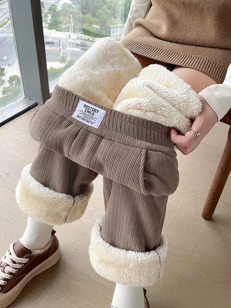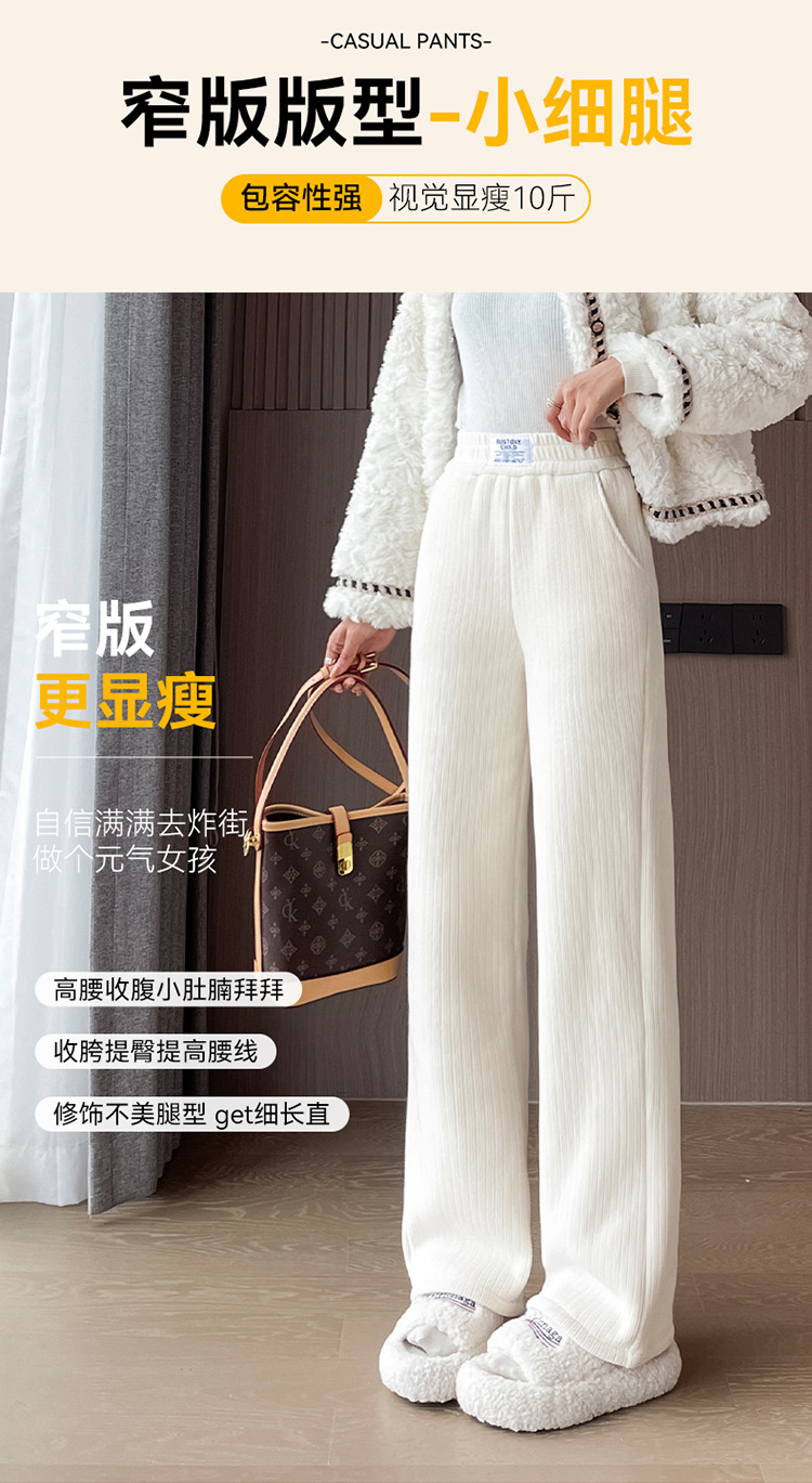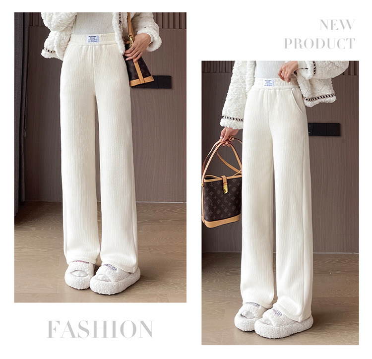 흰색 방풍 바지 여성의 가을과 겨울 2024 새로운 양고기 양털 두꺼운 좁은 넓은 다리 바지 따뜻한 바지 느슨한 직선 다리 바지
