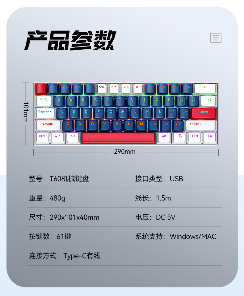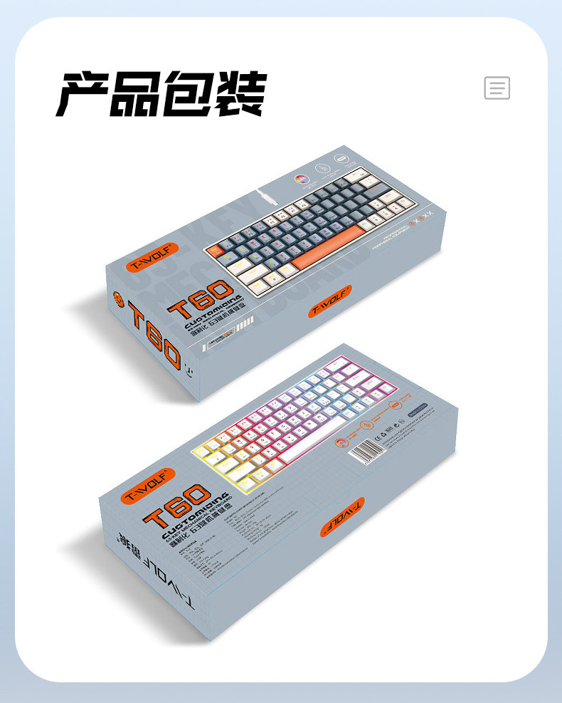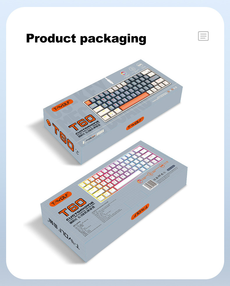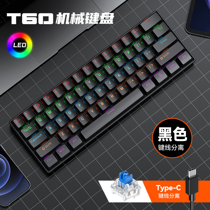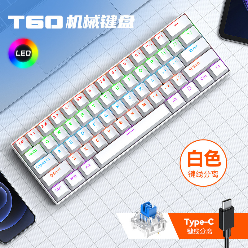 T-WOLF Thunder Wolf T60 기계식 키보드 핫 스왑 가능 61키 게임 혼합 조명 맞춤형 이중 색상 매칭 녹색 축 러시아어스토어 가기