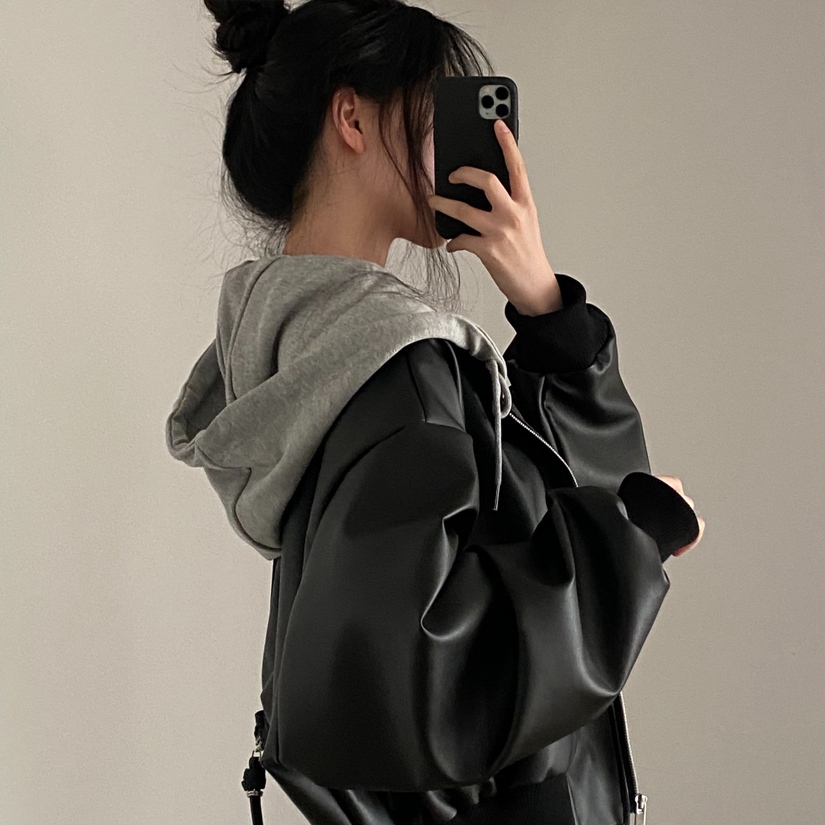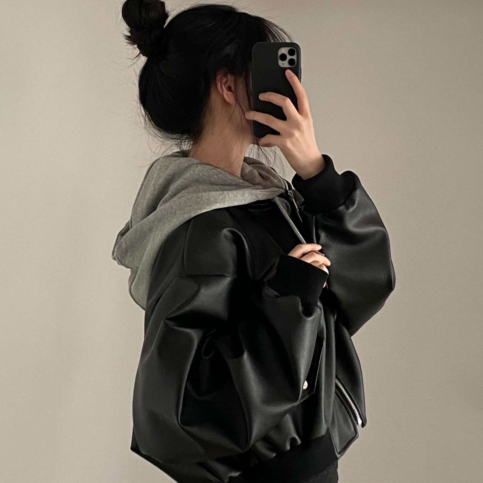 2025 봄과 가을 새로운 컬러 매칭 레트로 지퍼 포켓 탑 여성용 루즈하고 다재다능한 가짜 투피스 후드 가죽 자켓