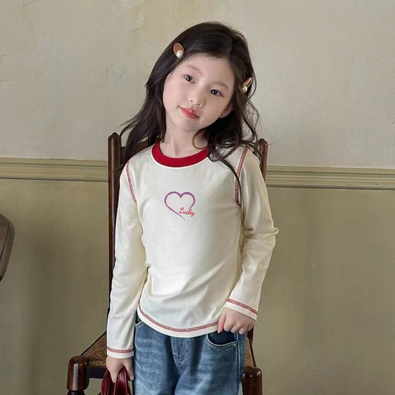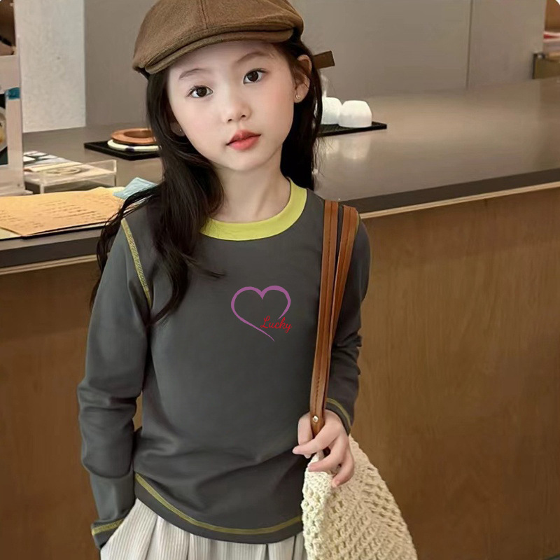 가을 겨울 여아용 달콤한 하트 무늬 순면 티셔츠 2025 신상 스타일리시 여아 긴팔 티셔츠 어린이 라운드넥 상의