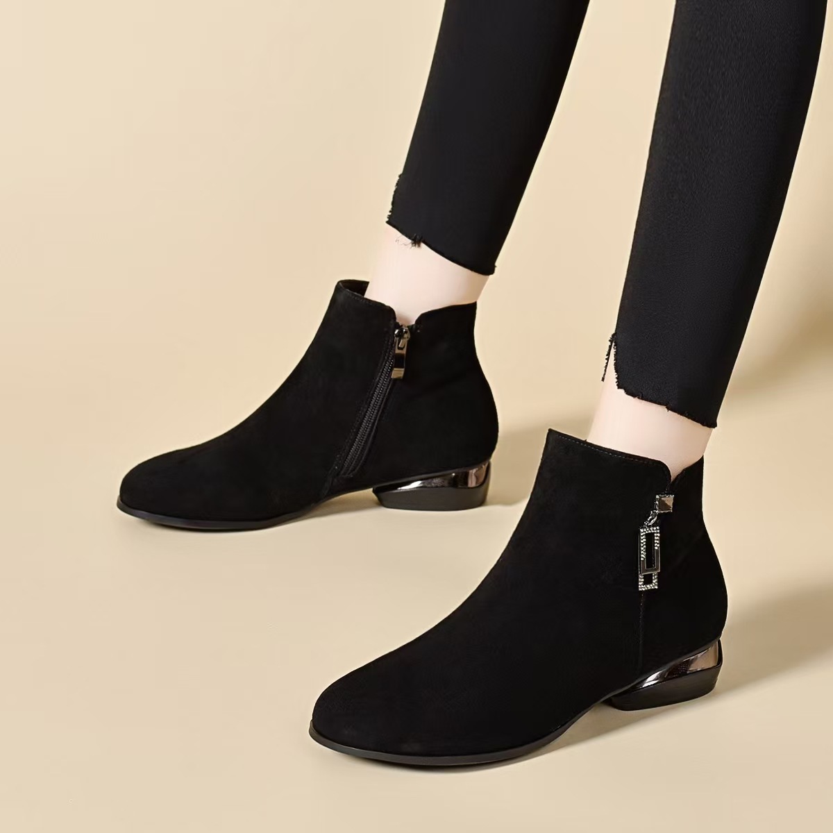 라운드 발가락 부츠 2024 가을 및 겨울 새로운 간단한 우아한 블랙 낮은 굽 여성용 코튼 부츠 라인스톤 메탈 버클 패션 부츠