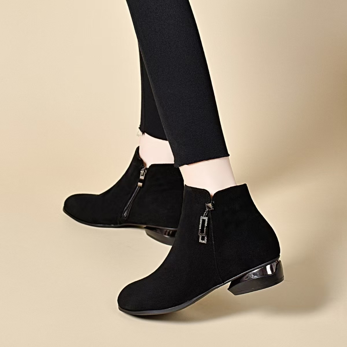 라운드 발가락 부츠 2024 가을 및 겨울 새로운 간단한 우아한 블랙 낮은 굽 여성용 코튼 부츠 라인스톤 메탈 버클 패션 부츠스토어 가기