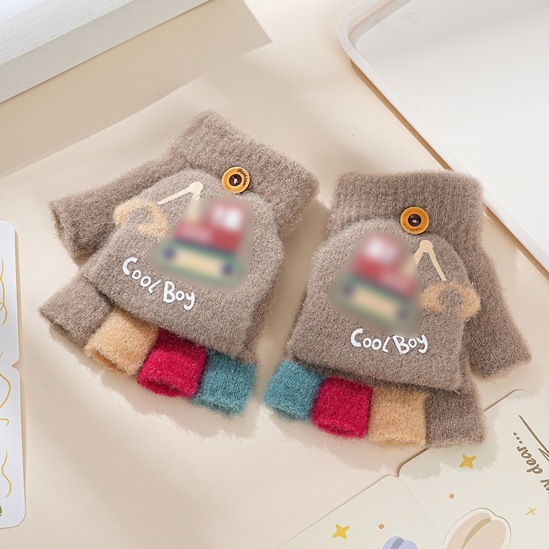 어린이 따뜻한 장갑 소년과 소녀 만화 귀여운 반 손가락 니트 겨울 플립 커버 아기 두꺼운 감기 방지 다섯 손가락