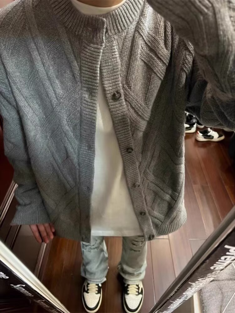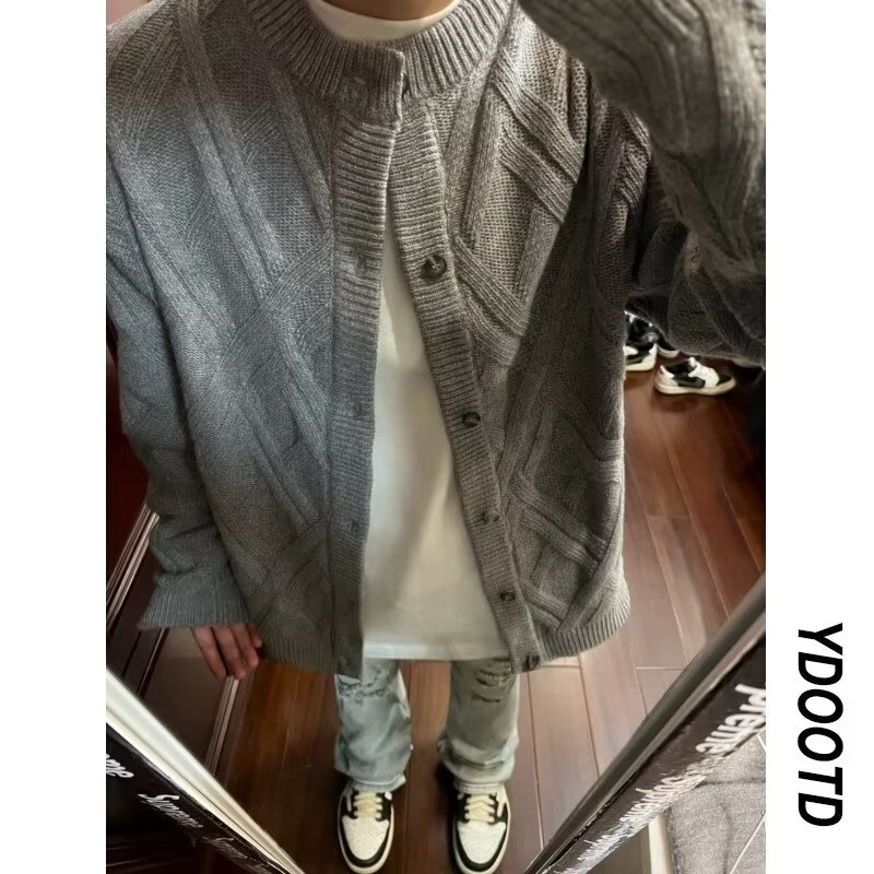 아이보리 트위스트 지퍼 칼라 니트 카디건 남자 일본 스타일 레트로 루즈 캐주얼 따뜻한 올 매치 스웨터 재킷