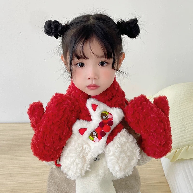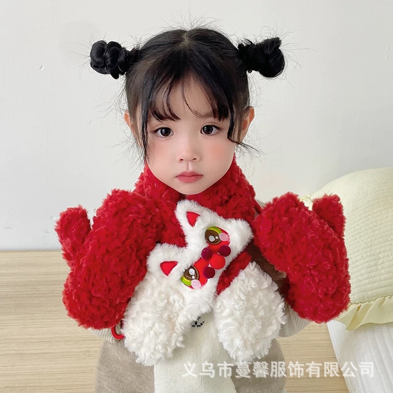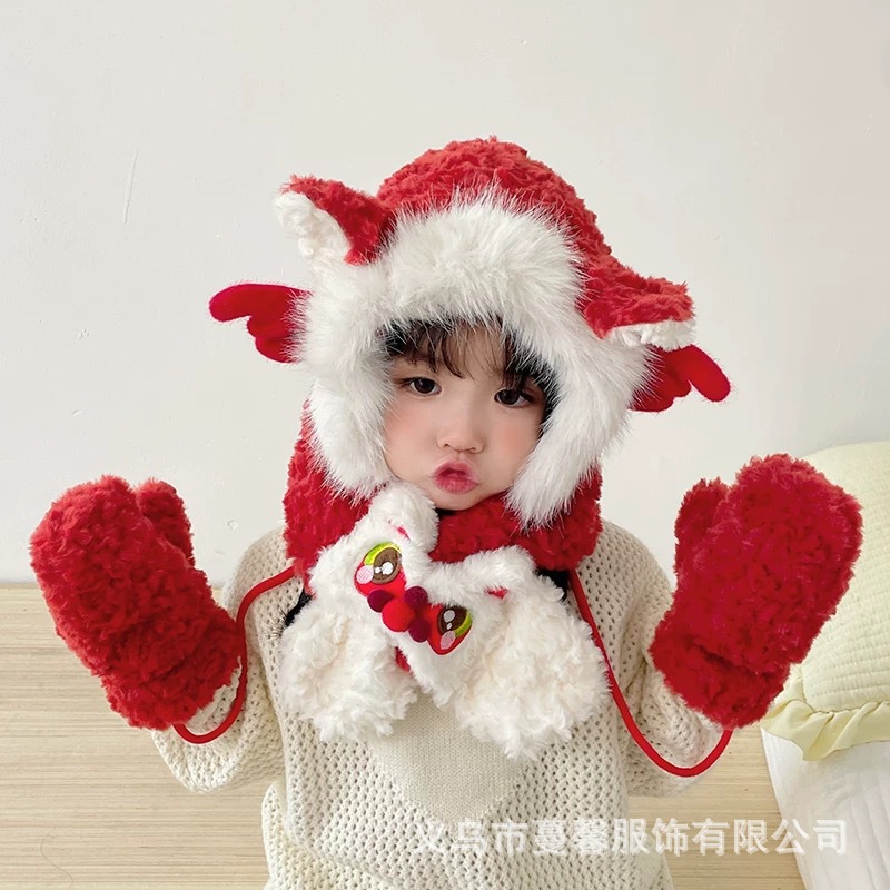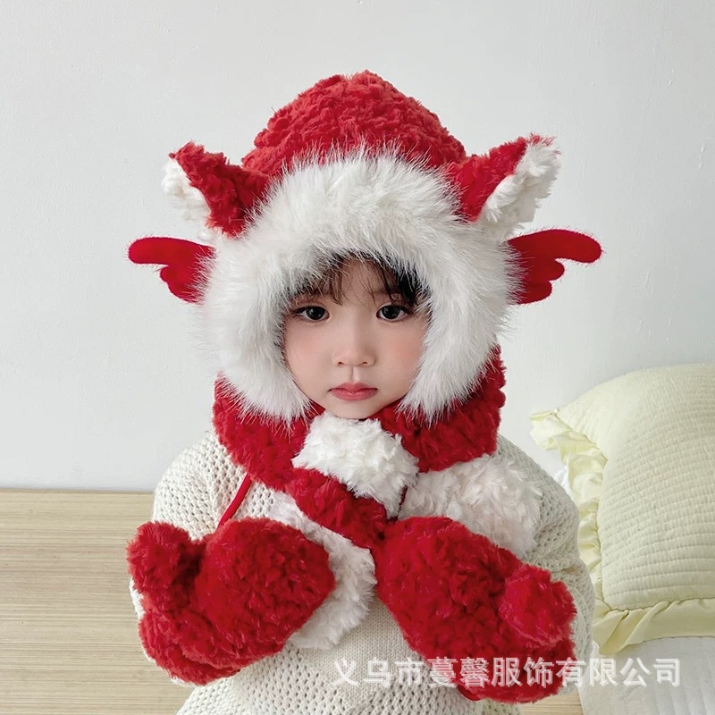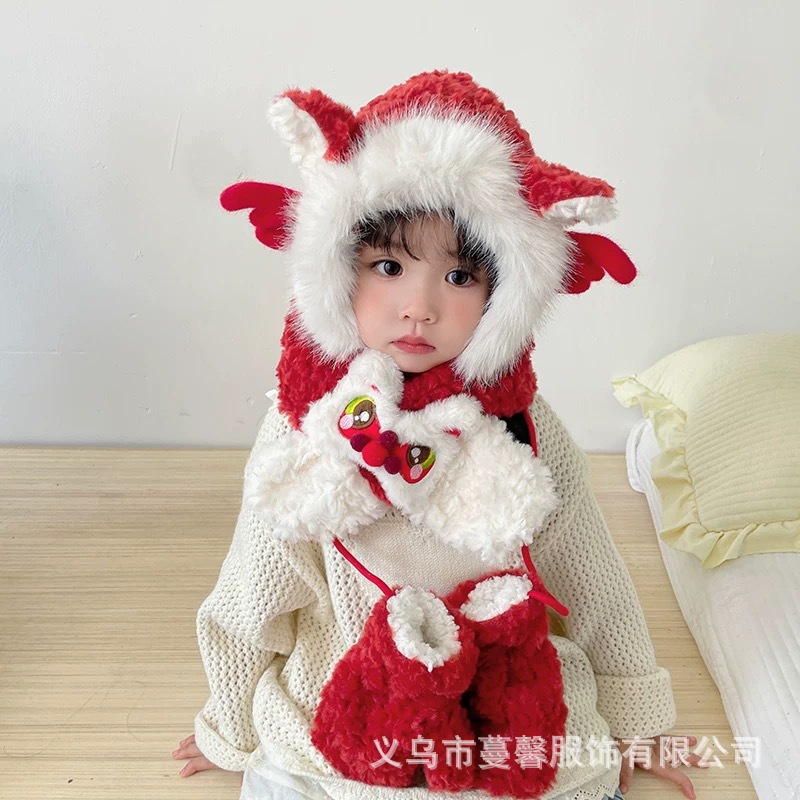 어린이 스카프 올인원 모자 아기 붉은 사자 웨이크 플러시 따뜻한 귀 보호자 새해 소년 소녀를위한 축제 풀오버 모자