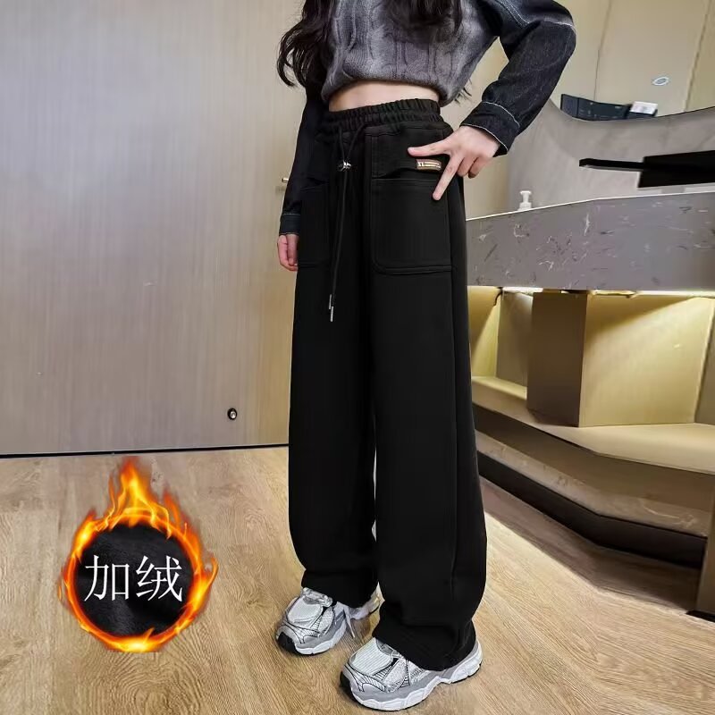 소녀 캐주얼 바지 2024 봄과 가을 새로운 어린이 가을 겨울 두꺼운 원피스 벨벳 바지 느슨한 스트레이트 와이드 레그 바지