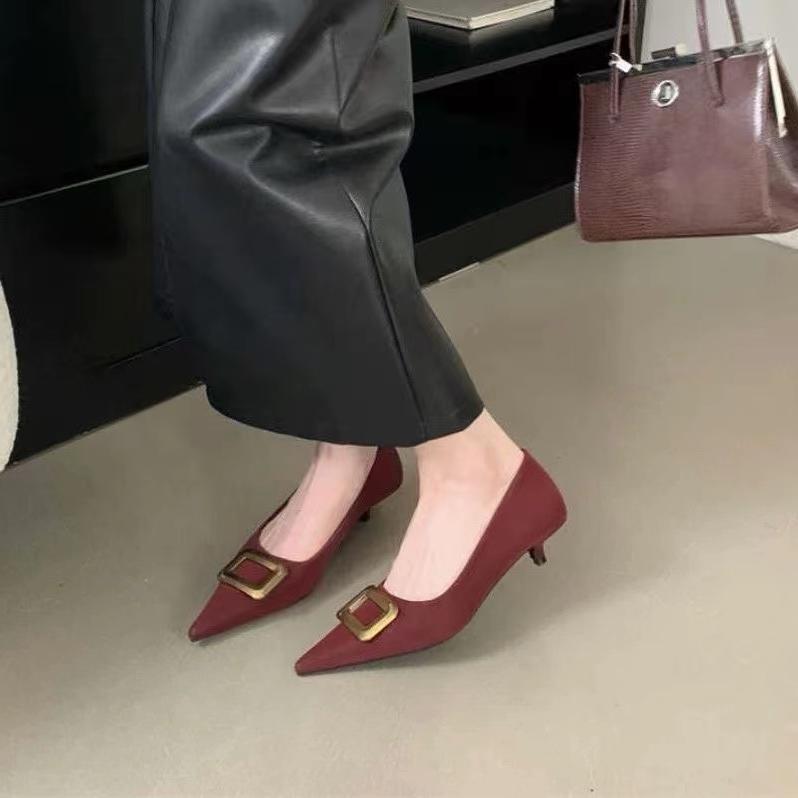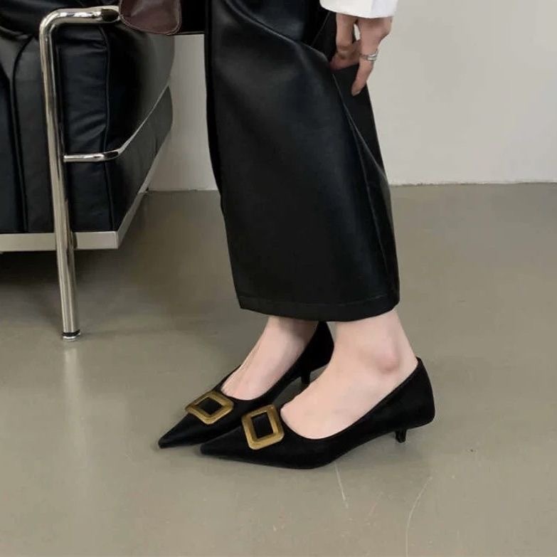 가을과 겨울 2024 새로운 한국 스타일 싱글 신발 틈새 패션 낮은 뒤꿈치 뾰족한 하이힐 메탈 스퀘어 버클 여성 무당 신발스토어 가기