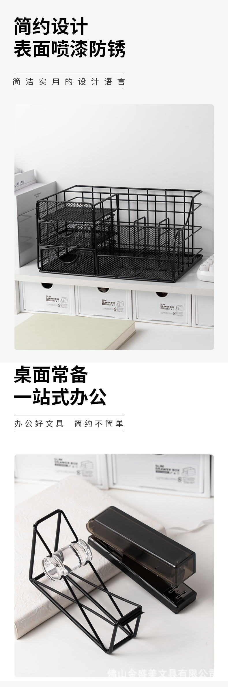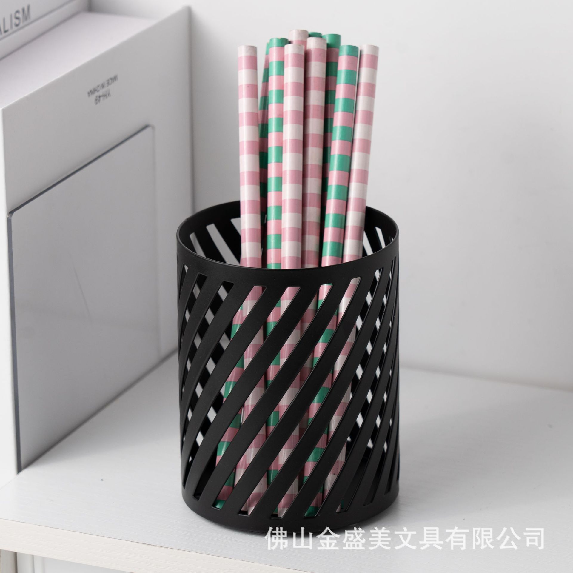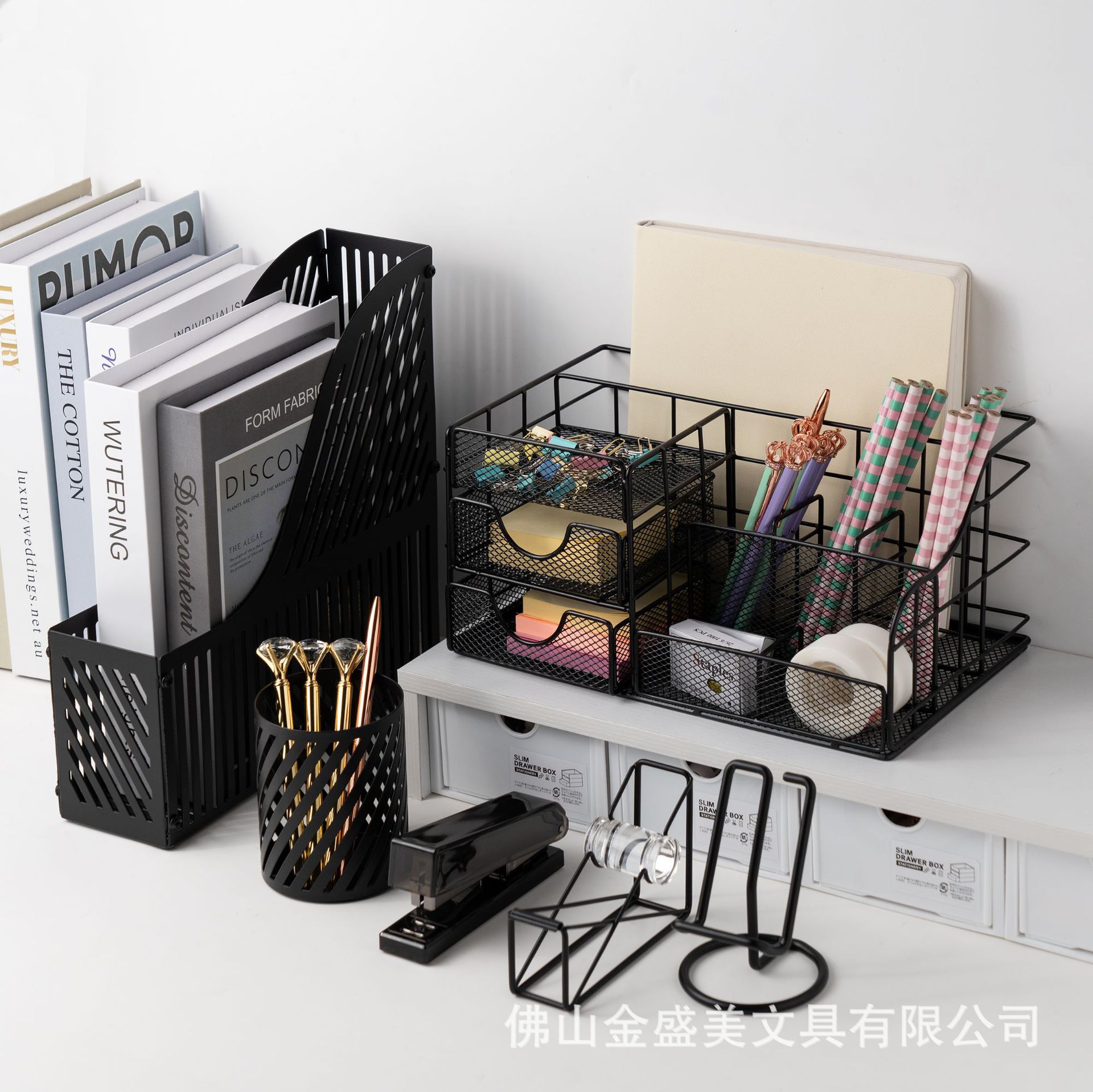 국경 간 창조적 인 검은 금속 데스크탑 저장 랙 펜 홀더 대용량 다기능 문구 저장 스테이플러 도매