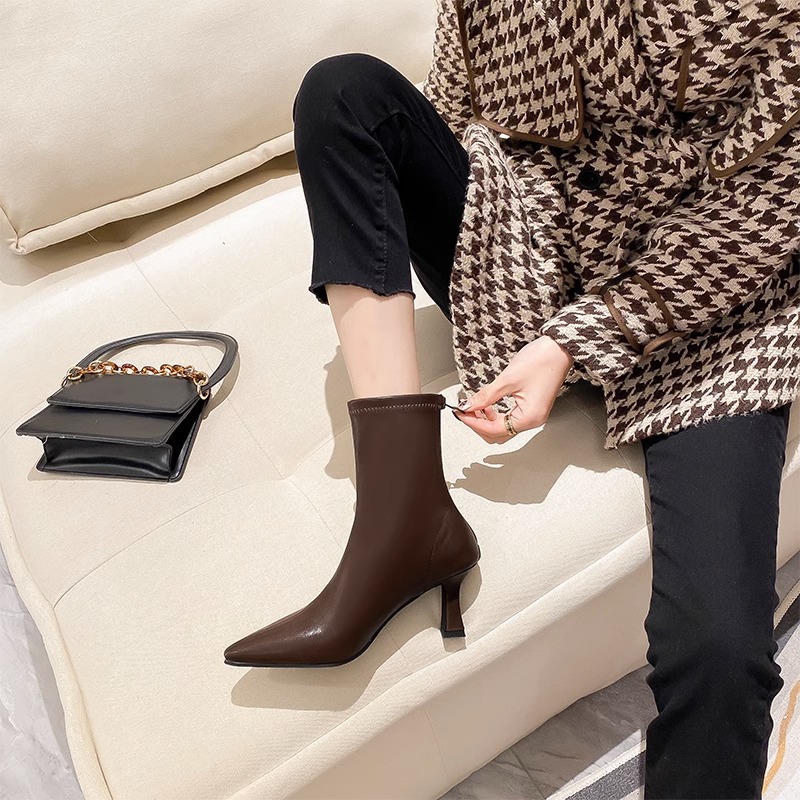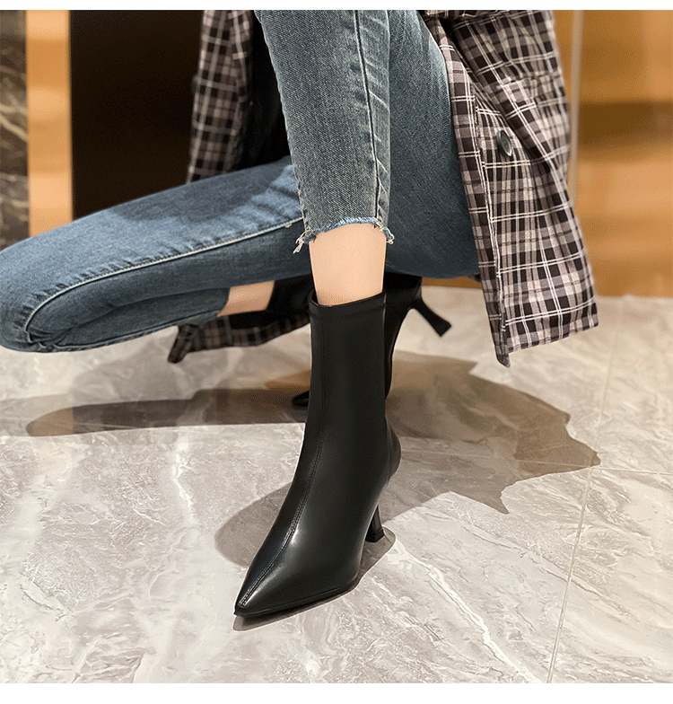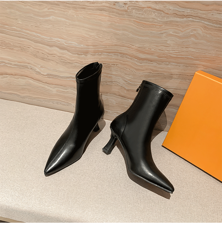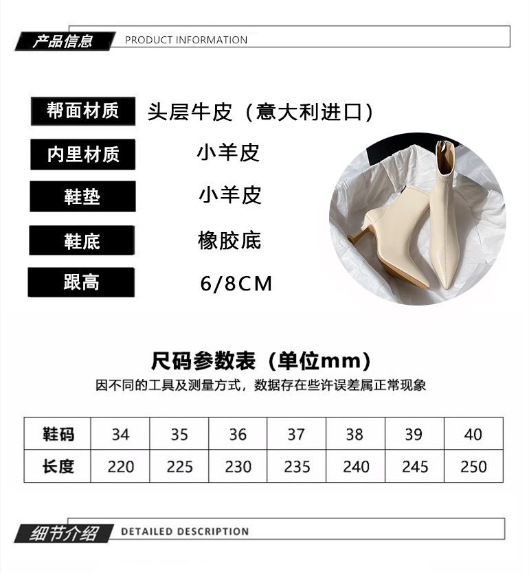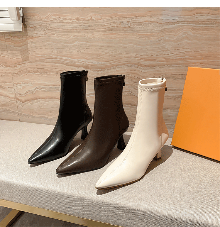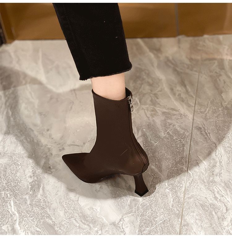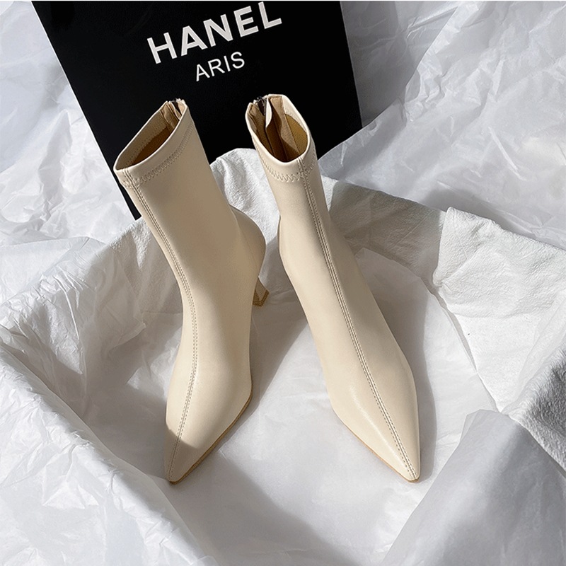 베이지 발목 부츠 여성 하이힐 가을 겨울 2024 새로운 프렌치 얇은 힐 백 지퍼 베어 부츠 포인팅 스트레치 얇은 부츠스토어 가기