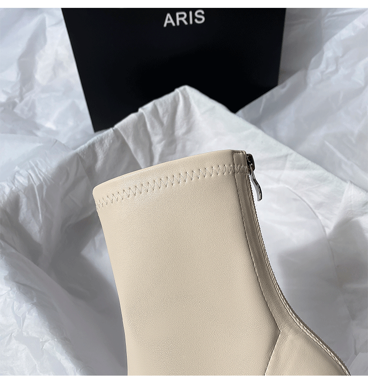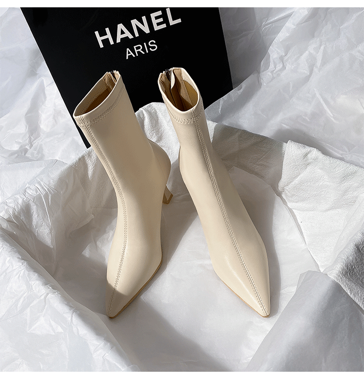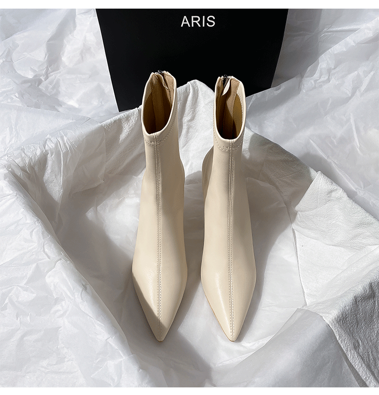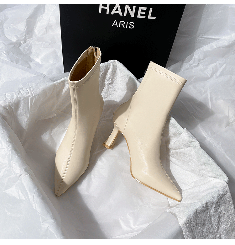 베이지 발목 부츠 여성 하이힐 가을 겨울 2024 새로운 프렌치 얇은 힐 백 지퍼 베어 부츠 포인팅 스트레치 얇은 부츠