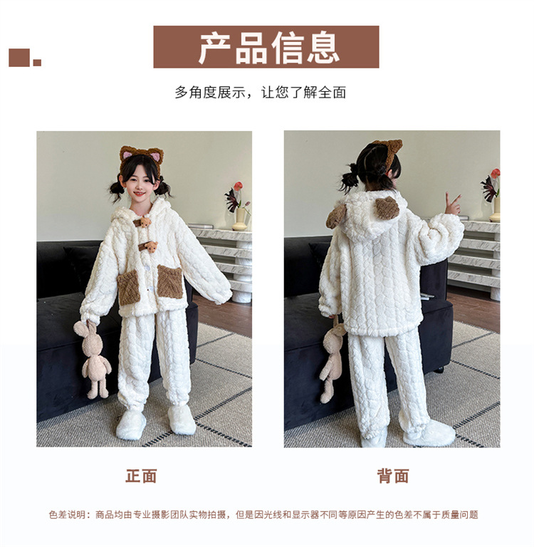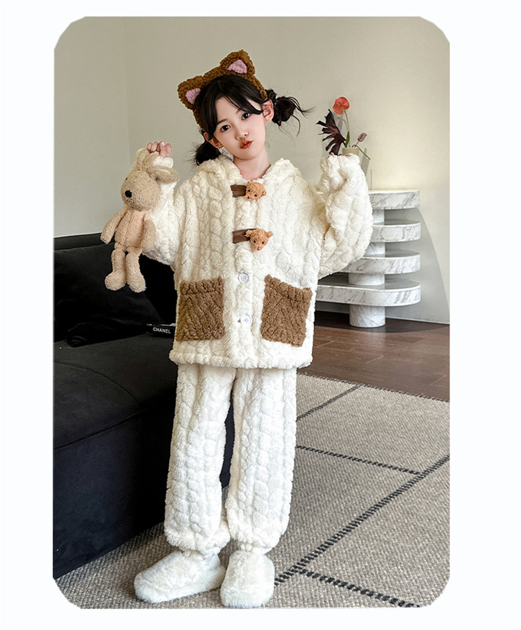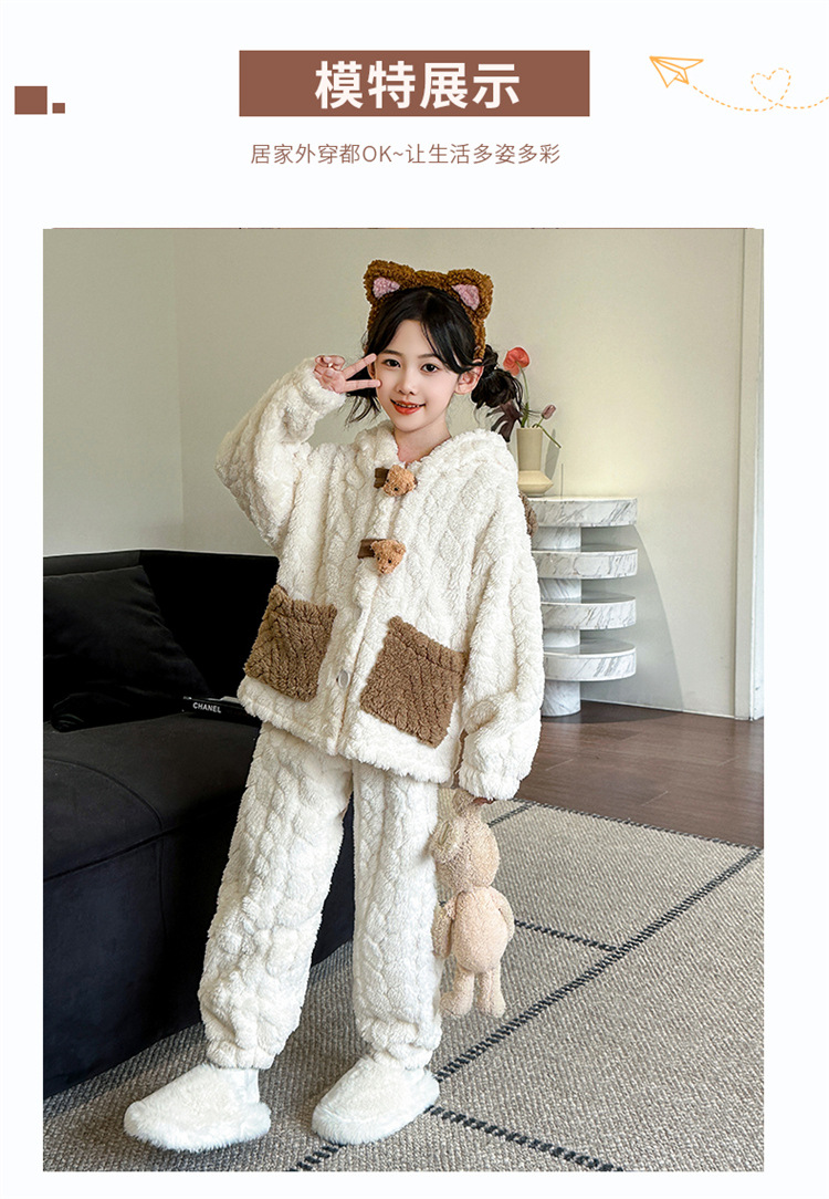 소녀는 산호 양털 홈 옷을 입고 세트 2024 겨울 새로운 유행 서양 스타일 귀여운 만화 잠옷 중 큰 어린이스토어 가기