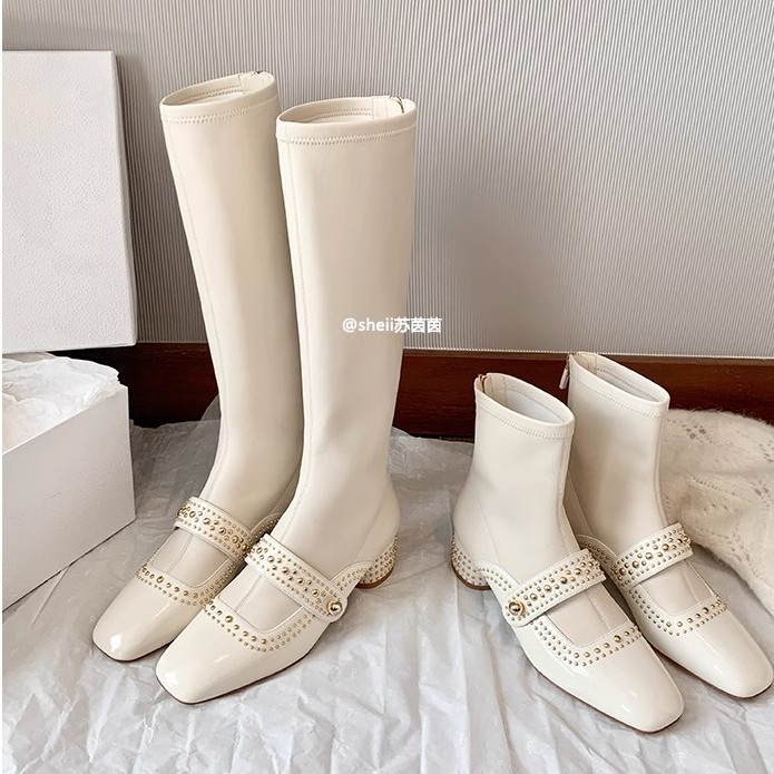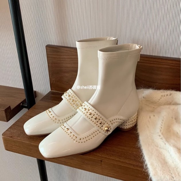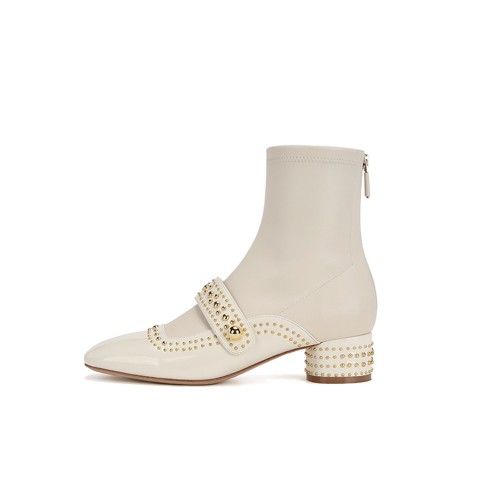 포도 엄마 같은 Cowhide 마틴 부츠 여성 가을 겨울 우아한 작은 광장 머리 리벳 패션 두꺼운 힐 슬림 짧은 부츠