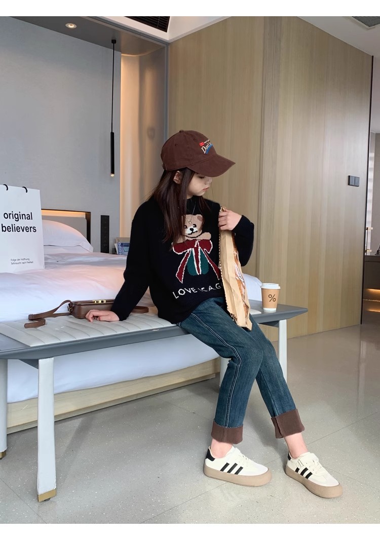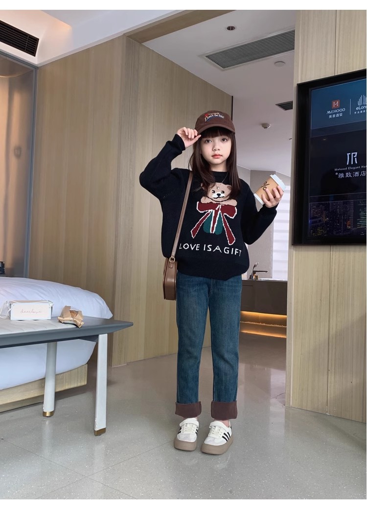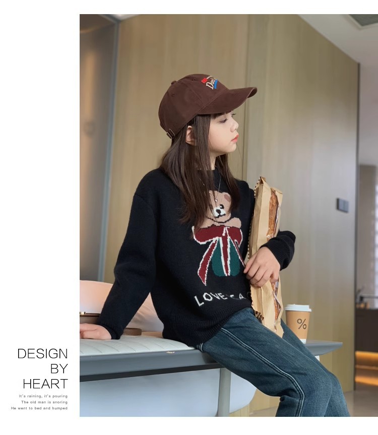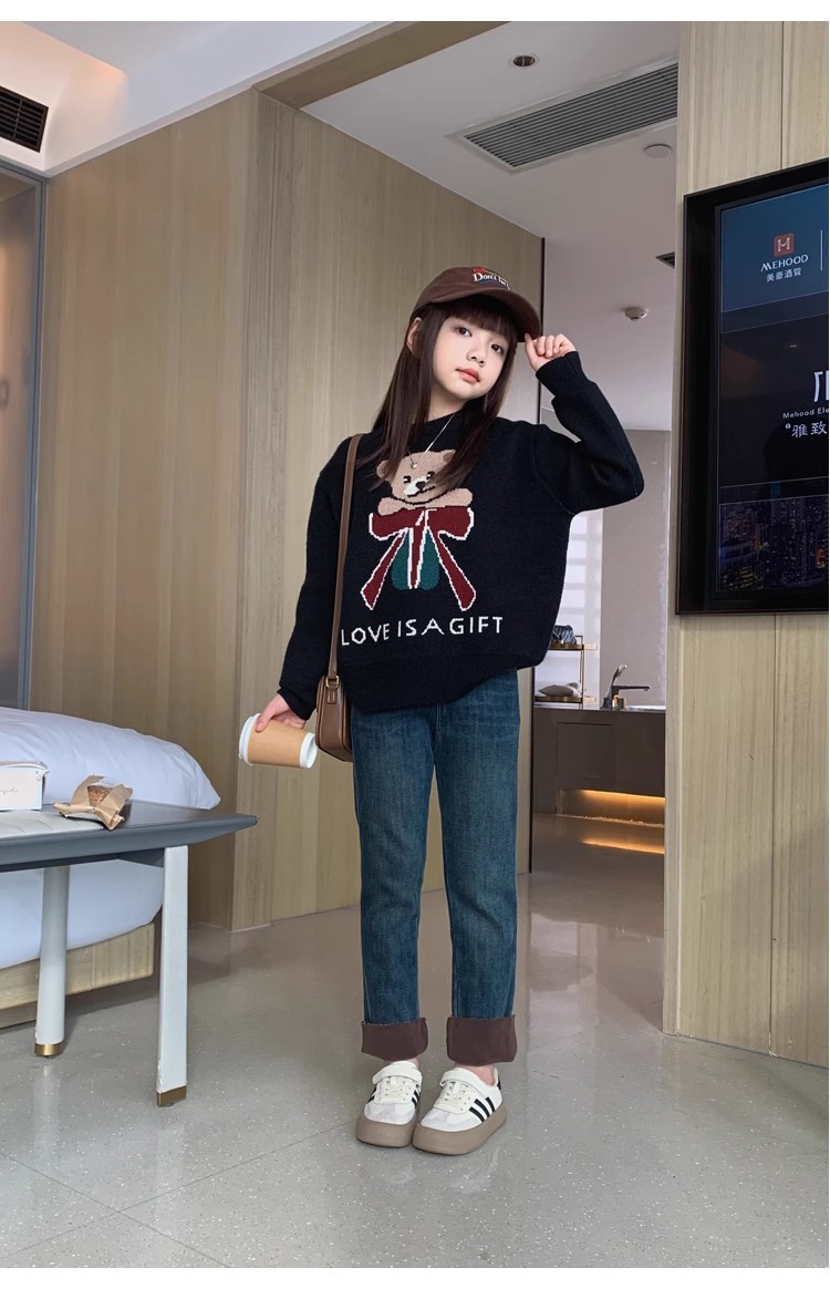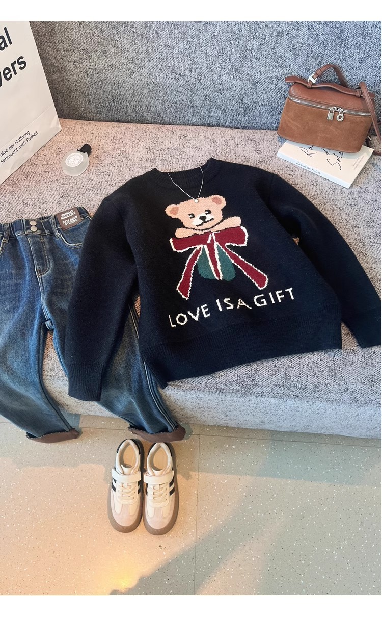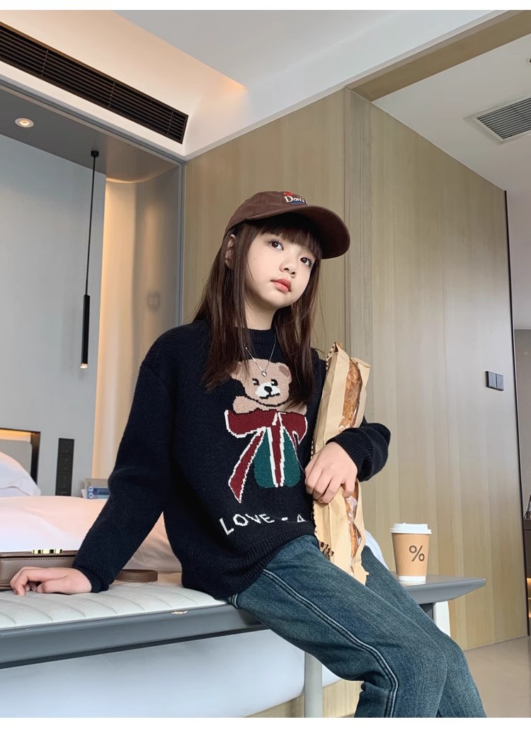 소녀 한국식 곰 스웨터 2024 겨울 새 스타일 두꺼운 따뜻한 니트 스웨터 풀오버베이스 셔츠
