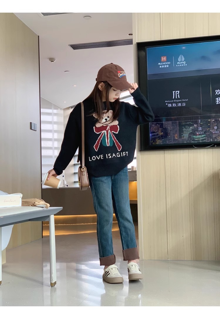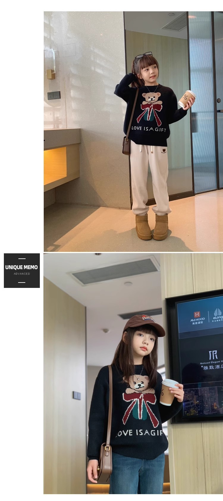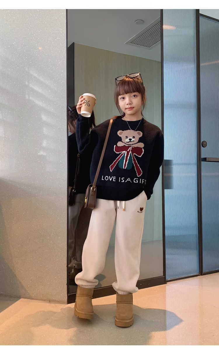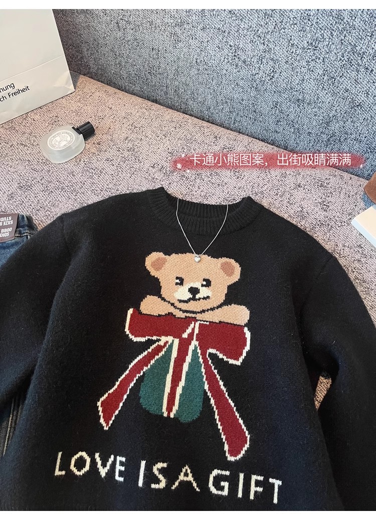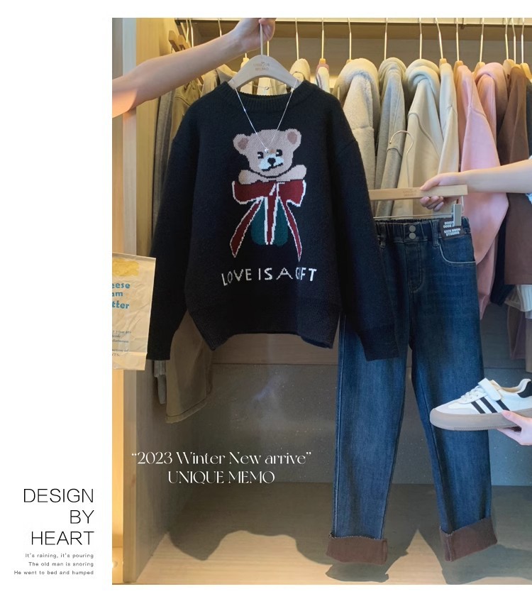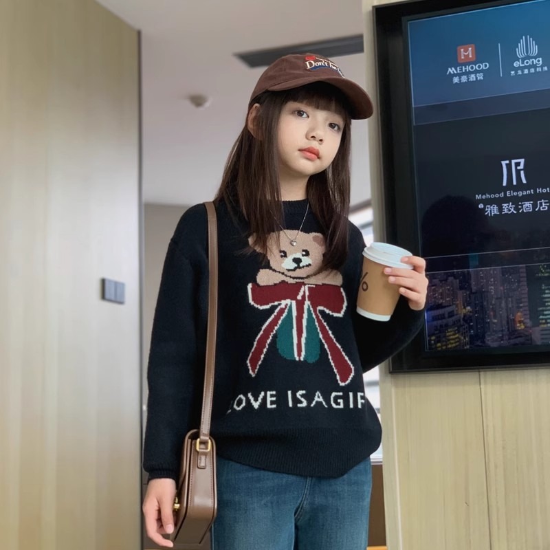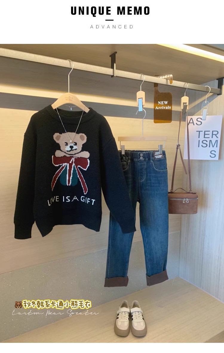 소녀 한국식 곰 스웨터 2024 겨울 새 스타일 두꺼운 따뜻한 니트 스웨터 풀오버베이스 셔츠스토어 가기