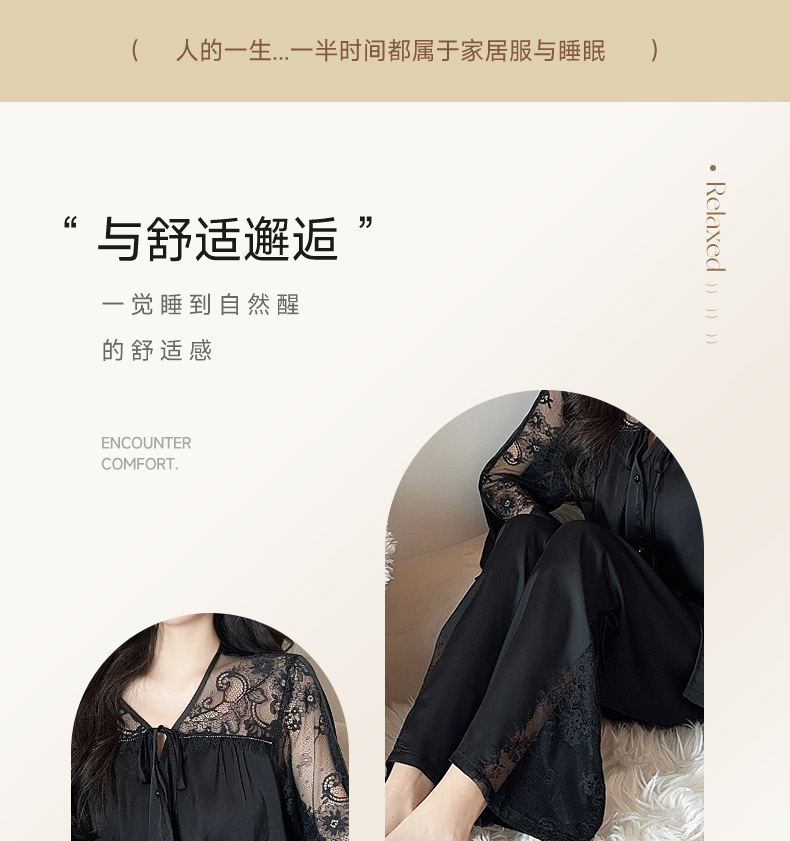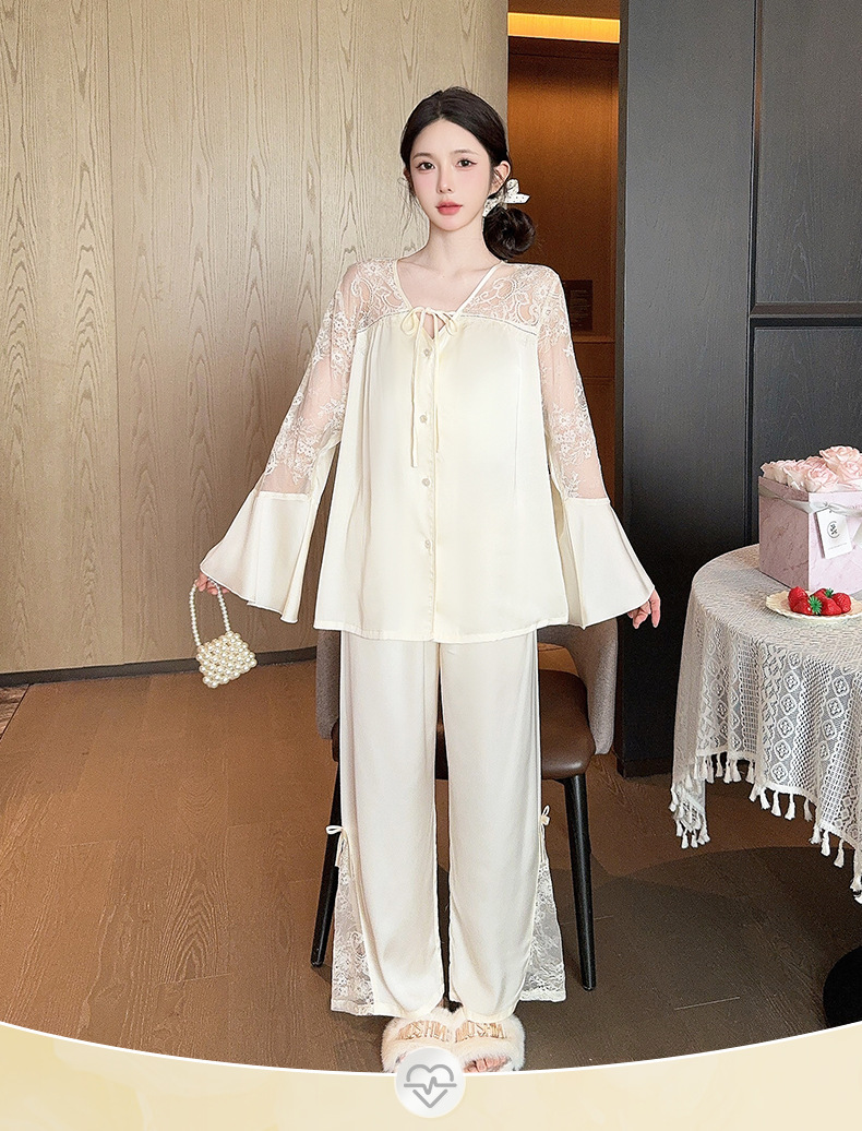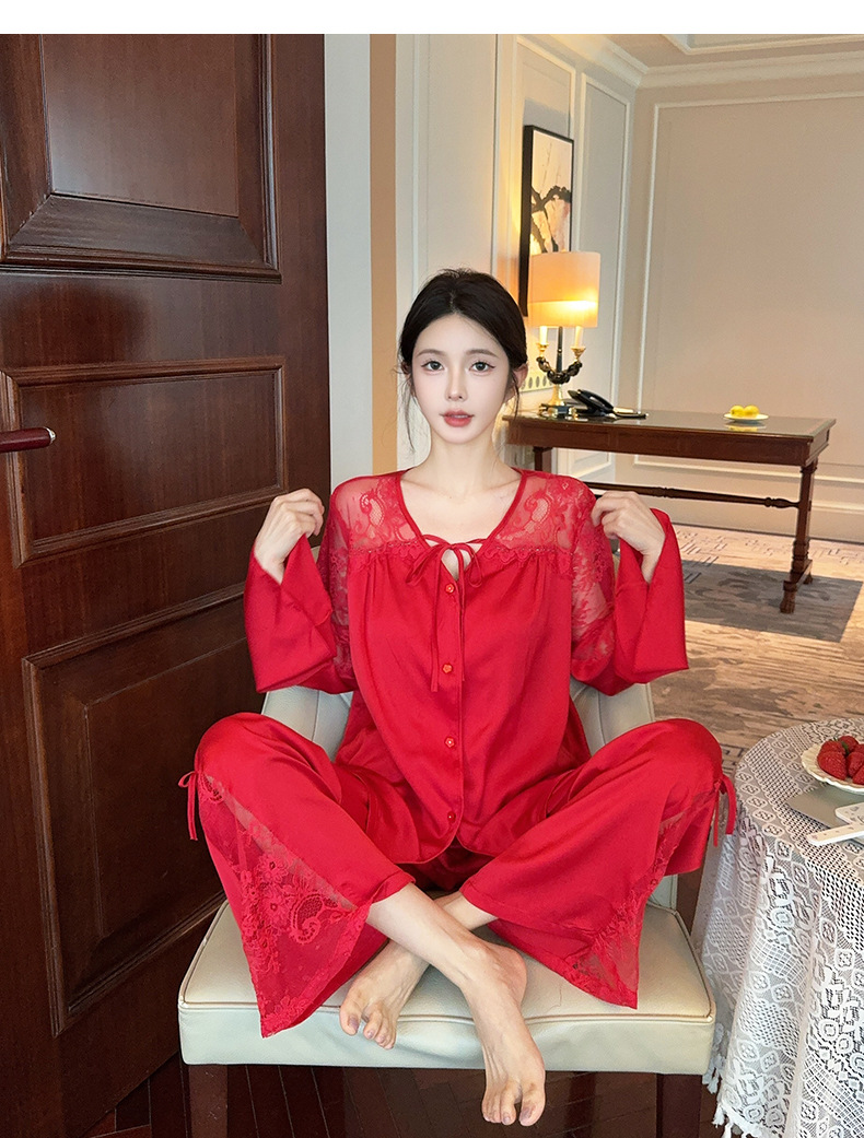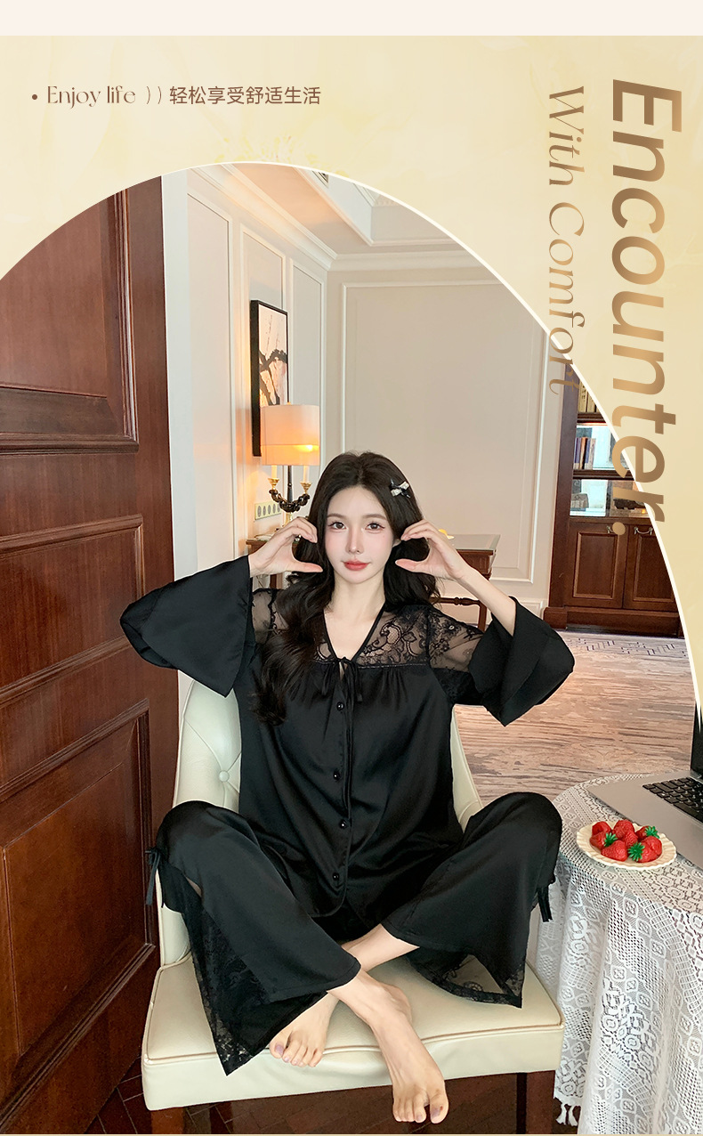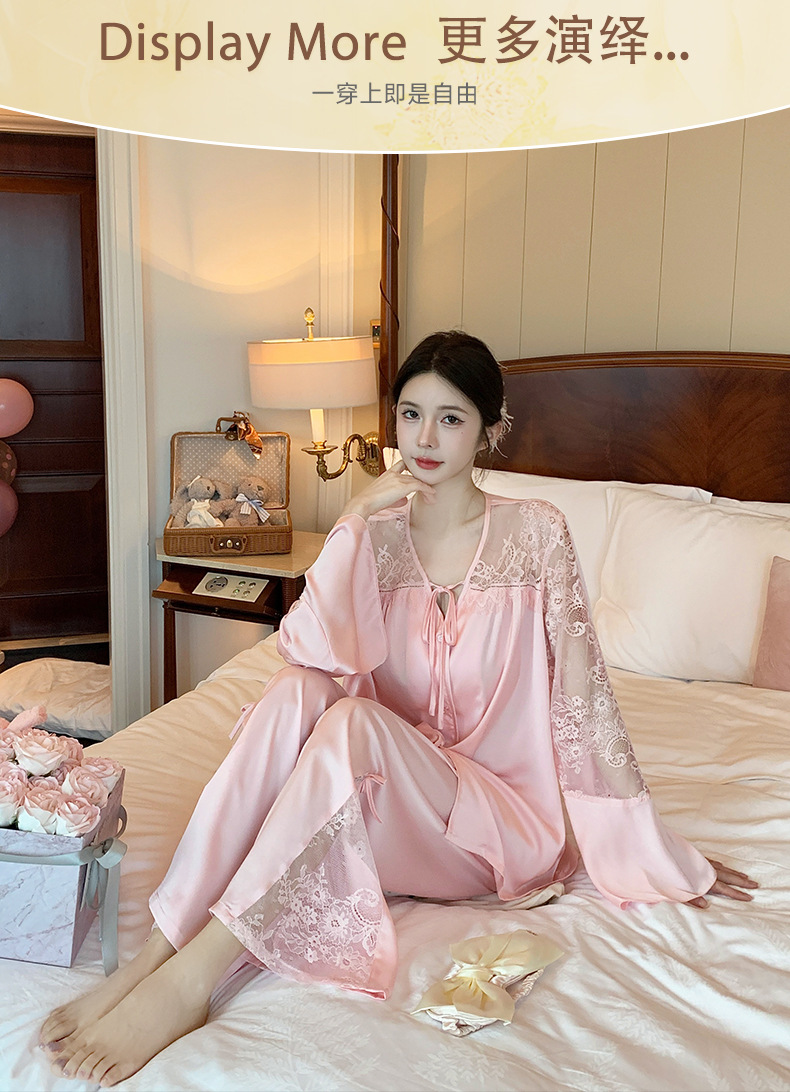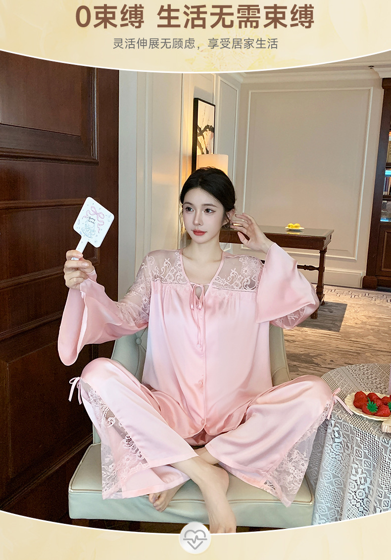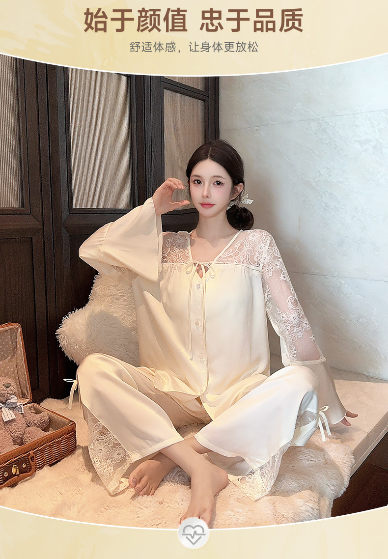 새로운 긴팔 숙녀 여름 얼음 실크 잠옷 봄과 가을 고급 프랑스 레이스 홈 의류 세트 소스 도매스토어 가기
