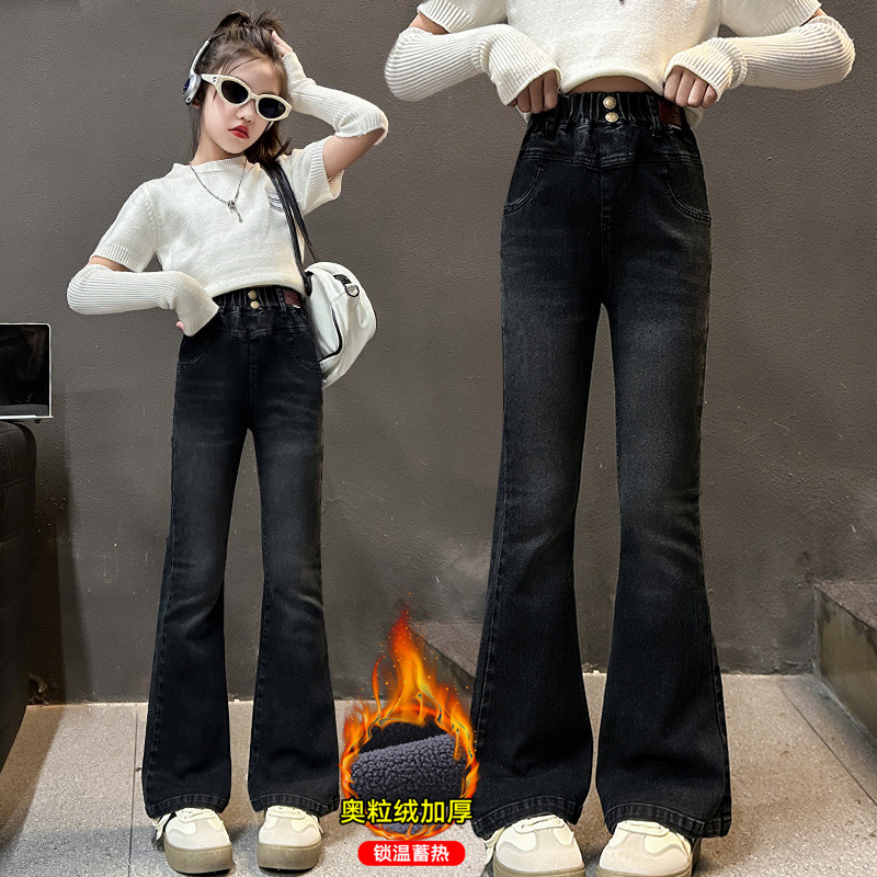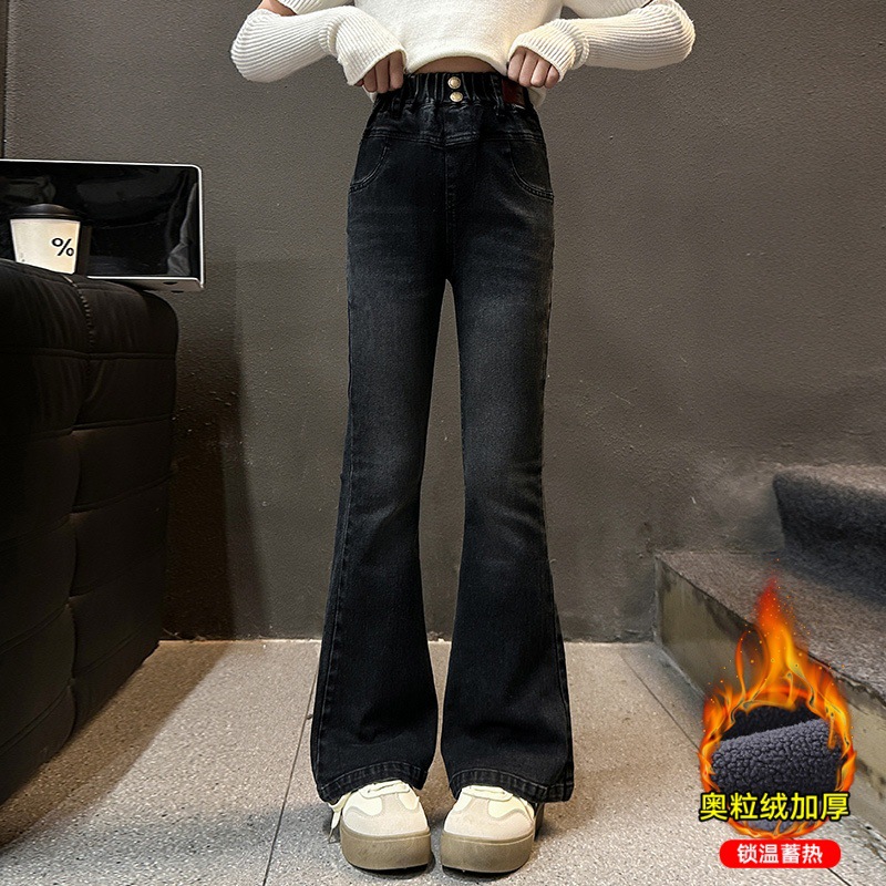 여아용 바지 가을 겨울 2025 중대형 아동용 데님 팬츠 기모 안감 두꺼운 신축성 있는 한국 스타일 라벨 장식 나팔바지 긴바지 트렌디스토어 가기