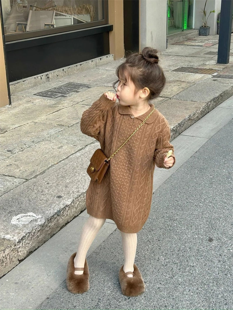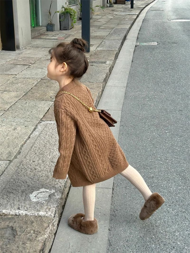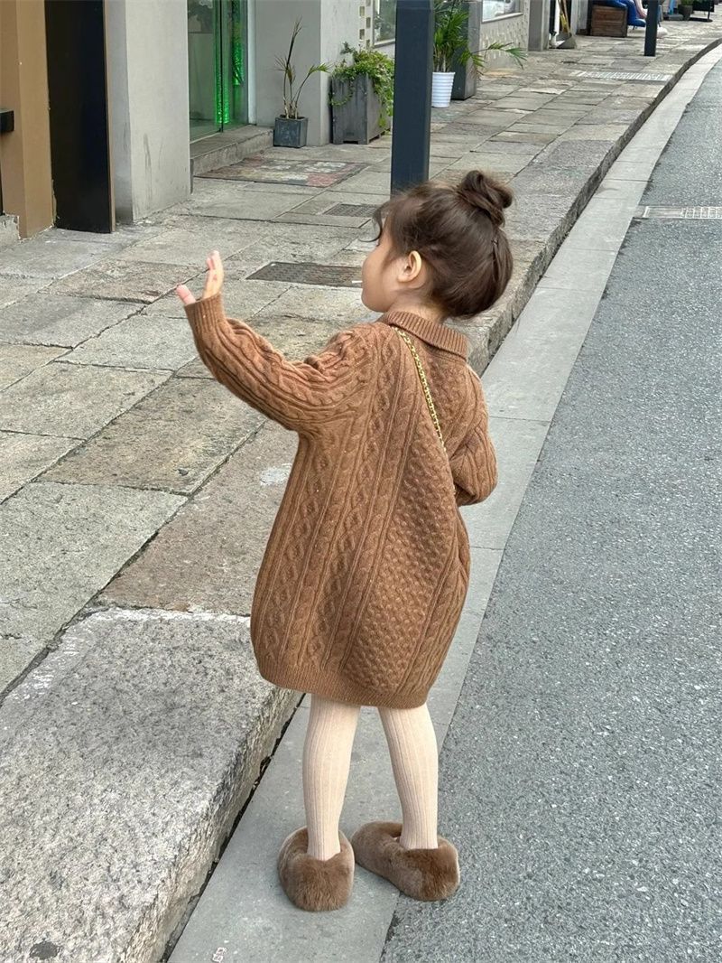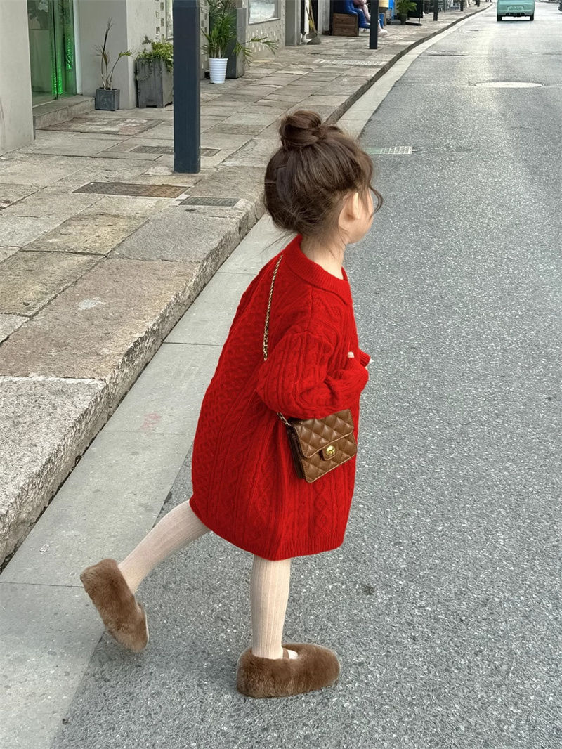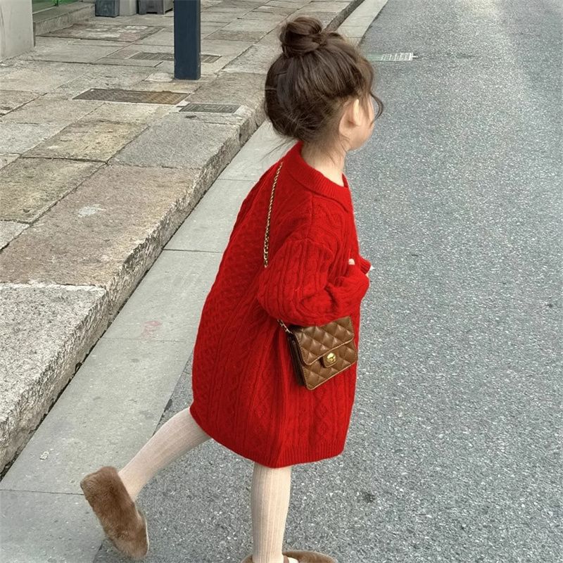 신상품 2025 여아용 레드 니트 스웨터 드레스 가을 겨울 여아용 스타일리시한 중간 길이 꼬임 스웨터 드레스스토어 가기