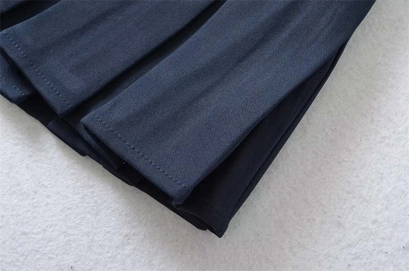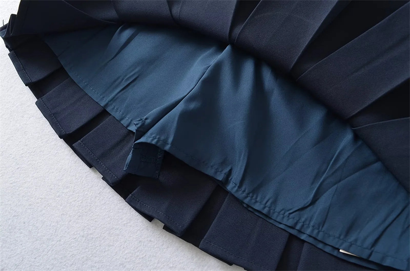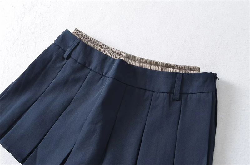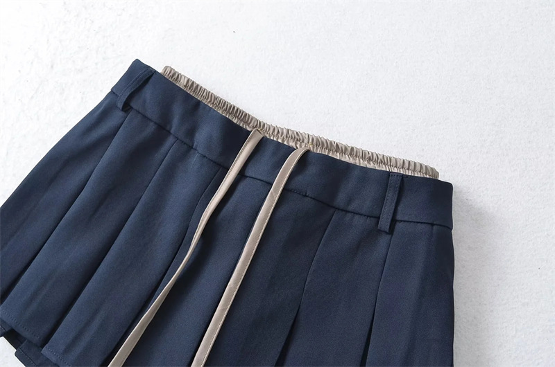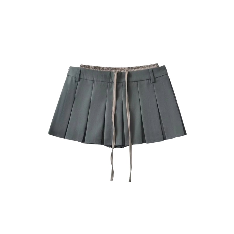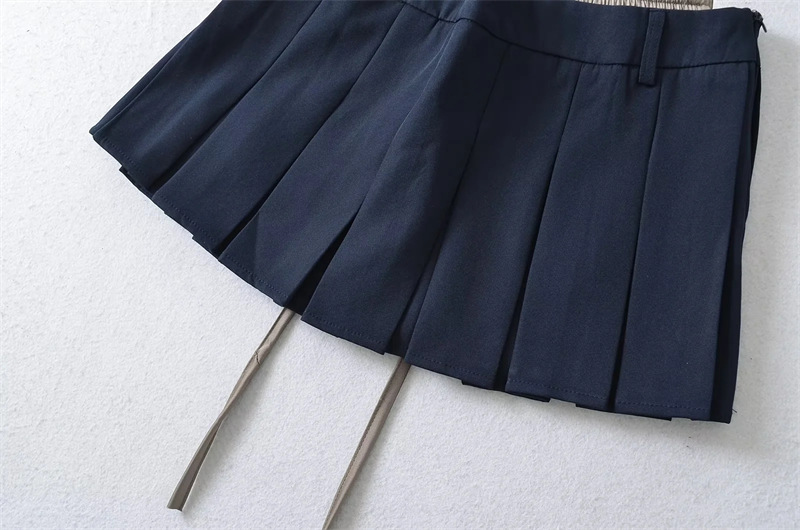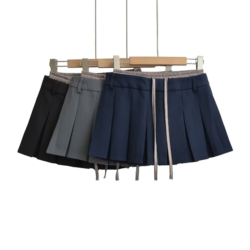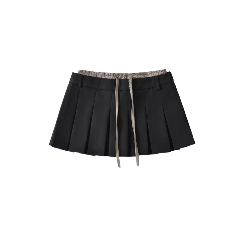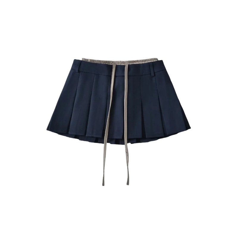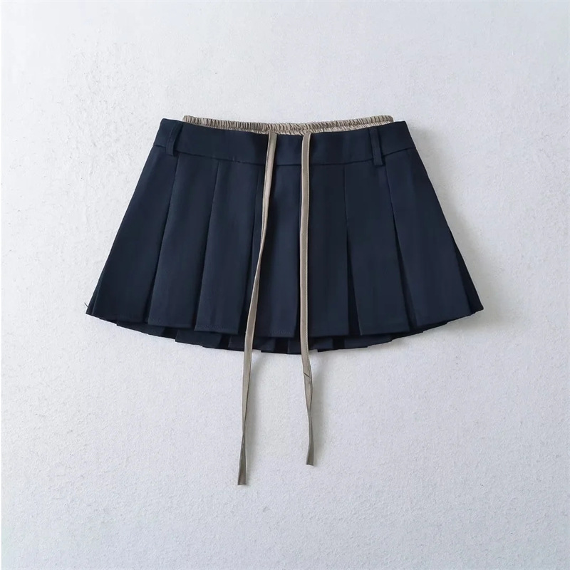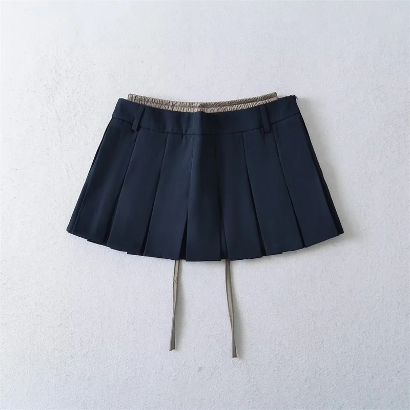 디자인 센스 낮은 허리 끈 스티칭 대조 색상 주름 치마 여성 대학 스타일 뜨거운 소녀 눈부심 방지 A 라인 미니 스커트