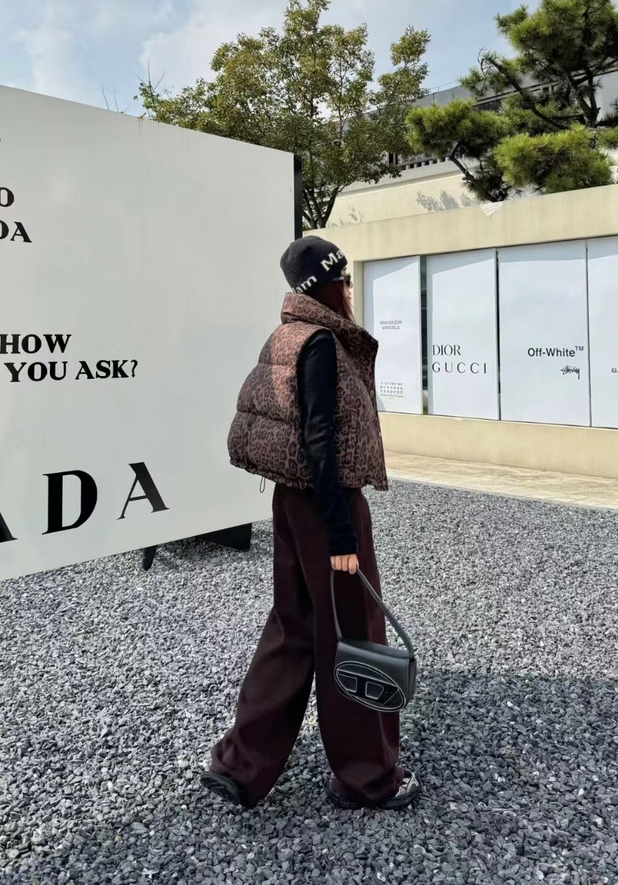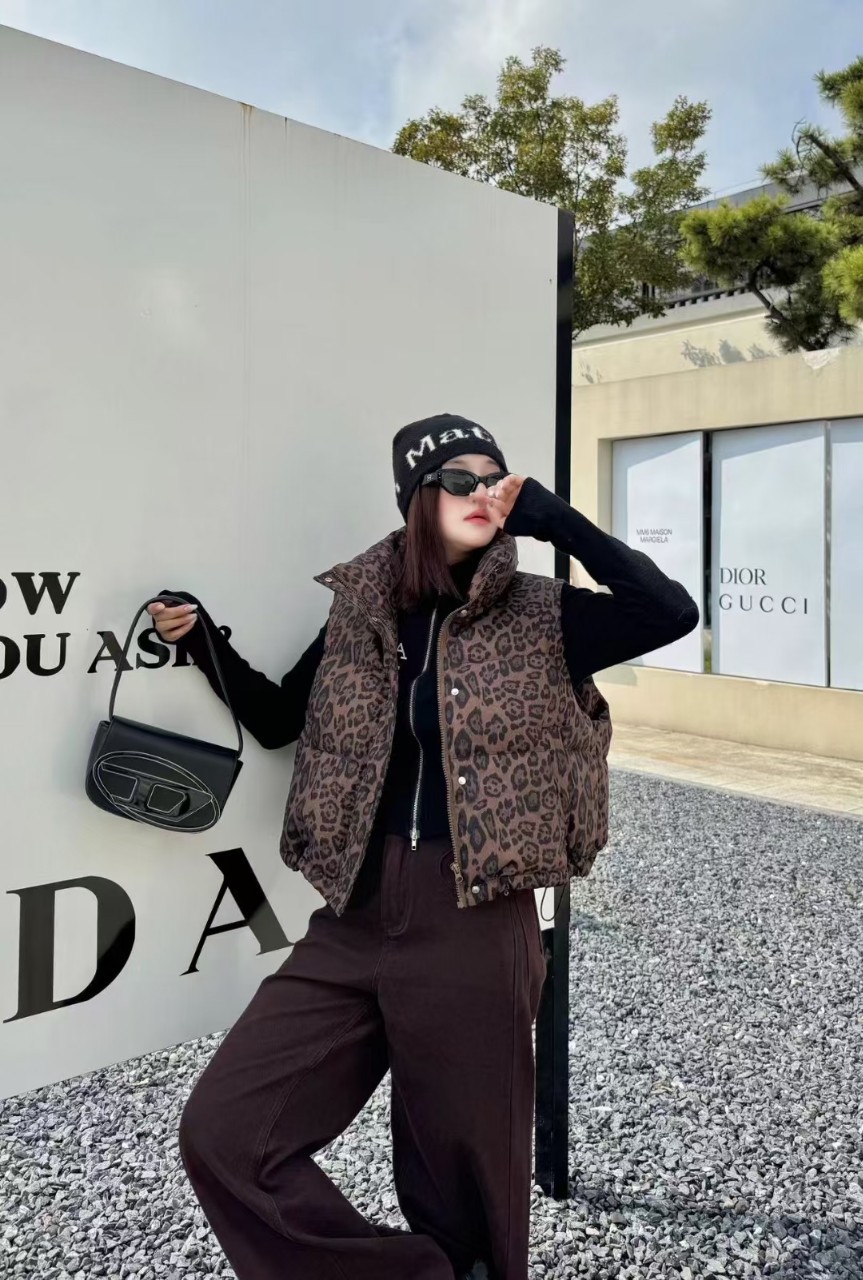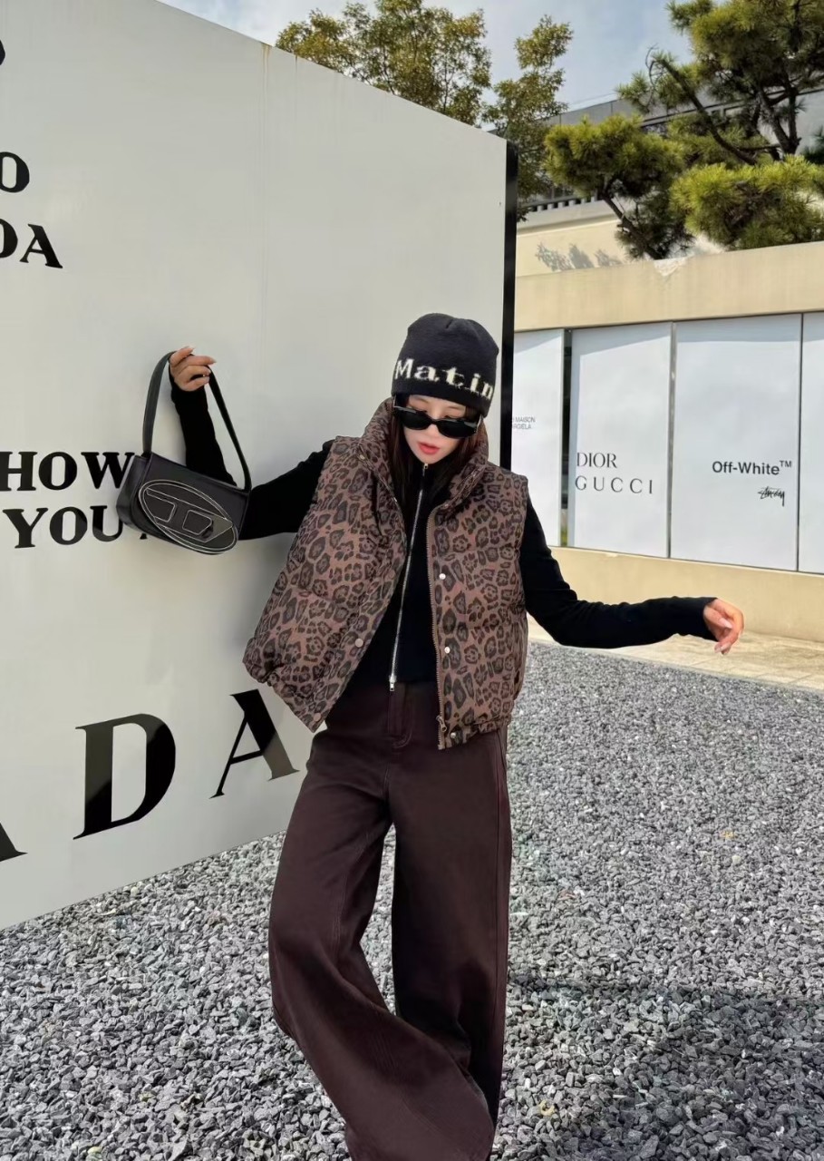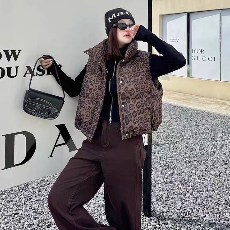 호피무늬 스탠드 칼라 숏 다운 조끼 여성용 가을 겨울 2025 신상 디자인 감성적인 두꺼운 조끼스토어 가기
