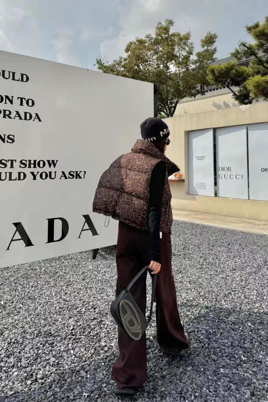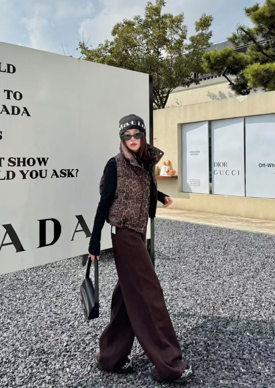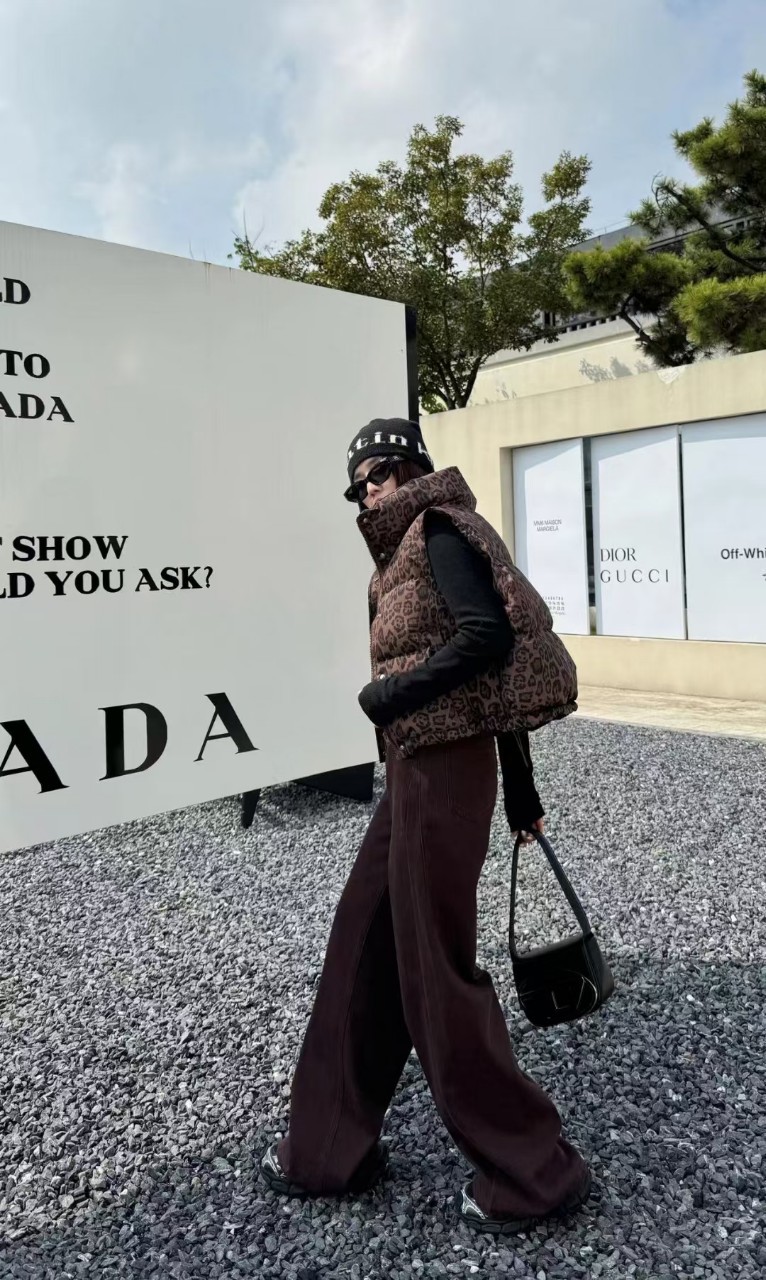 호피무늬 스탠드 칼라 숏 다운 조끼 여성용 가을 겨울 2025 신상 디자인 감성적인 두꺼운 조끼스토어 가기