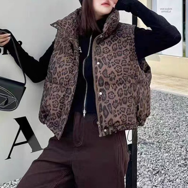 호피무늬 스탠드 칼라 숏 다운 조끼 여성용 가을 겨울 2025 신상 디자인 감성적인 두꺼운 조끼