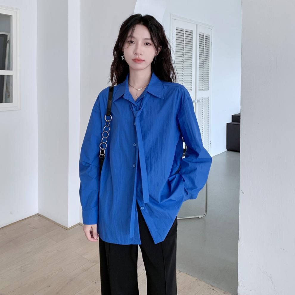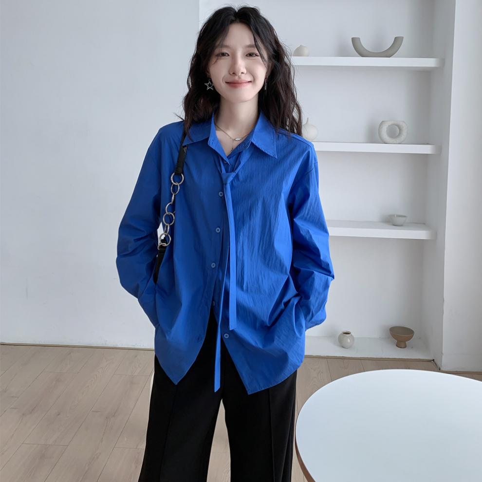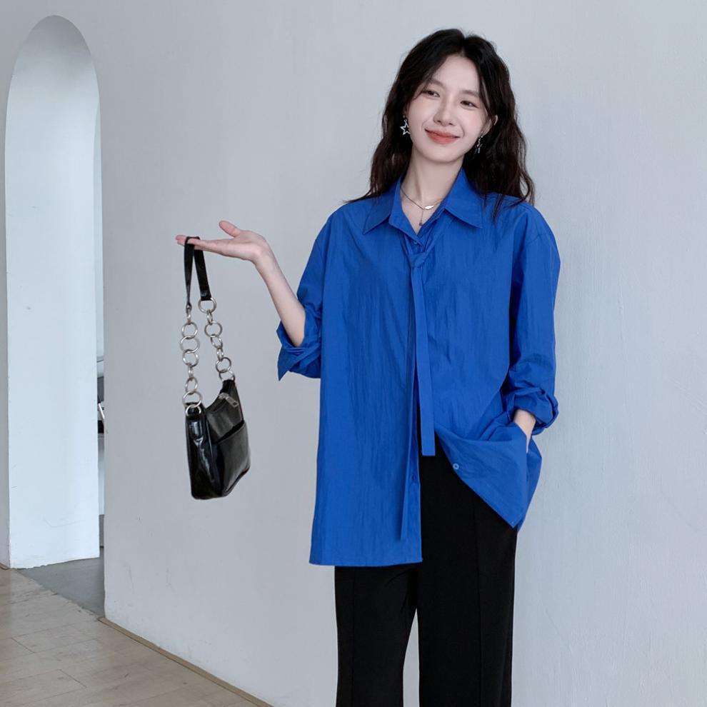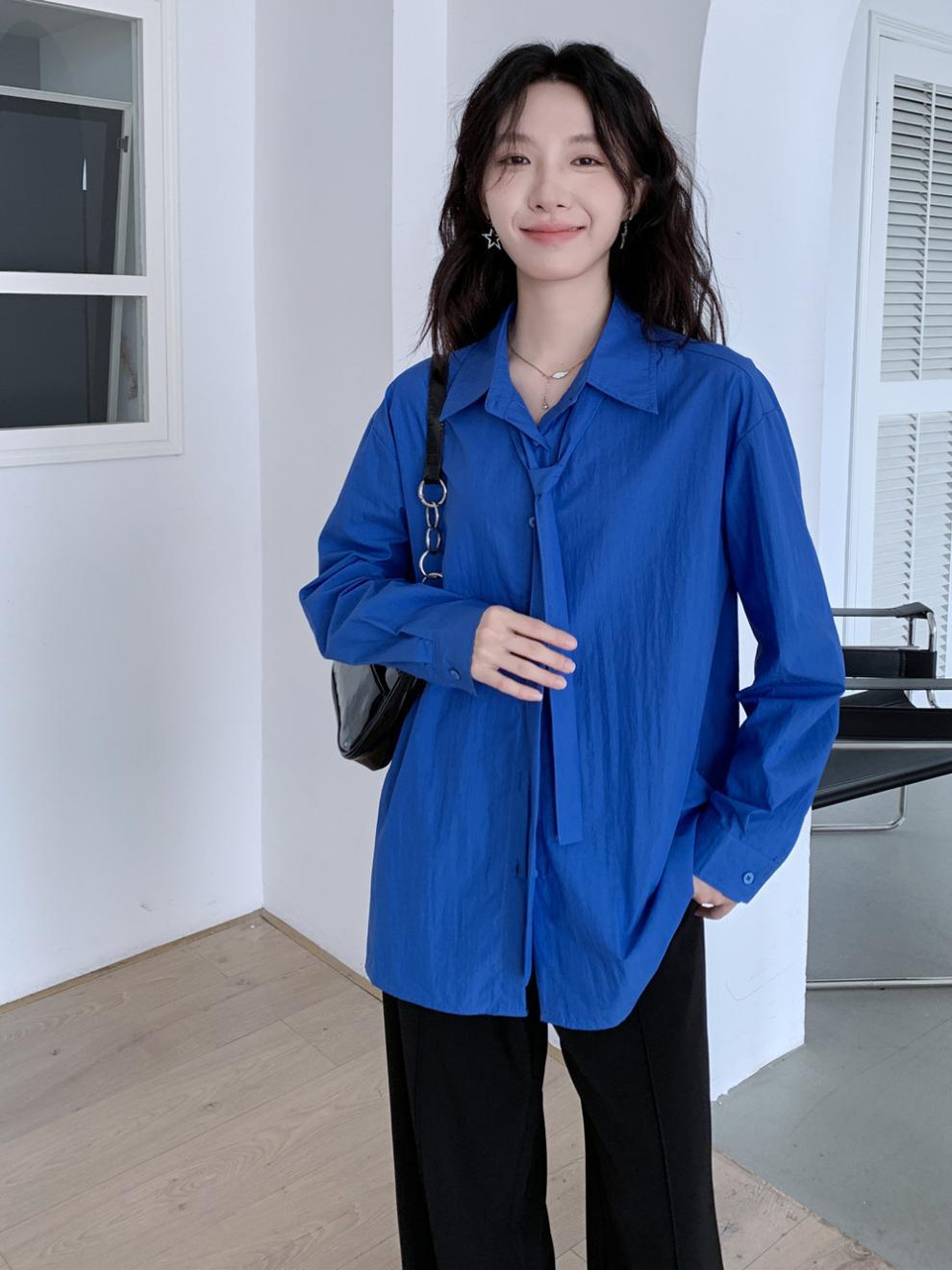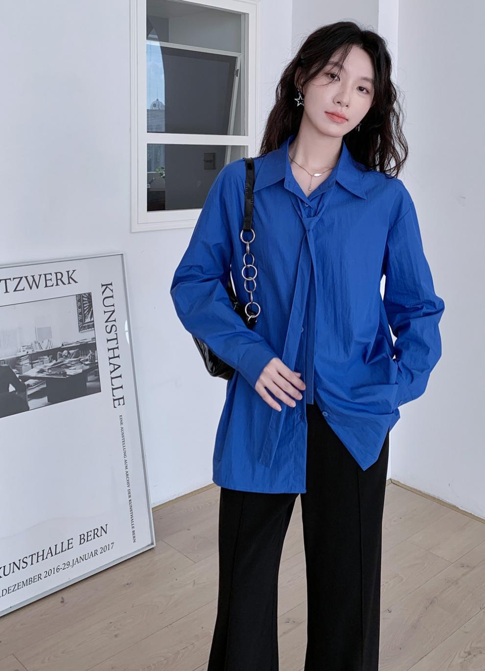 진짜 촬영 게으른 스타일 리본 디자인 클라인 블루 셔츠 여성의 2024 가을 새로운 빈티지 텍스처 탑스토어 가기