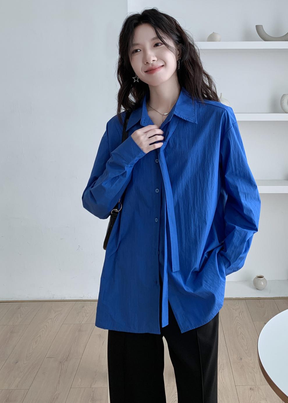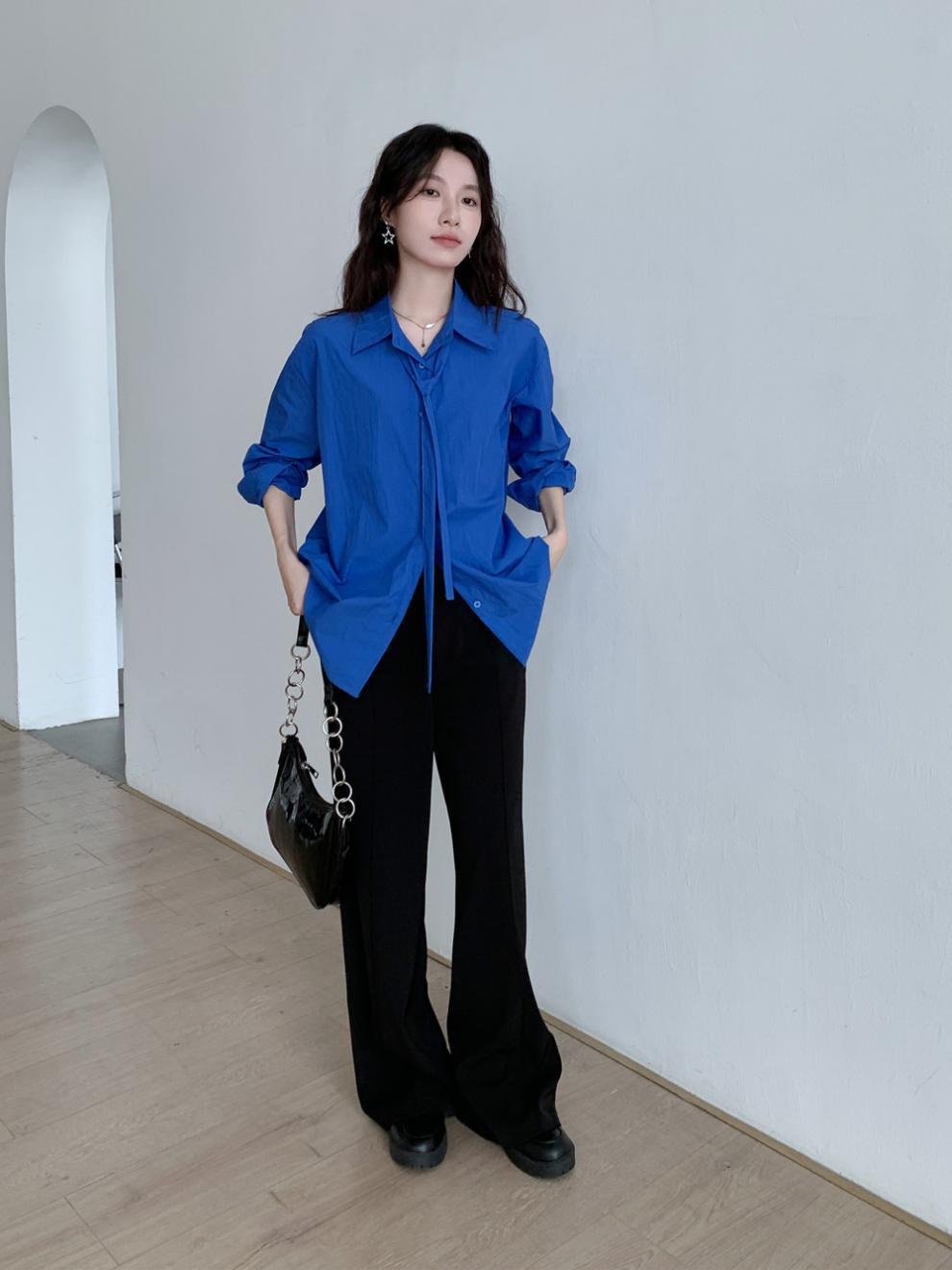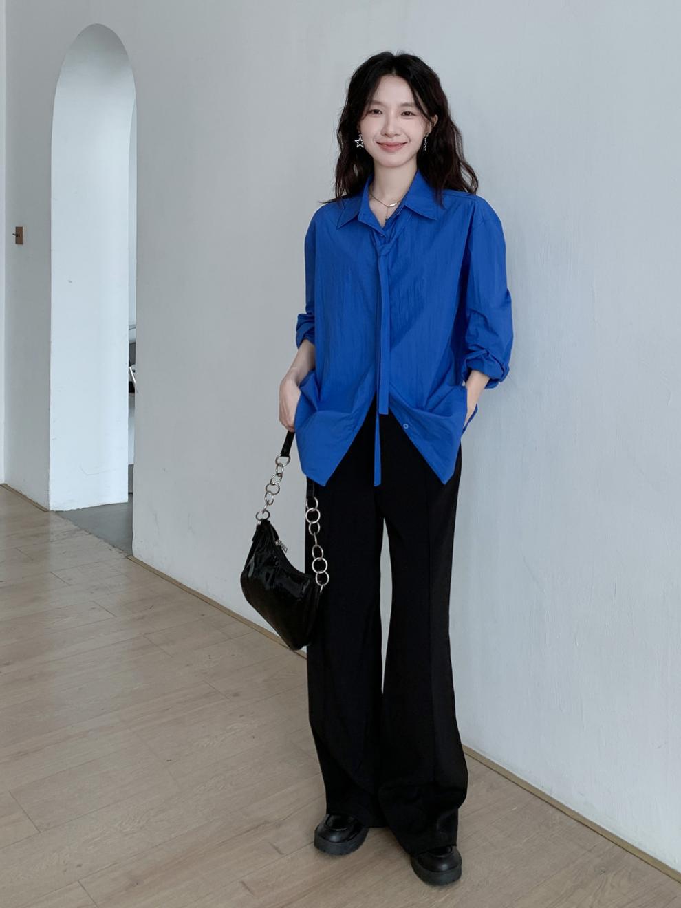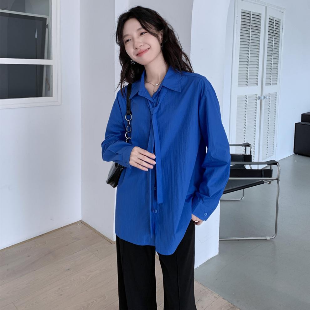 진짜 촬영 게으른 스타일 리본 디자인 클라인 블루 셔츠 여성의 2024 가을 새로운 빈티지 텍스처 탑스토어 가기