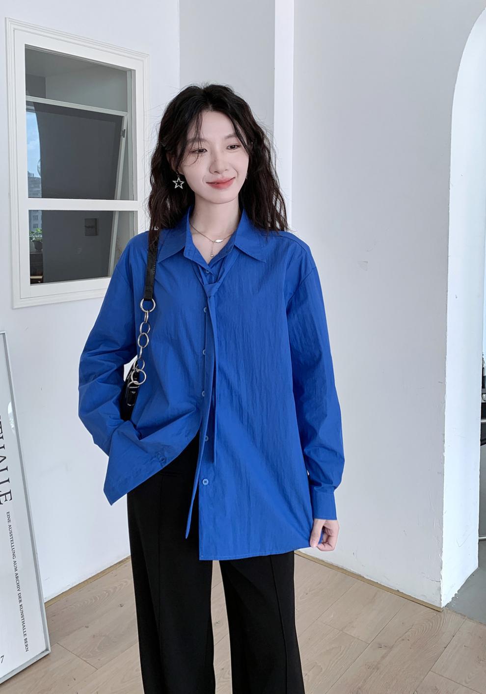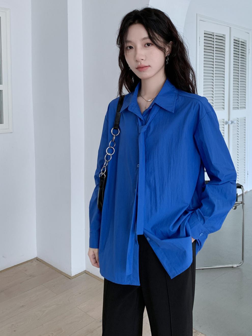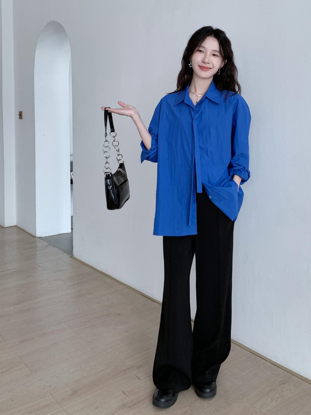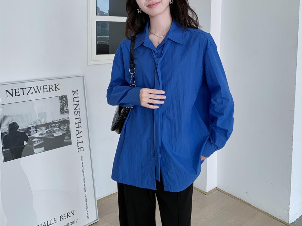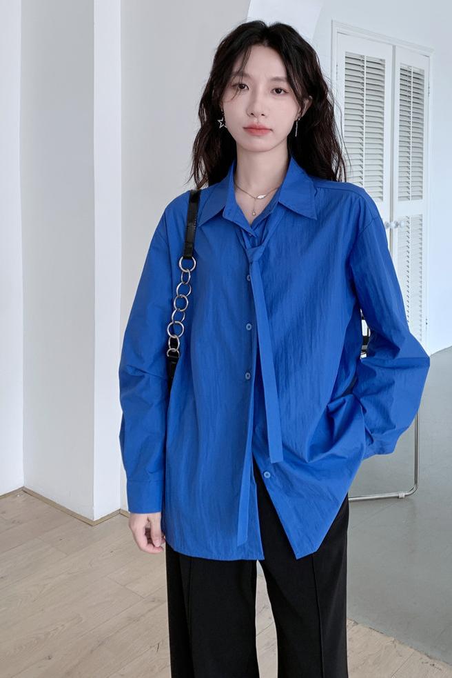 진짜 촬영 게으른 스타일 리본 디자인 클라인 블루 셔츠 여성의 2024 가을 새로운 빈티지 텍스처 탑스토어 가기