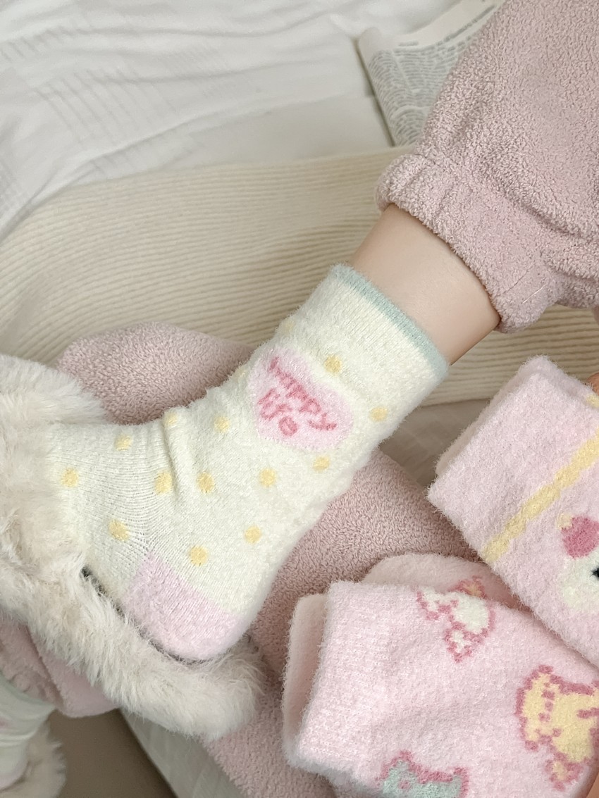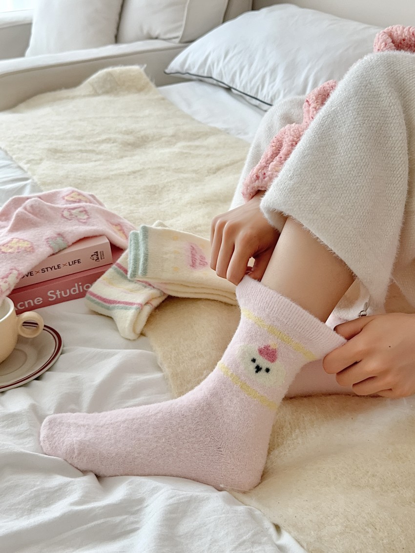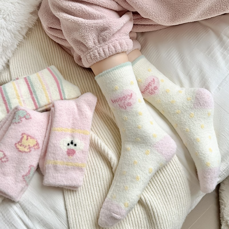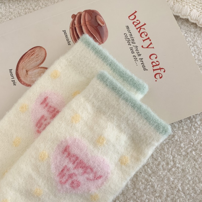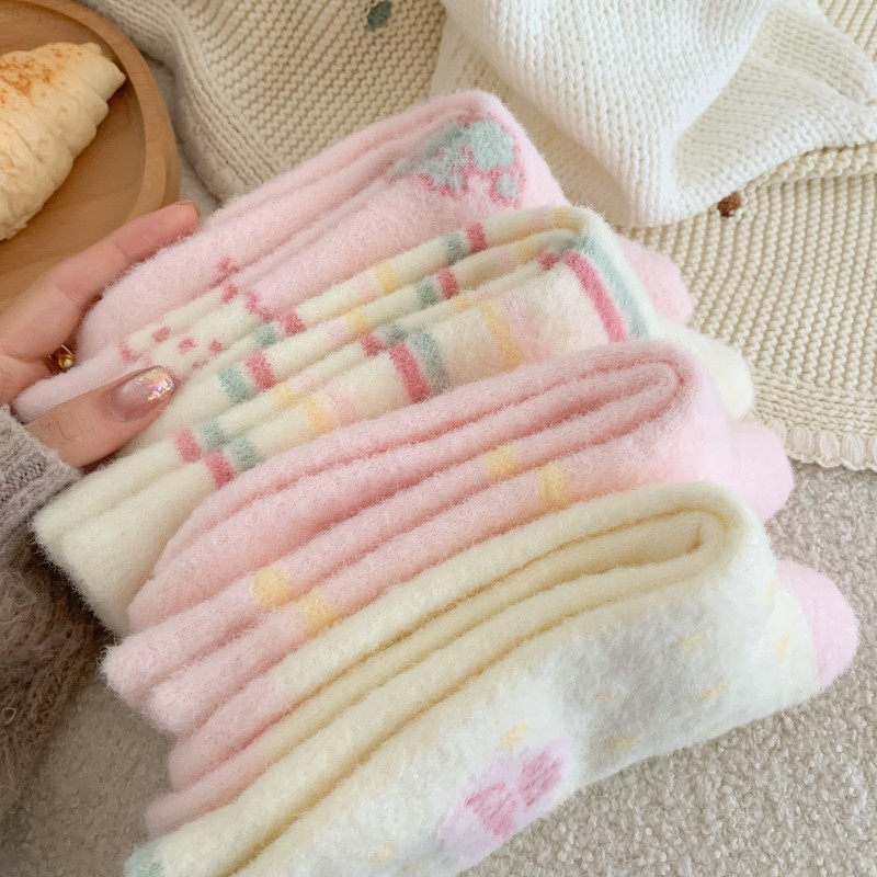 따뜻한 양말 여성용 중간 길이 양말 가을 겨울용 플리스 안감 두꺼운 일본식 핑크색 귀여운 줄무늬 겨울용 플리스 롱 양말