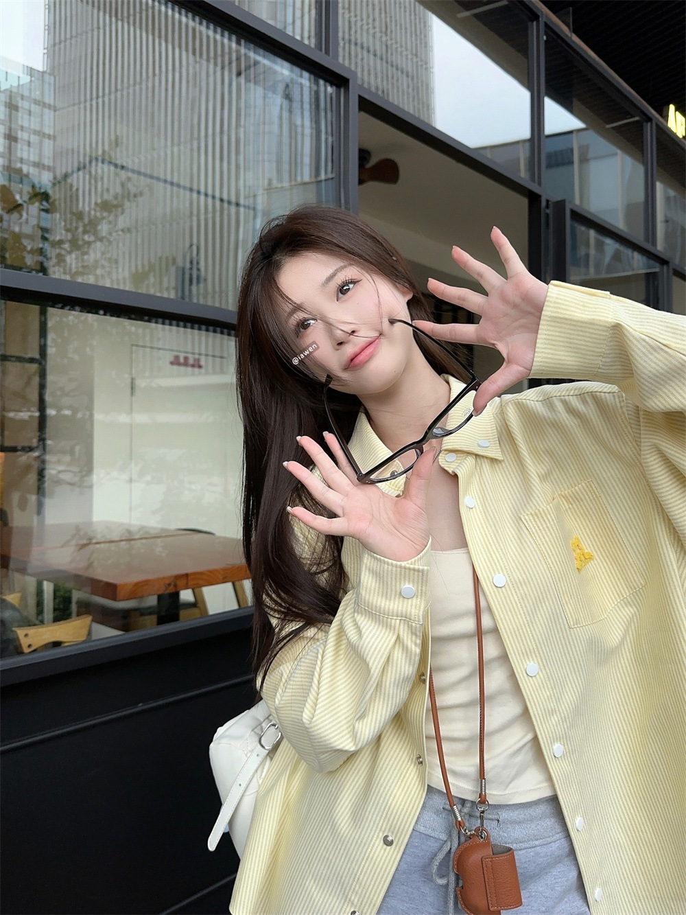 아메리칸 스타일 레트로 옐로우 스트라이프 폴로 칼라 셔츠 코트 여성의 봄과 가을 느슨한 캐주얼 카디건 게으른 세련된 탑