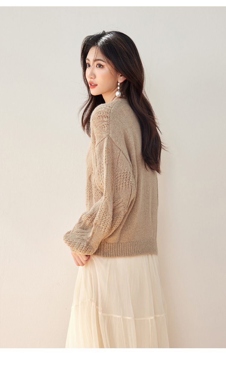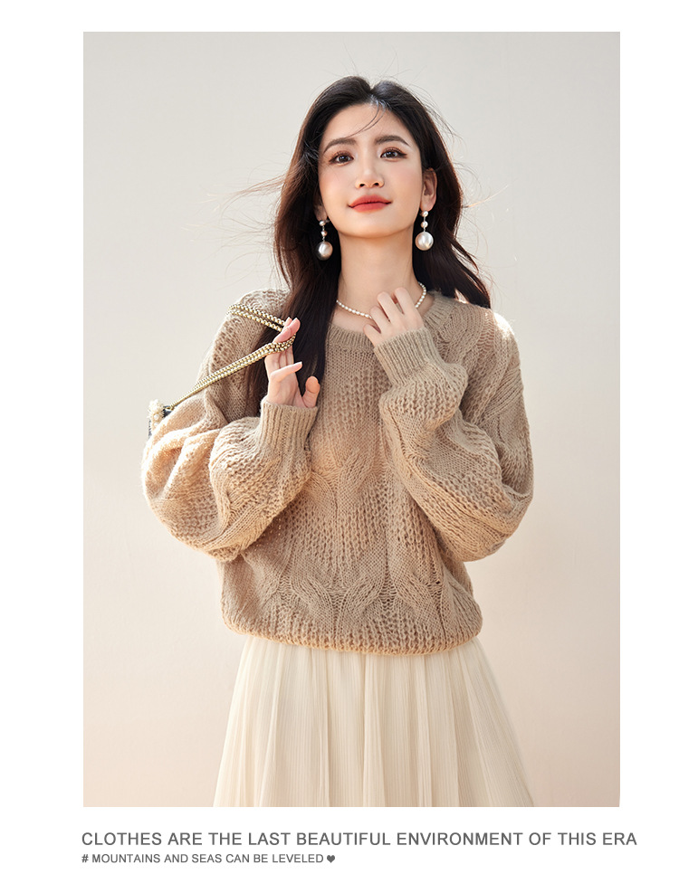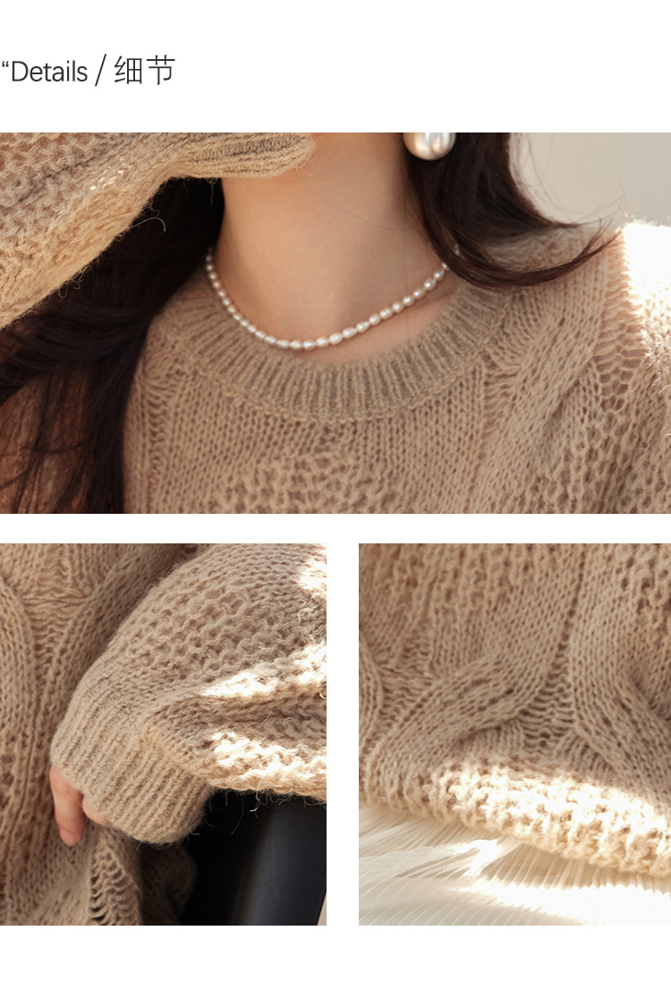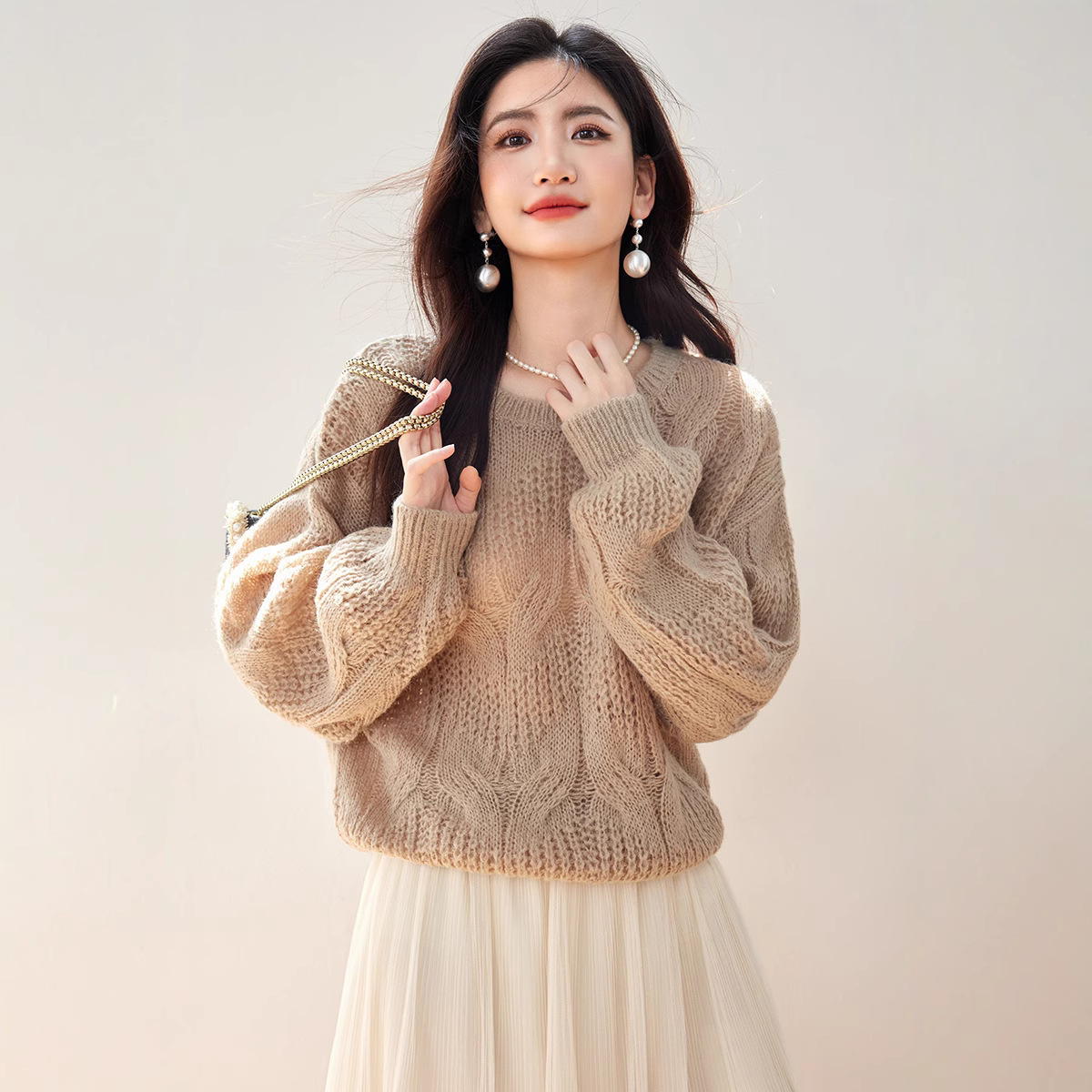 2024 년 가을과 겨울 새로운 부드러운 꼬인 니트 스웨터 어깨 디자인 빈 짧은 터틀넥 크루 넥 스웨터