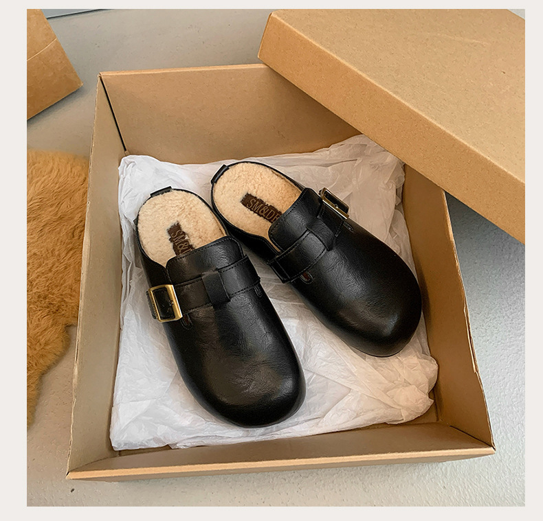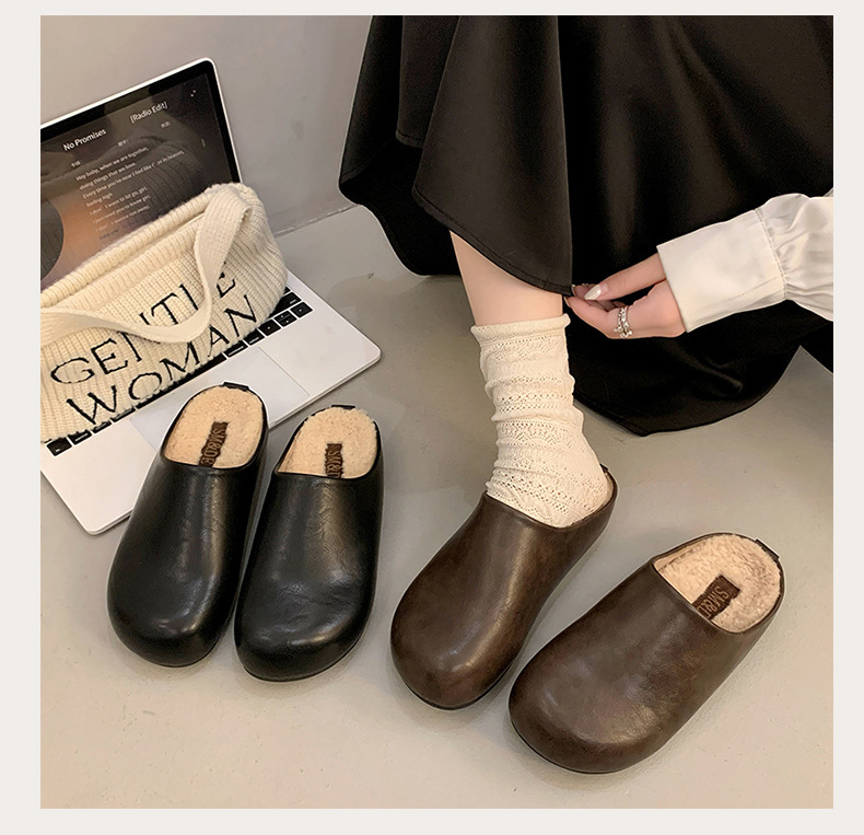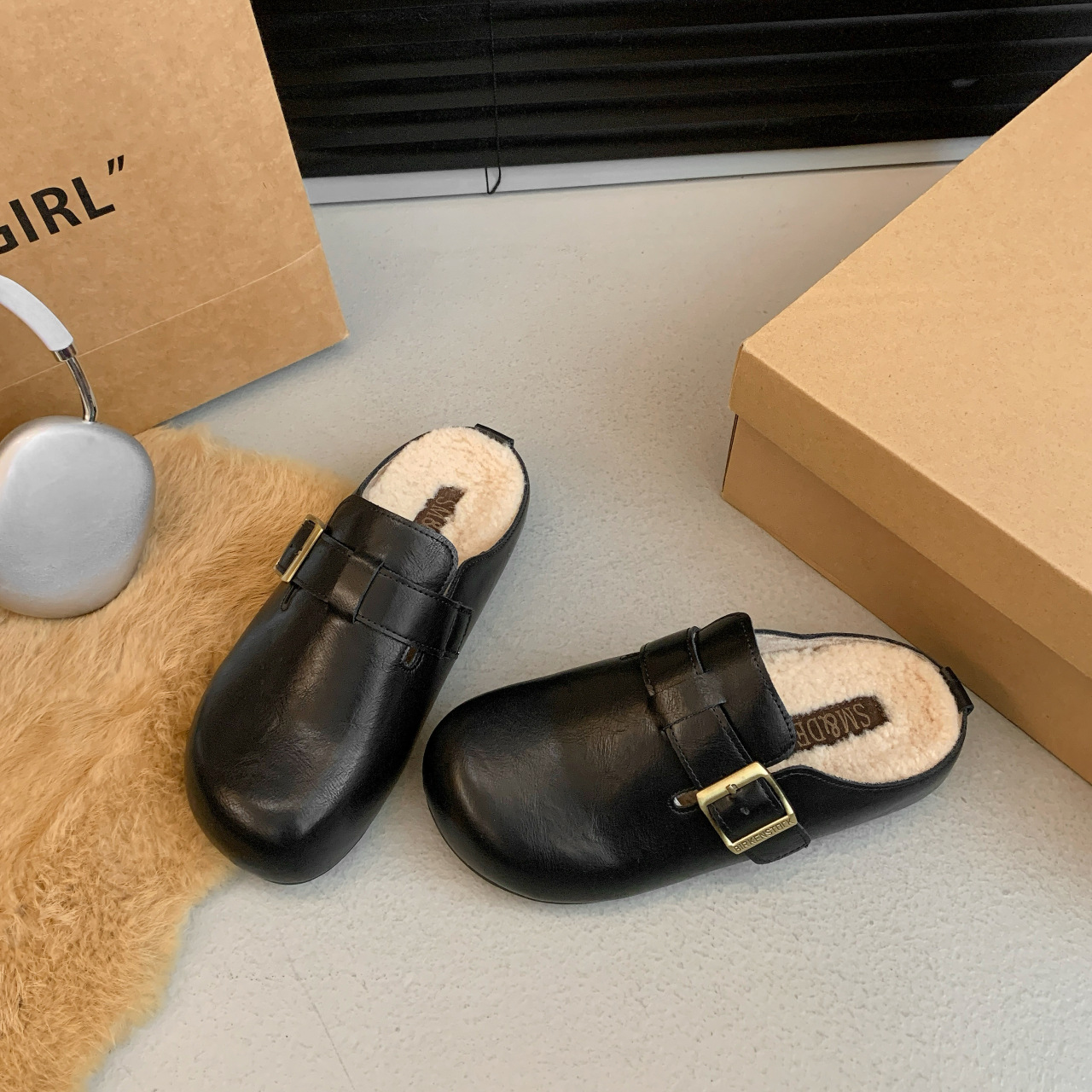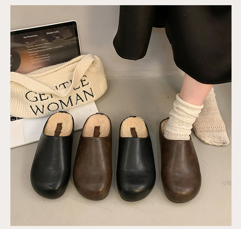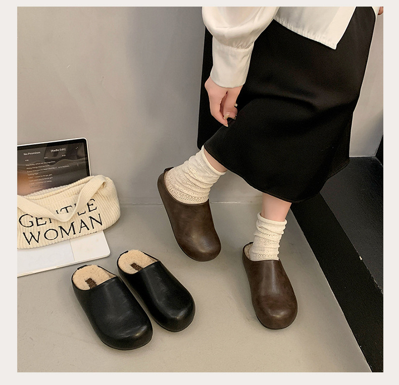 마오 마오 슬리퍼 여성 아우터 2024 새로운 가을과 겨울 플랫 바닥 임산부 게으른 바오 터 하프 슬리퍼 기모 하프 슬리퍼