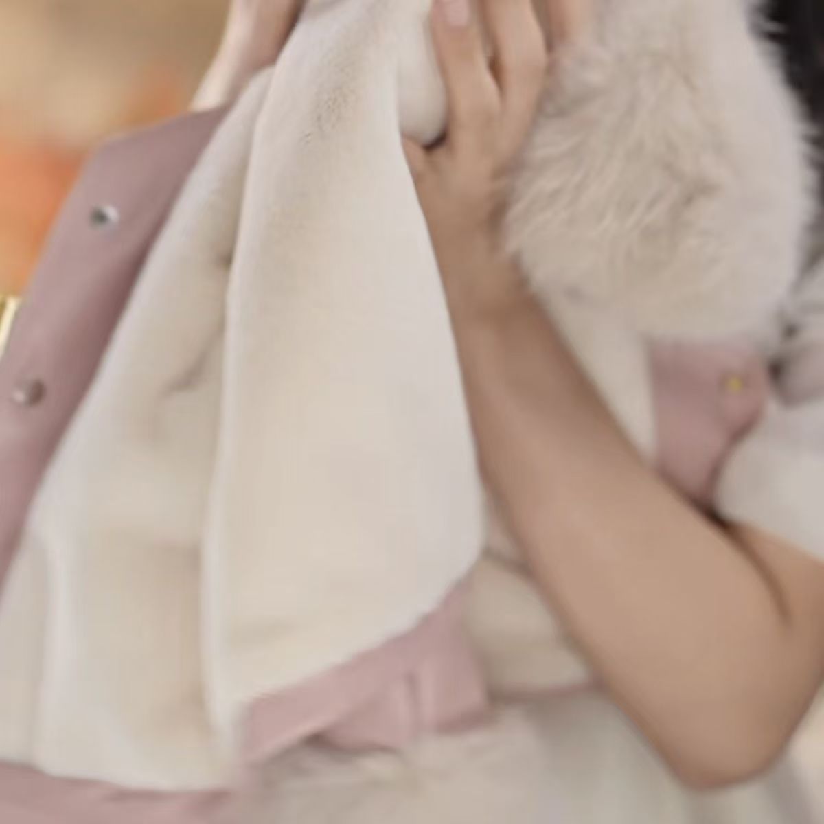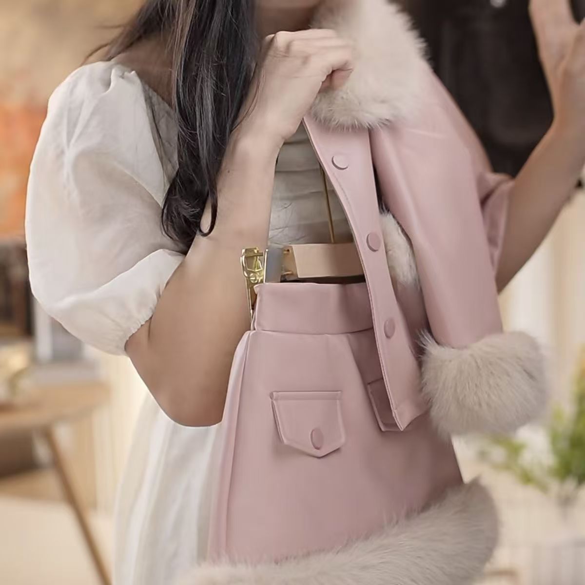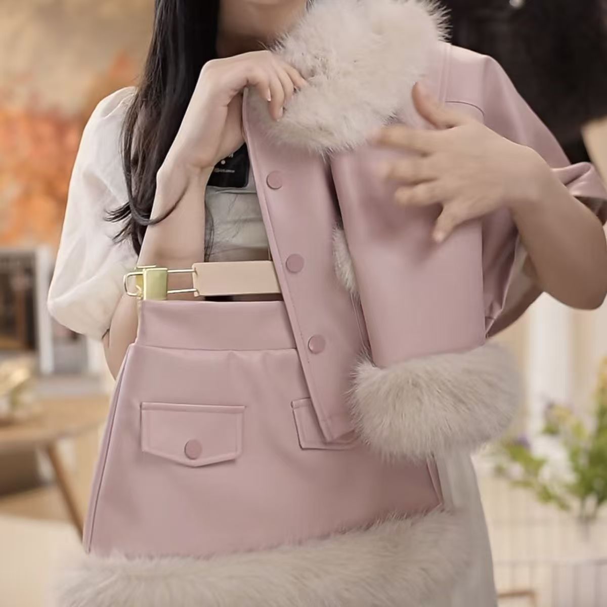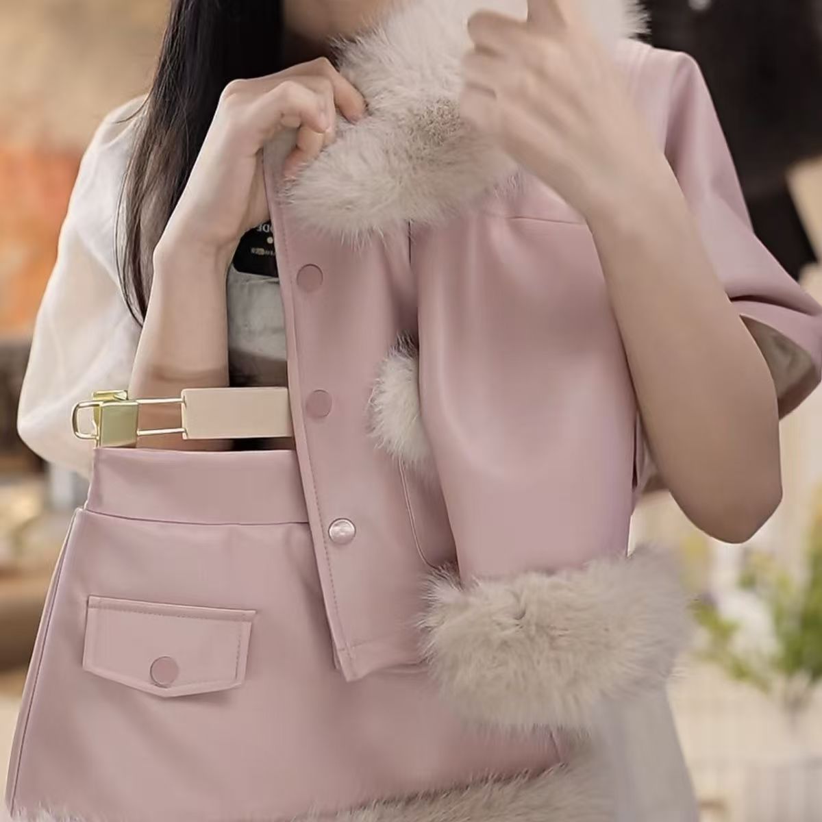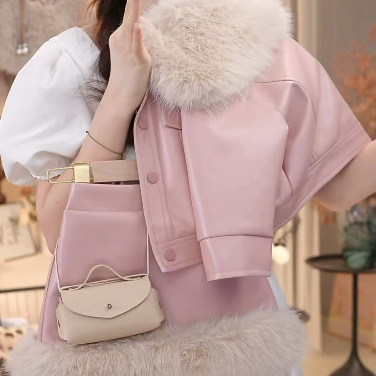 • 핑크 라지 퍼 칼라 가죽 자켓 슈트 [재킷+스커트]