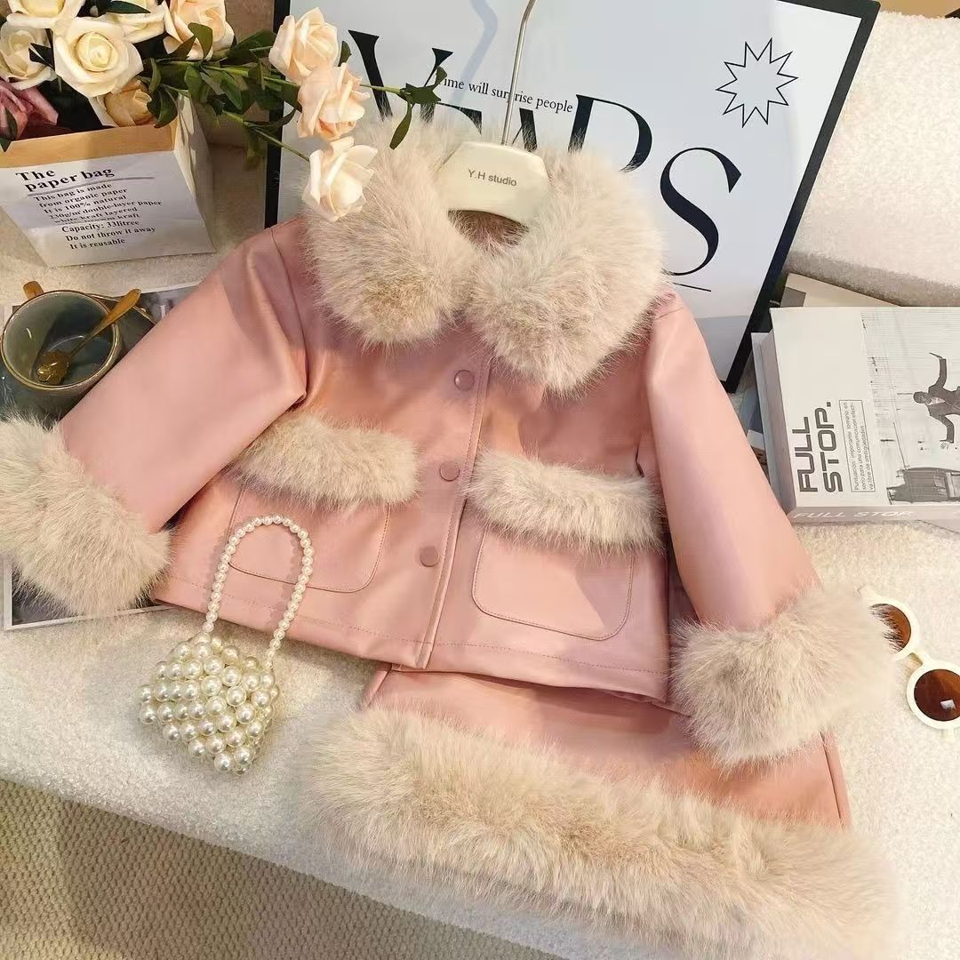 소녀 겨울 가죽 세트 2024 새로운 기모 두꺼운 서양식 어린이 따뜻한 캐주얼 코트 우아한 스커트