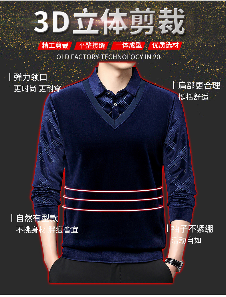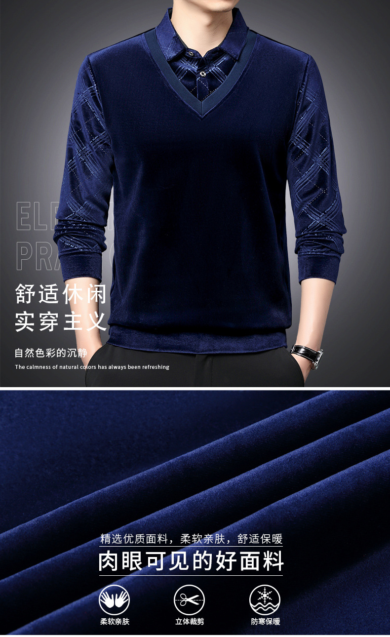 골든 벨벳 남자 가을과 겨울 기모 뜨거운 시추 가짜 2 피스 스티칭 니트 스웨터 중년 기모 유행 올 매치 스웨터