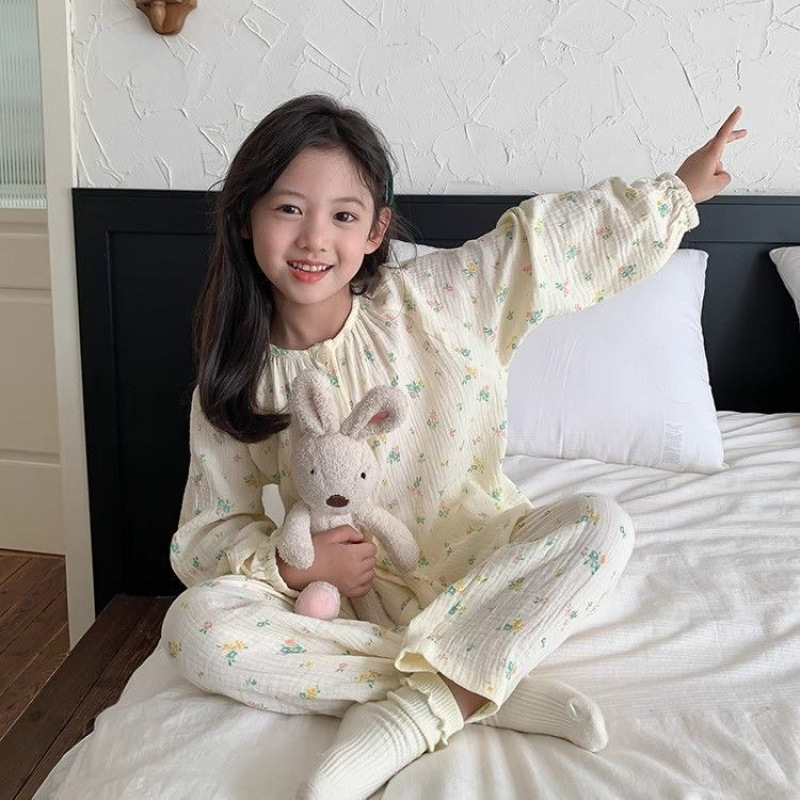 소녀의 큰 소녀의 꽃 잠옷 어린이 소녀의 봄과 가을 둥근 목 서양식 긴 소매 바지 캐주얼 홈 의류 투피스 세트