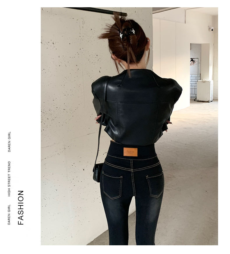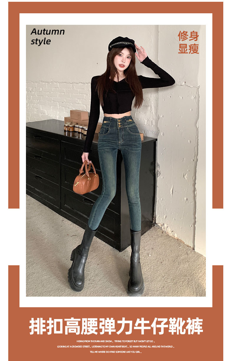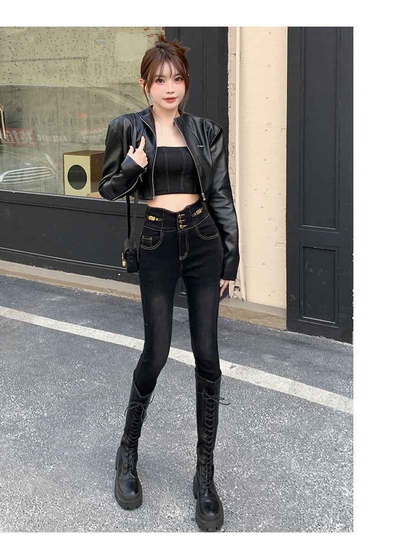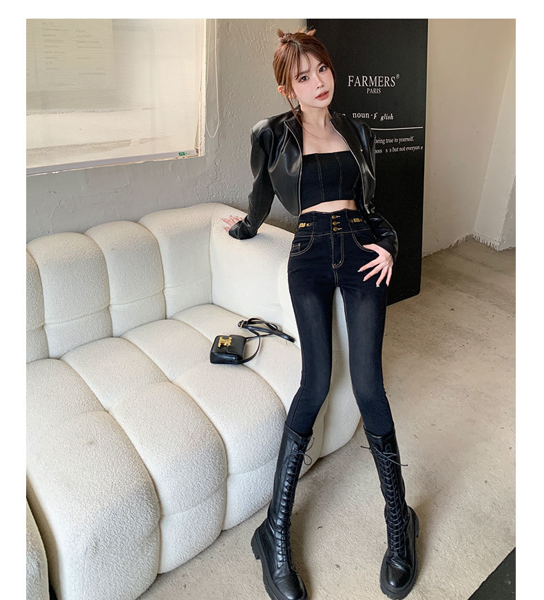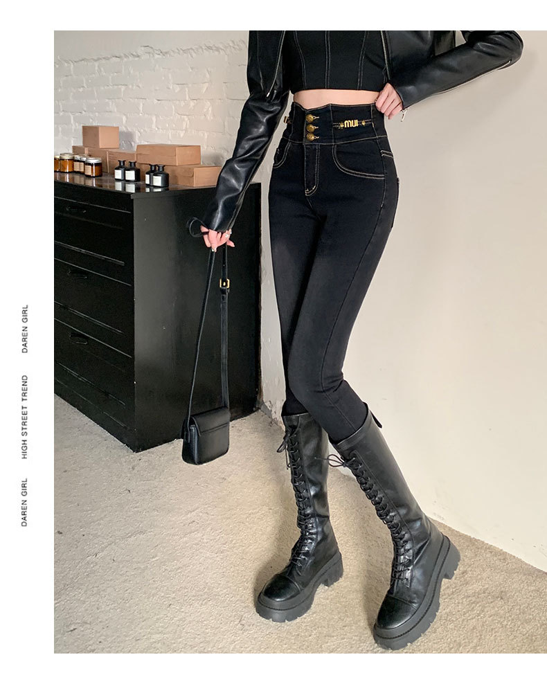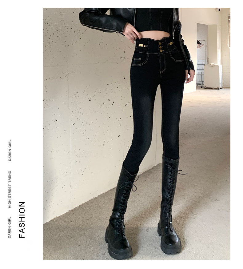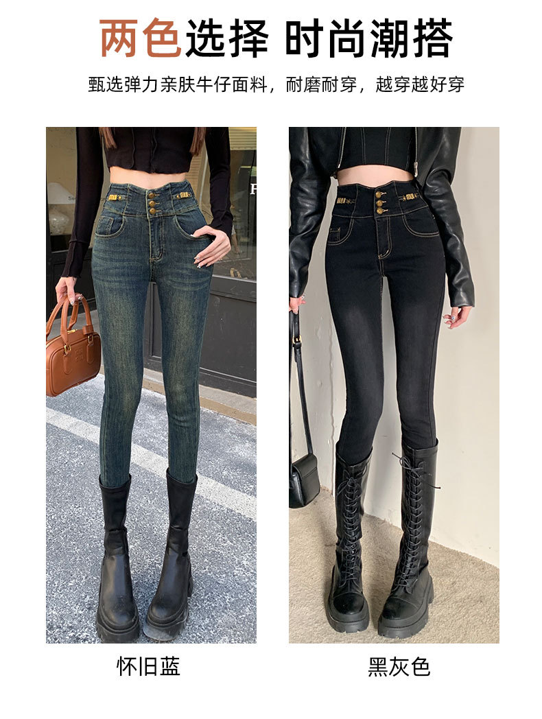 기모 두꺼운 더블 버튼 스키니 청바지 여성의 겨울 높은 허리 꽉 슬림 연필 바지 작은 자른 바지스토어 가기