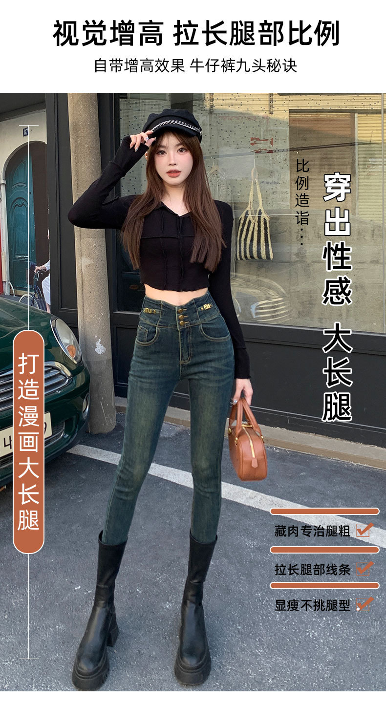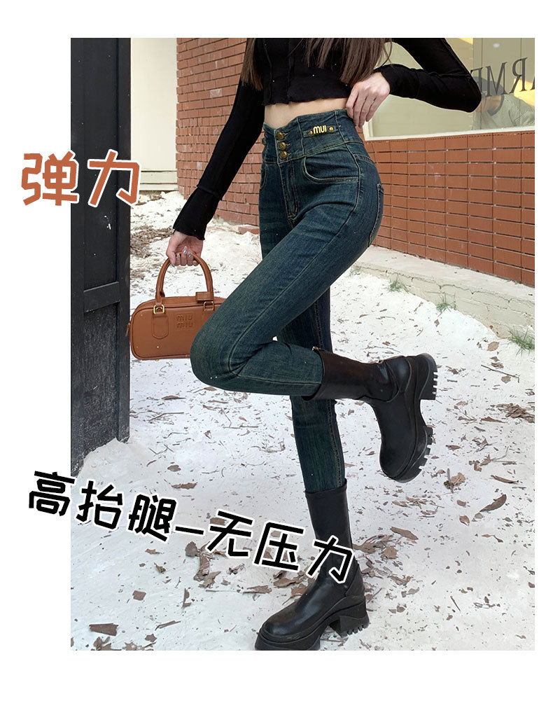 시멘트 그레이 초하이웨이스트 삼단 버튼 데님 팬츠 여성용 가을 겨울용 플리스 안감 슬림핏 레더 브랜드 V 웨이스트 테일러드 팬츠스토어 가기