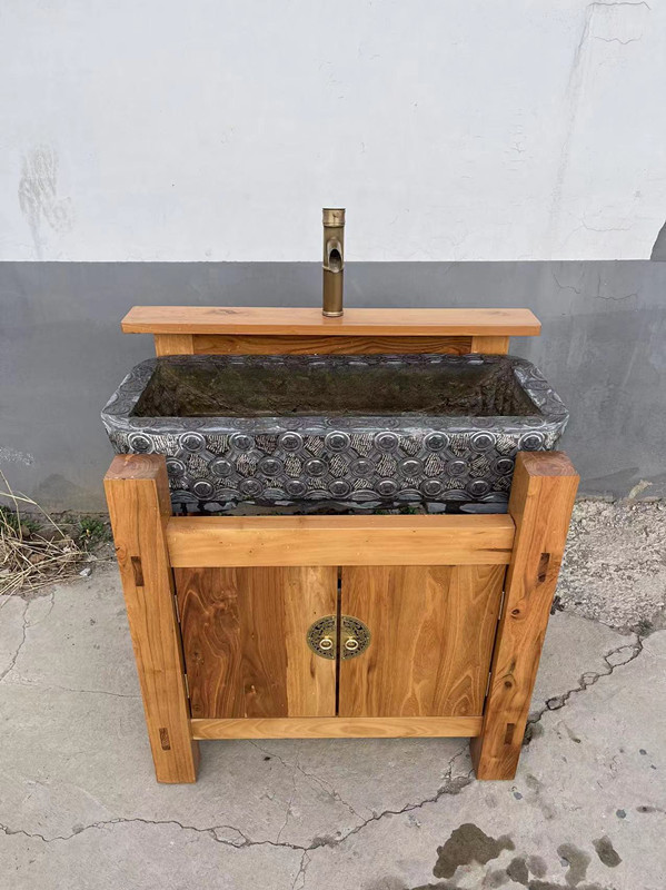 오래된 돌로고, 어항, 물고기 사료통, 말 사료통, 돼지 사료통, 세면대, 나무 선반, 수도꼭지, 안뜰 발코니, 흐르는 물 풍경