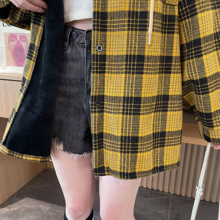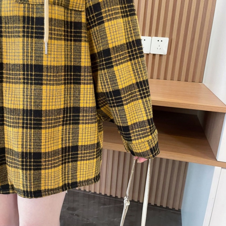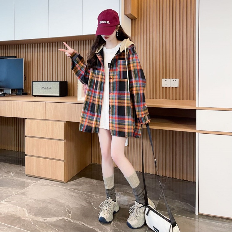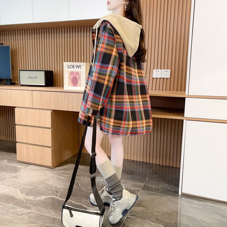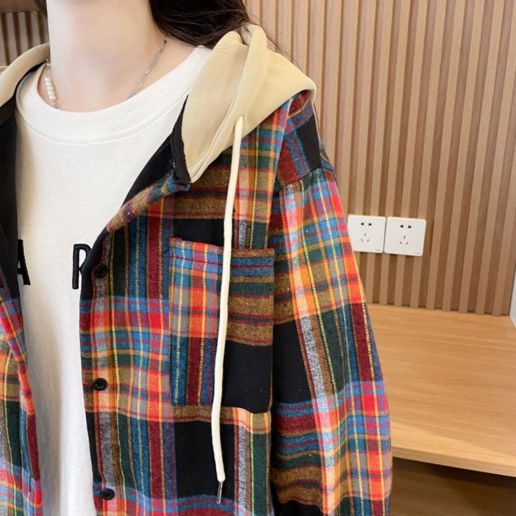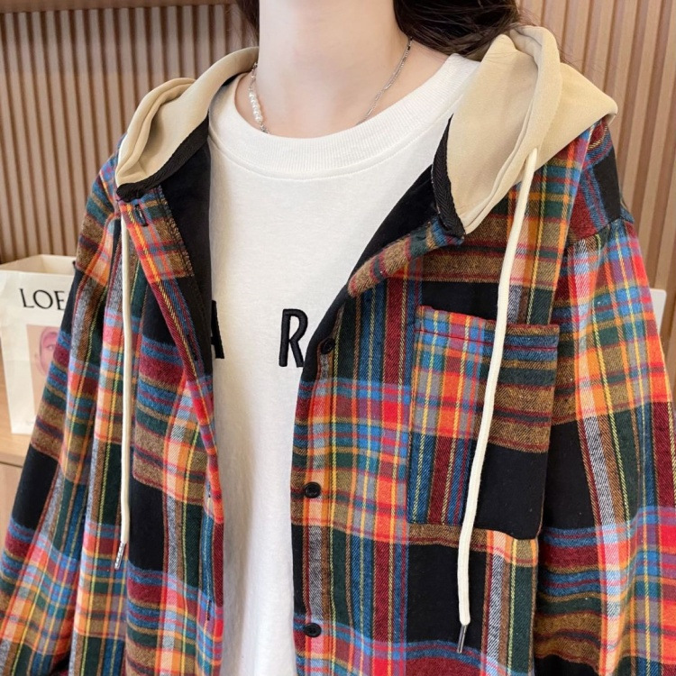 겨울 기모 두꺼운 격자 무늬 후드 긴팔 셔츠 여성용 한국식 미디 루즈 레트로 셔츠 카디건 재킷