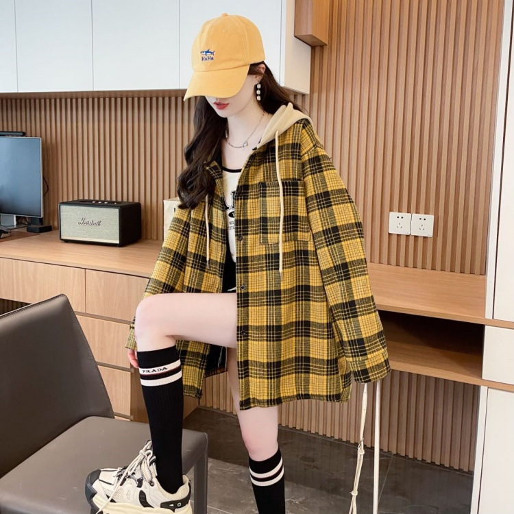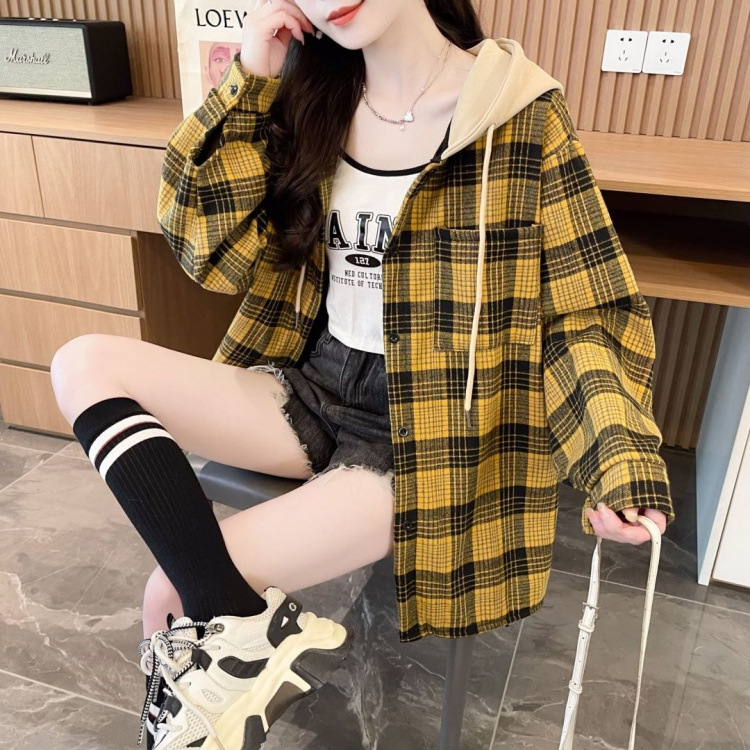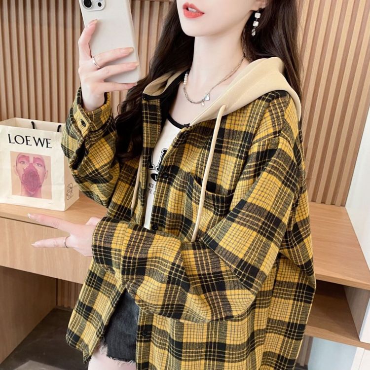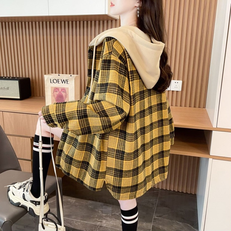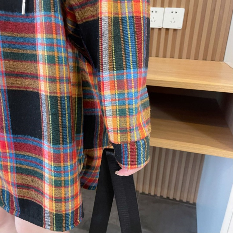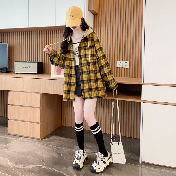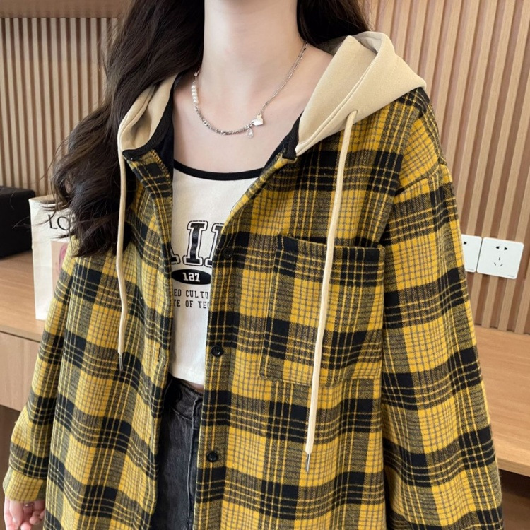 겨울 기모 두꺼운 격자 무늬 후드 긴팔 셔츠 여성용 한국식 미디 루즈 레트로 셔츠 카디건 재킷