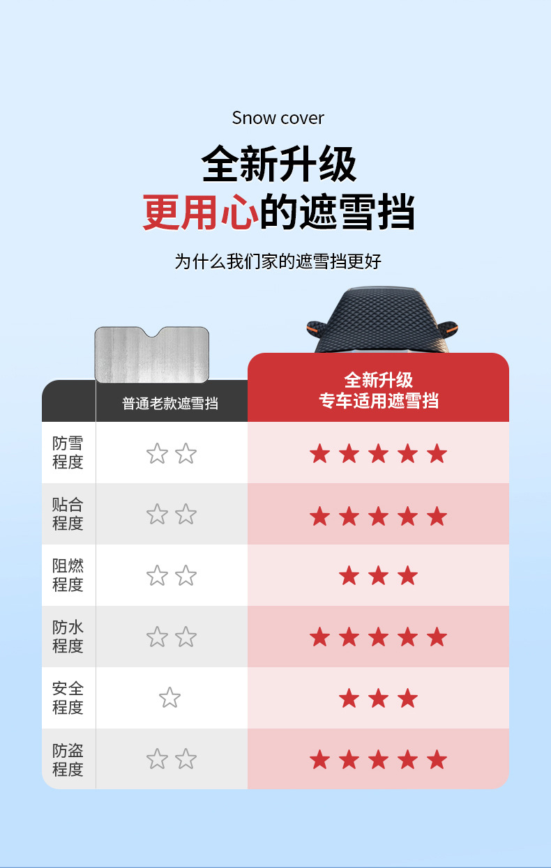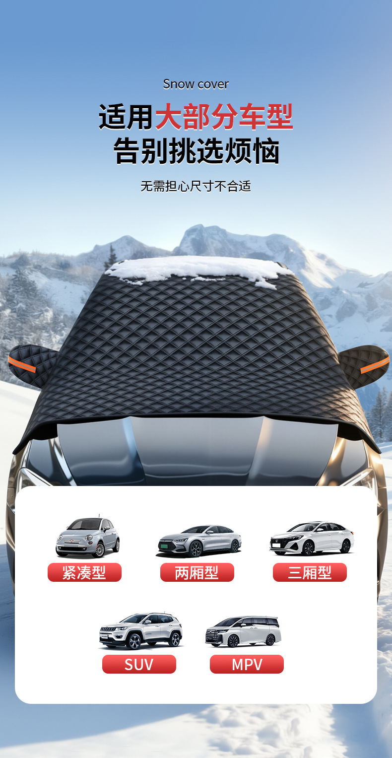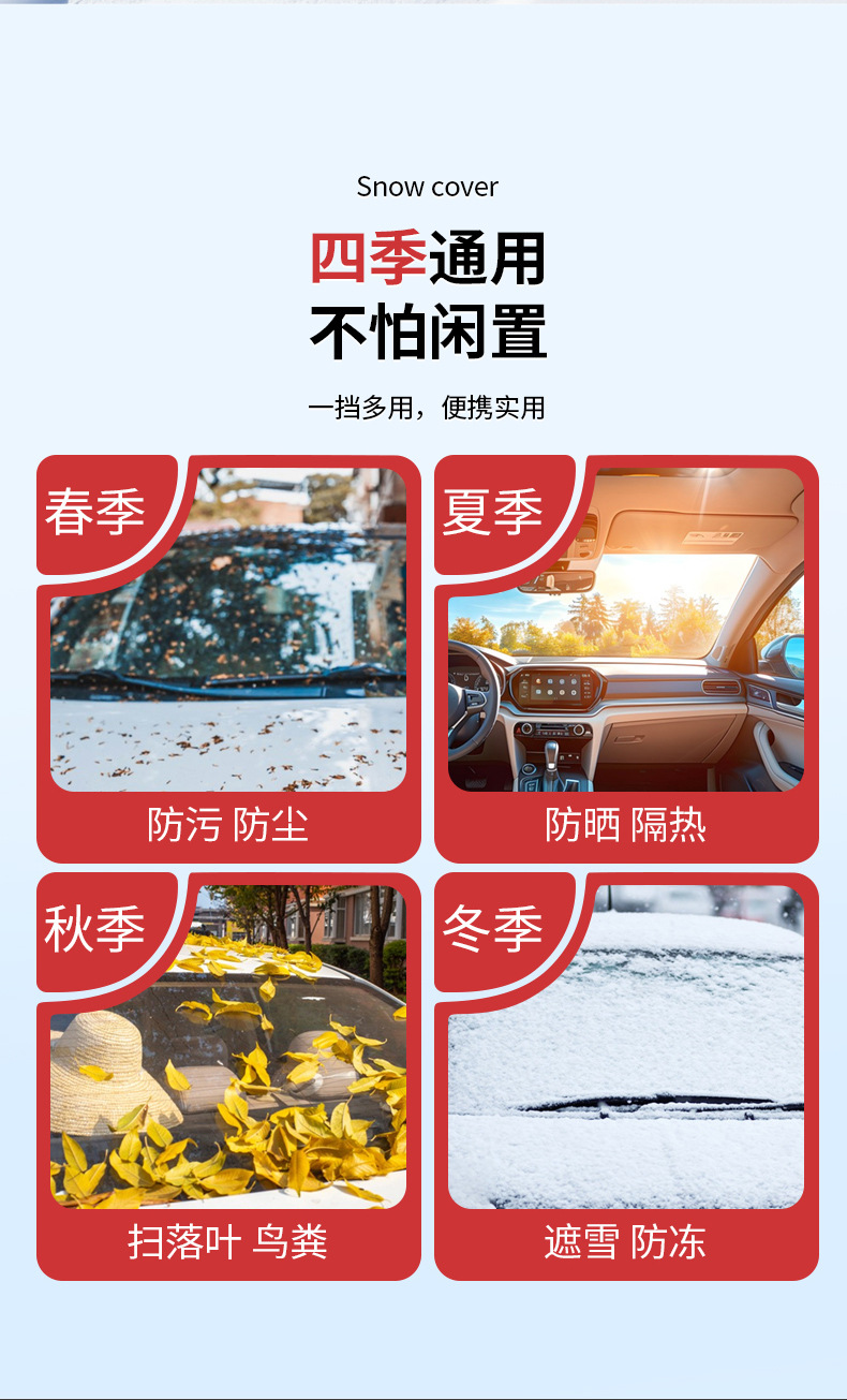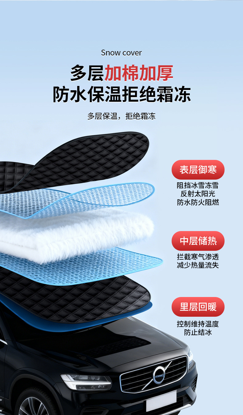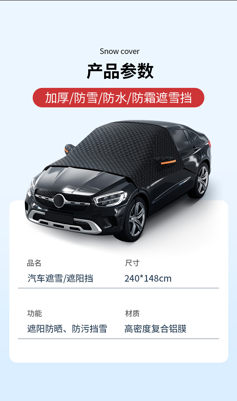 1、铝膜材质,不伤车漆,防晒、隔热、防雨雪、防风尘、防划痕、抗拉力强。