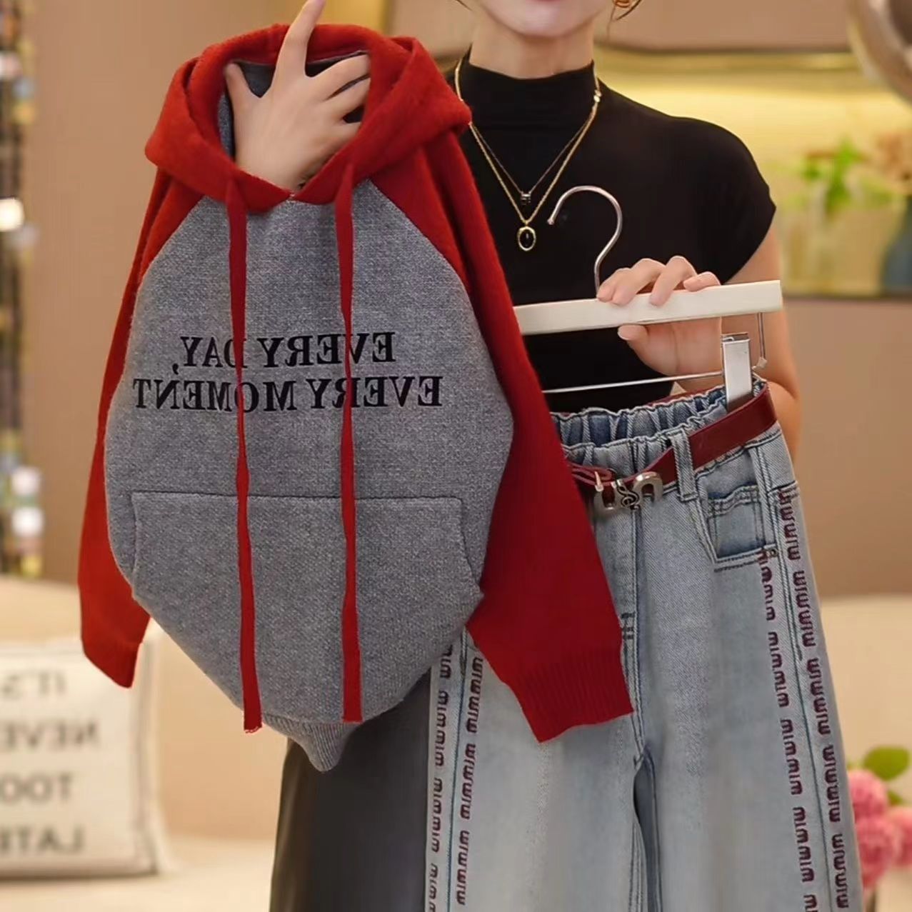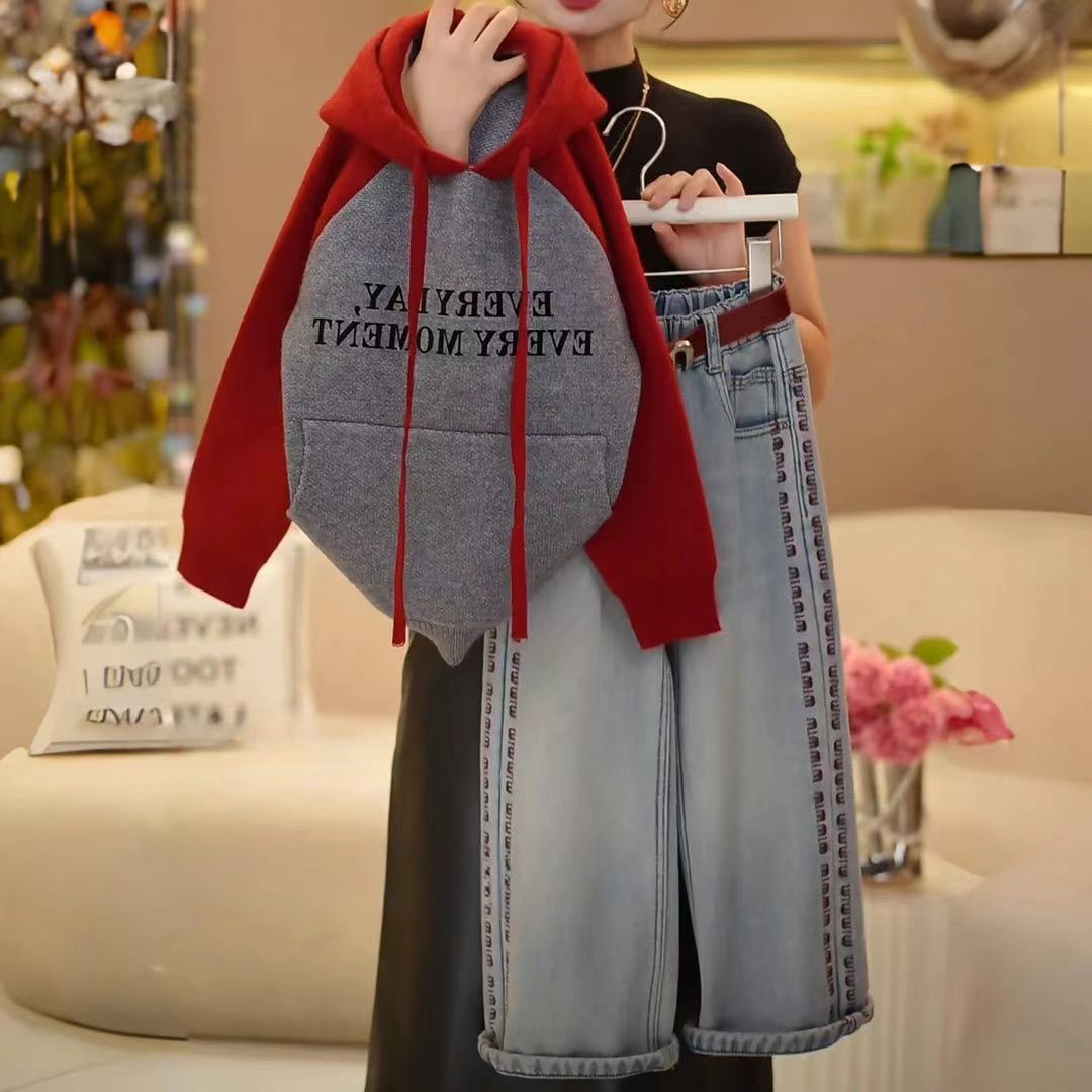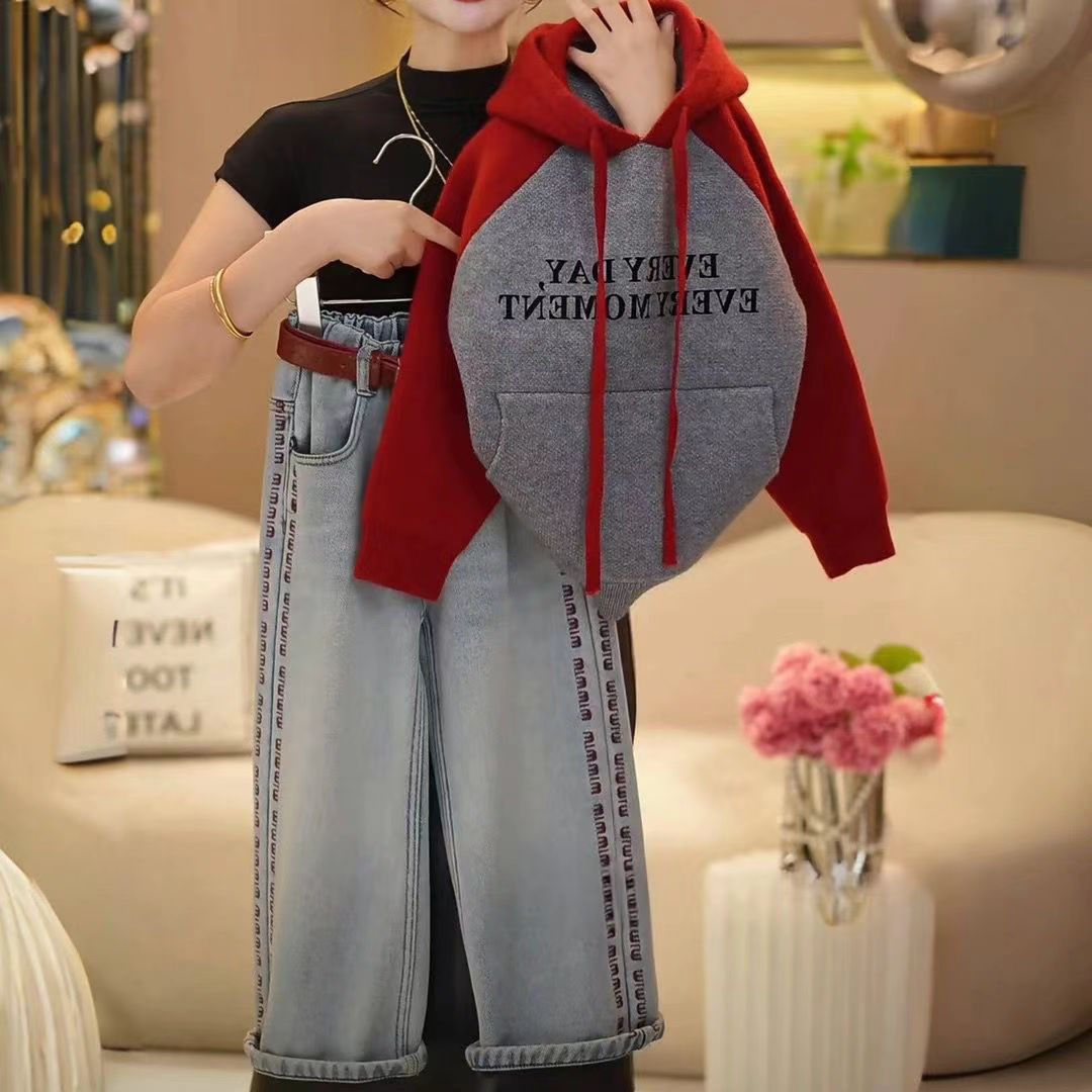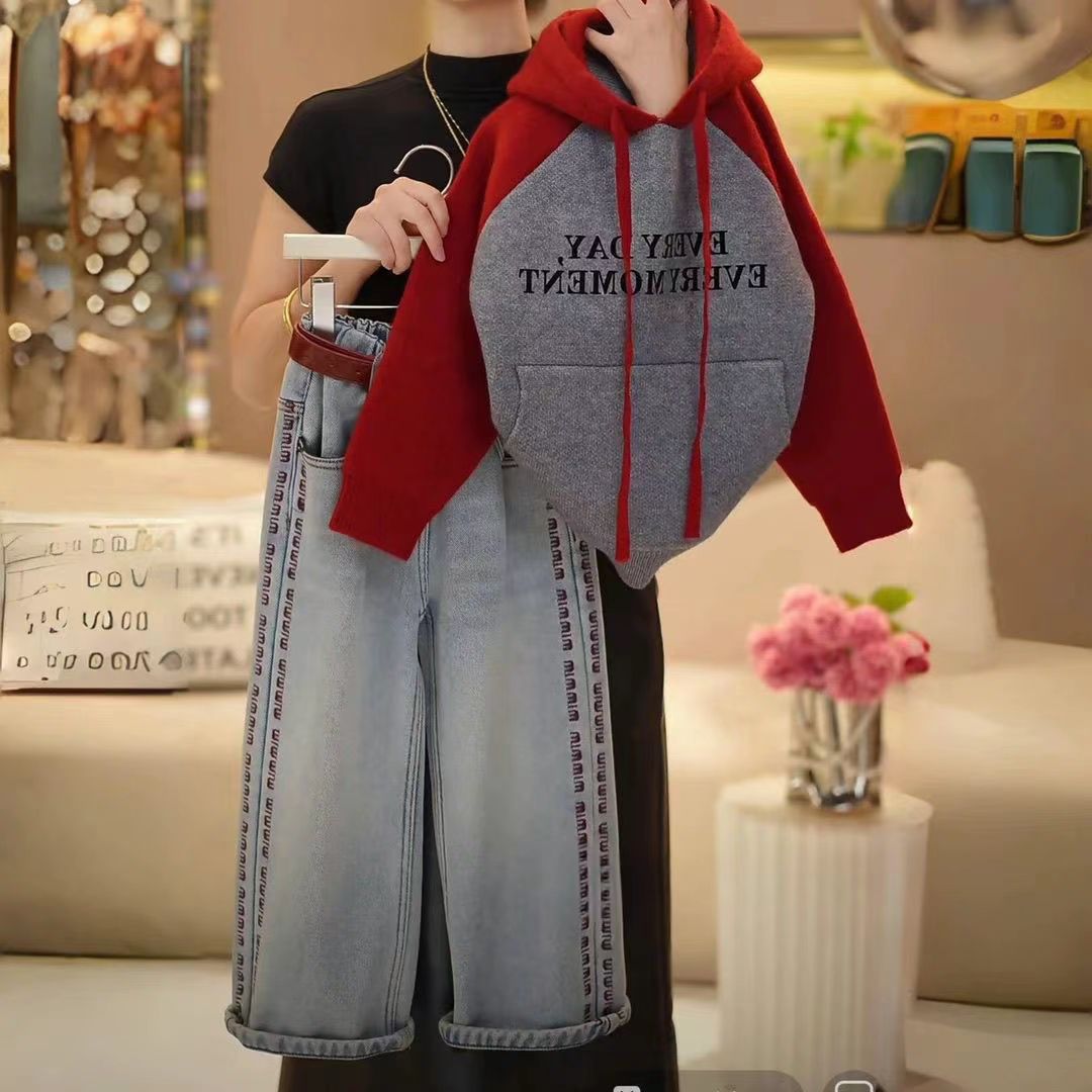 소녀 겨울 스웨터 세트 2024 서양식 어린이 두꺼운 캐주얼 후드 컬러 차단 스웨터 기모 청바지스토어 가기