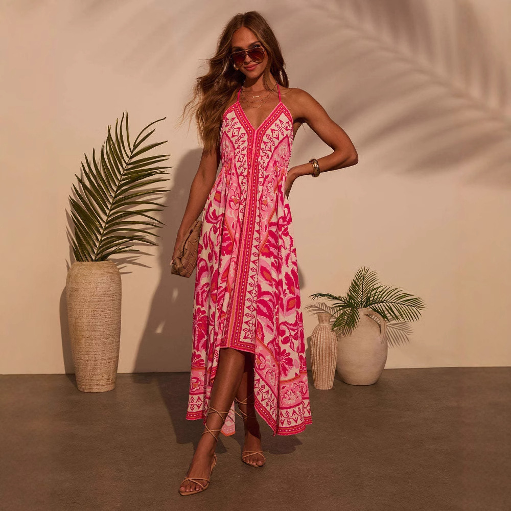 2025 새로운 봄과 여름 어깨 V-목 여성의 슬링 인쇄 요정 스타일 여성을위한 큰 원피스 긴 우아한 원피스