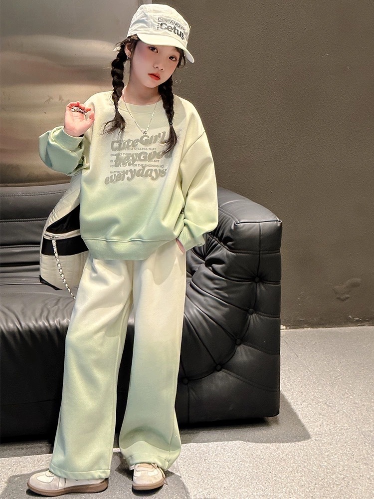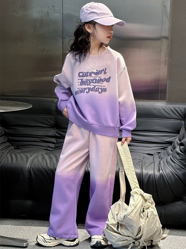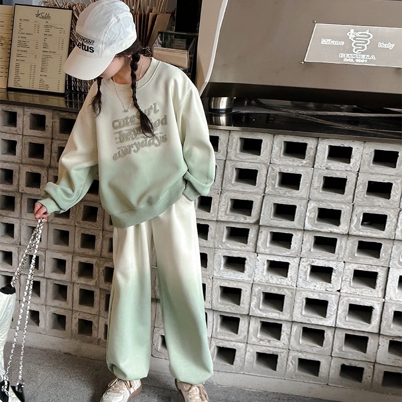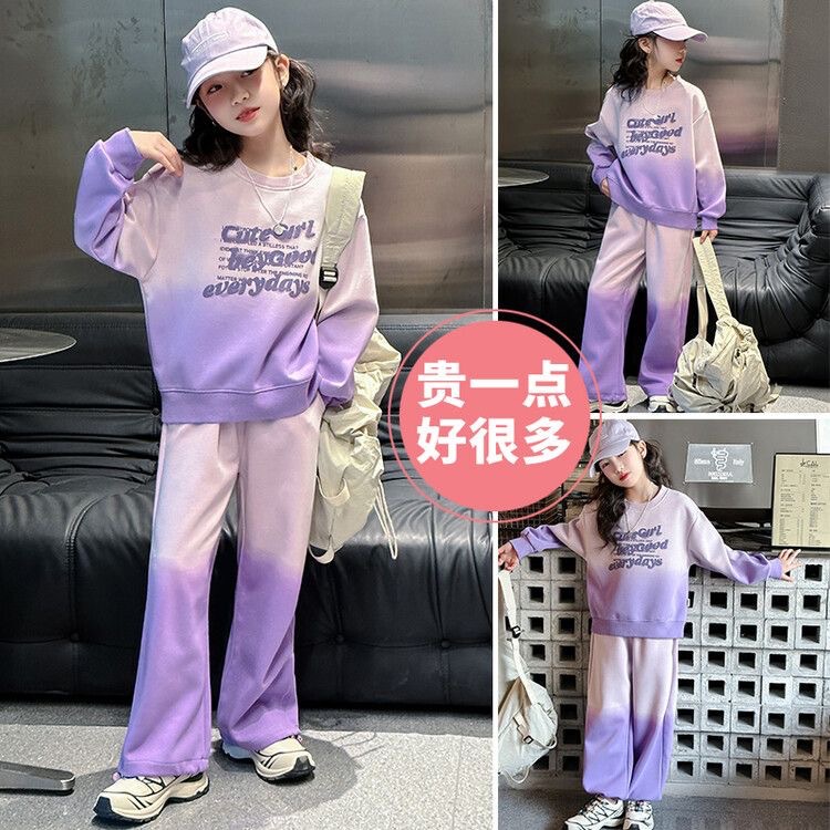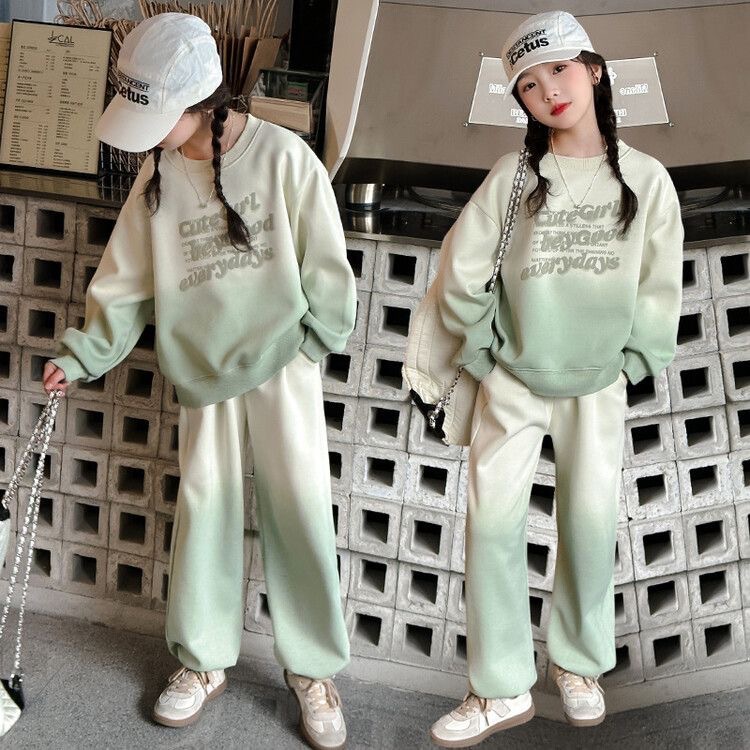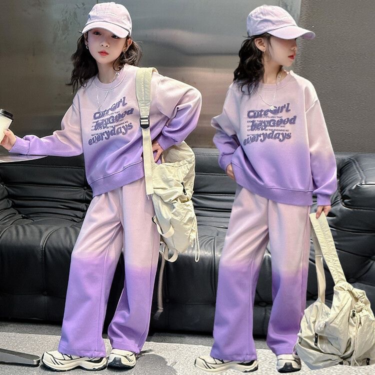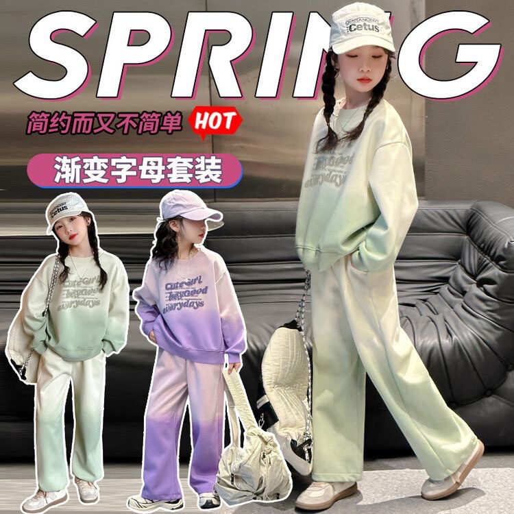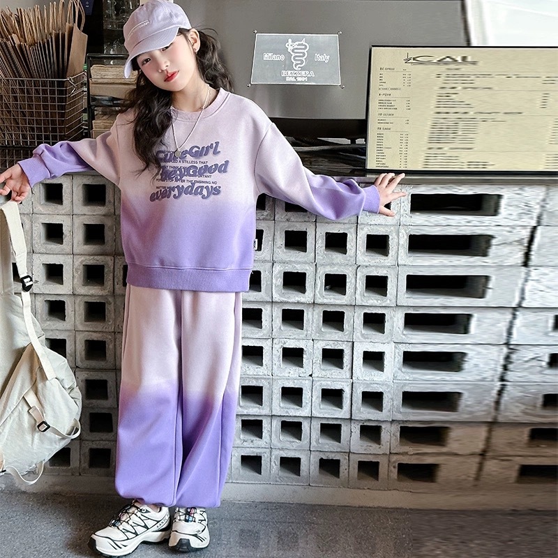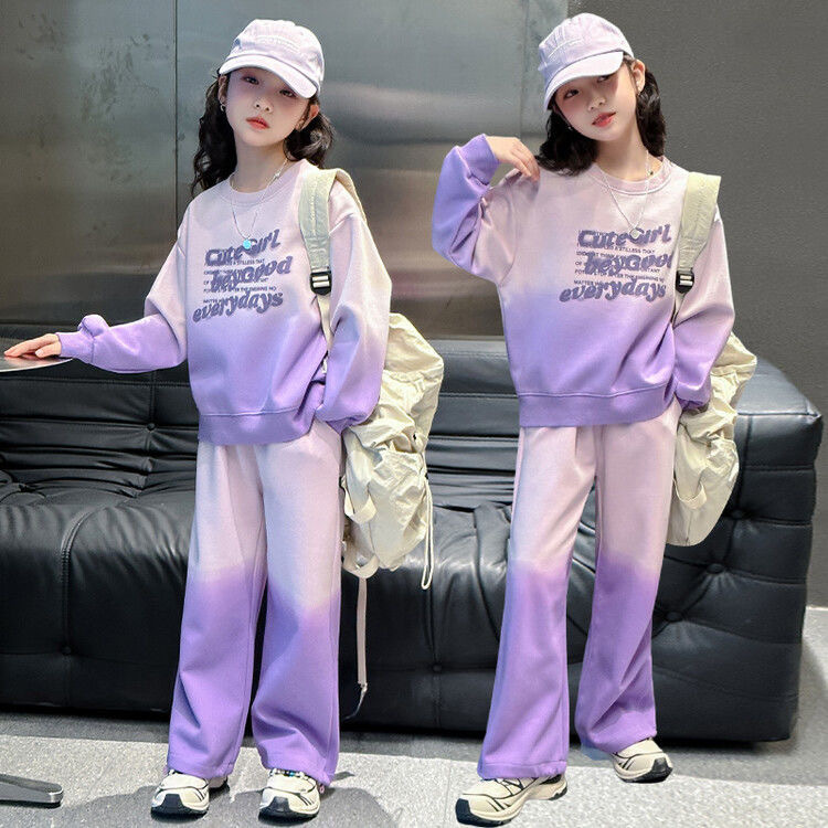 소녀의 봄 2024 새로운 소녀의 서양 스타일 봄과 가을 점진적 컬러 스웨트 스포츠 바지 큰 어린이 캐주얼 컬러 세트스토어 가기