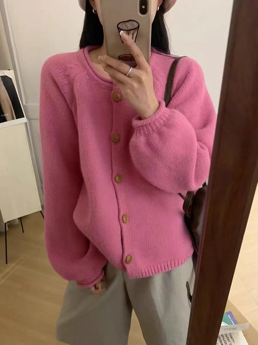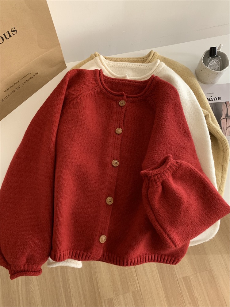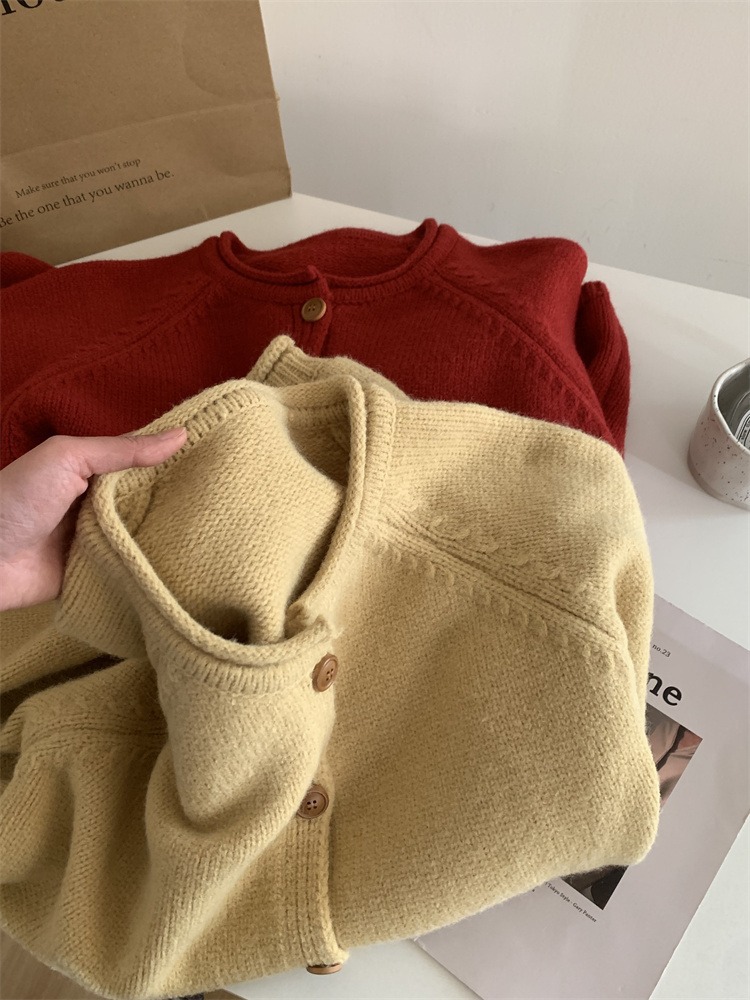 라글란 슬리브 레트로 컬 스웨터 코트 여성용 느슨한 한국식 슬리밍 따뜻한 둥근 목 겨울 두꺼운 니트 카디건