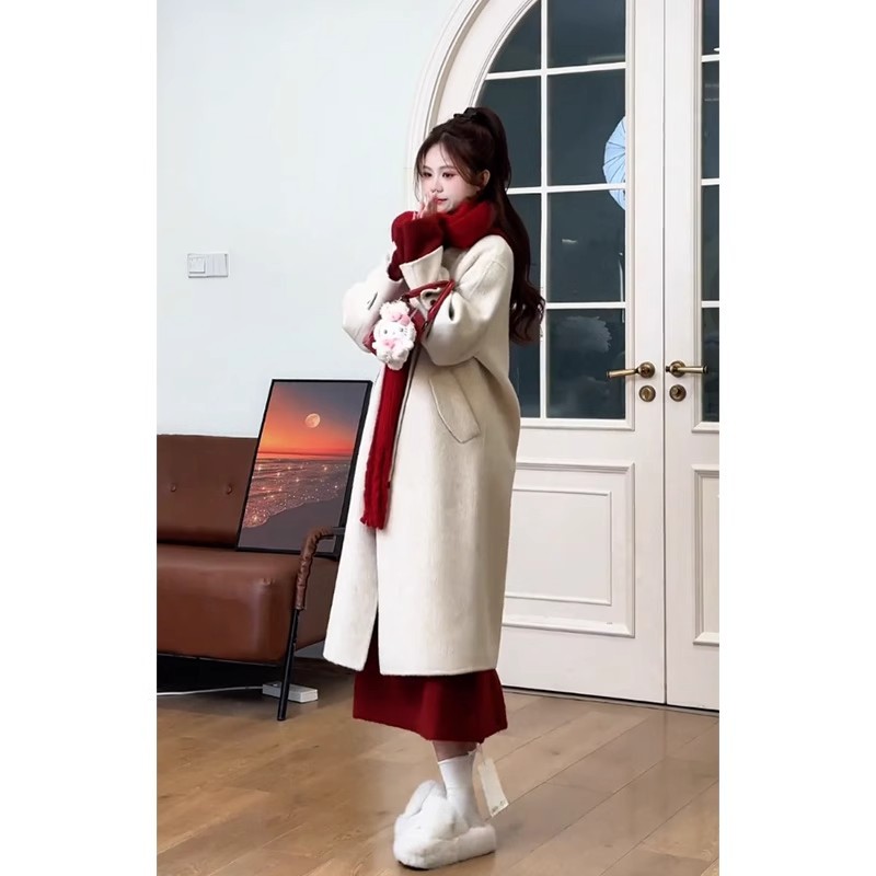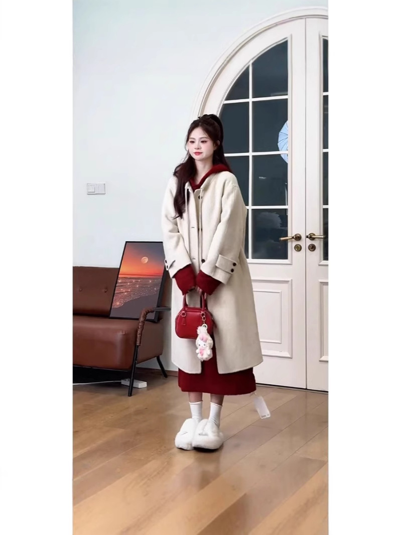 프랑스 레트로 올매치 모직 코트 여자 가을과 겨울 새로운 한국 스타일 여유로운 후즈 니트 원피스스토어 가기