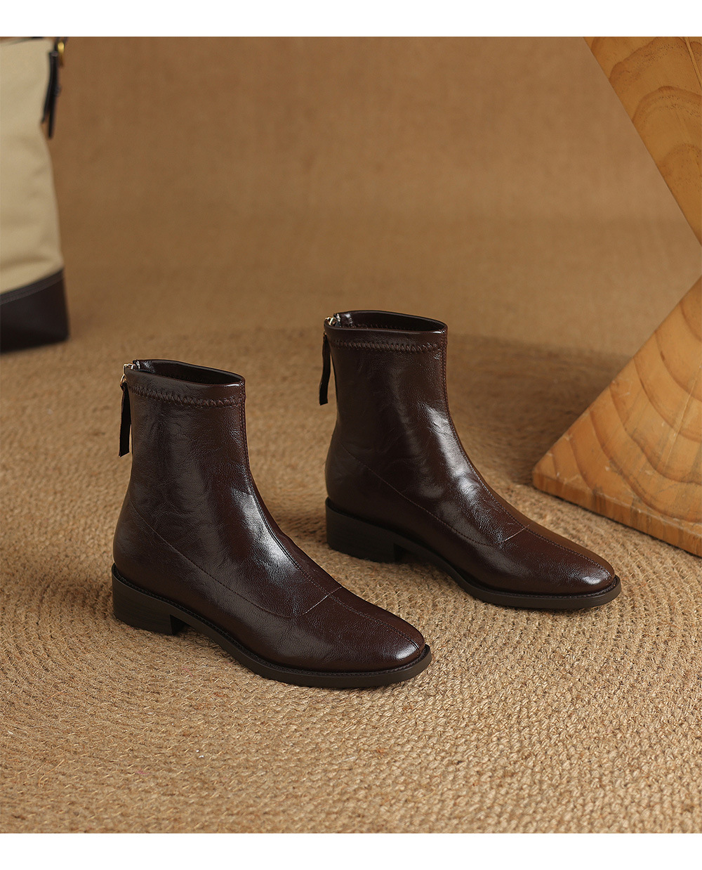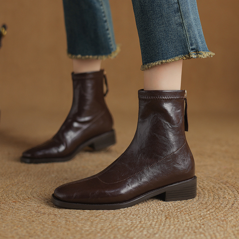 프랑스 레트로 스퀘어 헤드 청키 힐 스트레치 얇은 부츠 여성용 봄과 가을 싱글 부츠 올 매치 슬림 룩 마틴 부츠 미드 로우 힐 발목 부츠
