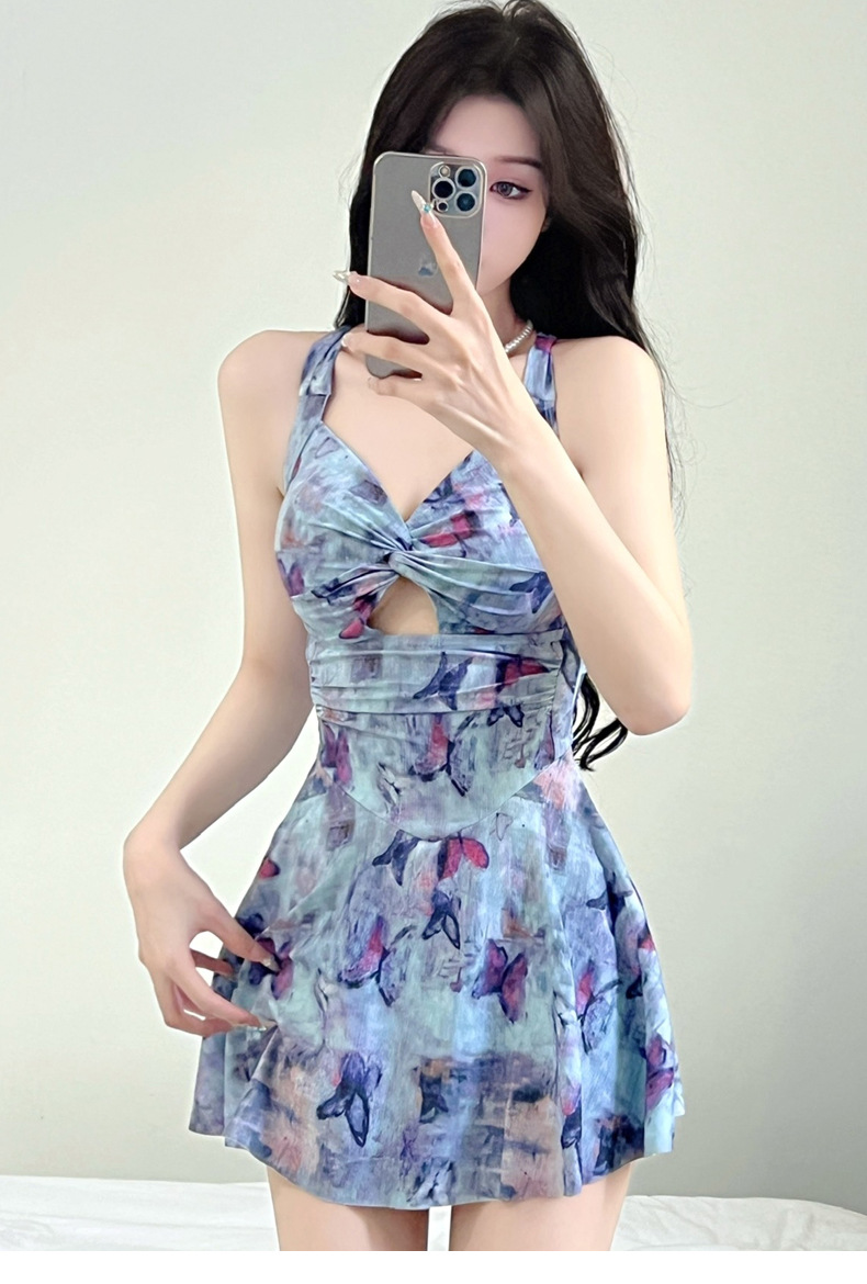2024 여름 새로운 미국 스파이스 소녀 메쉬 슬링 원피스 나비 인쇄 엉덩이 가방 원피스 여성의 유럽과 미국 국경스토어 가기