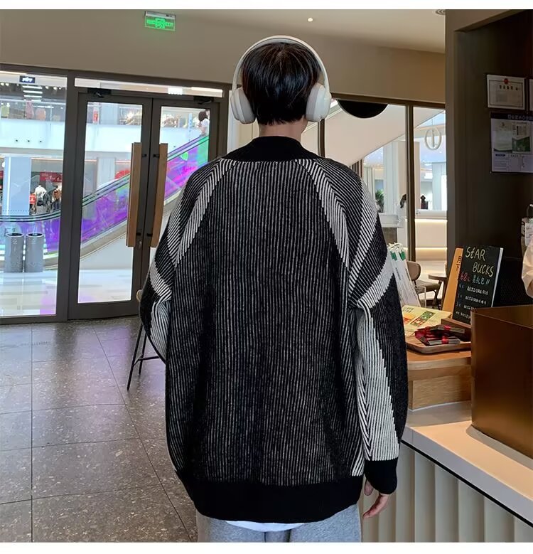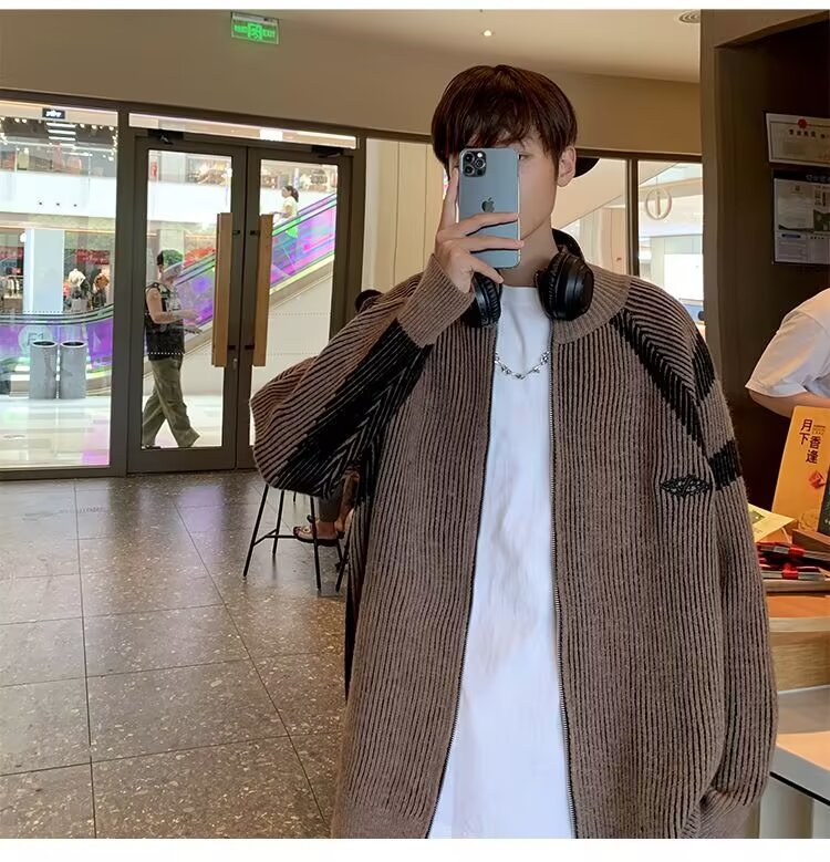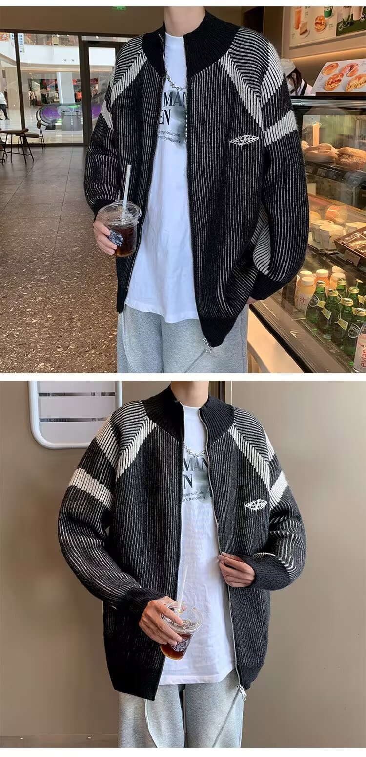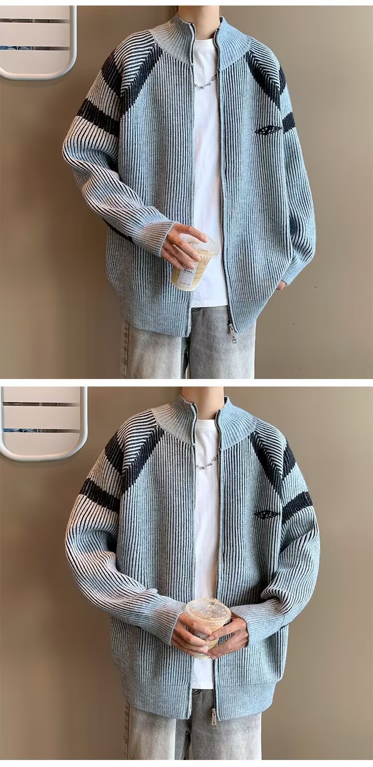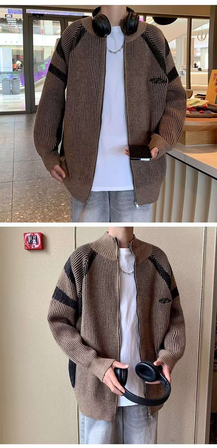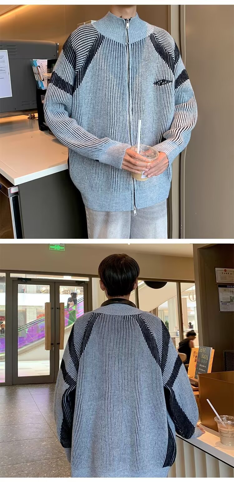 틈새 디자인 센스 수직 스트라이프 지퍼 수직 칼라 니트 카디건 남자 트렌디 스트리트 올 매치 콘트라스트 컬러 스웨터 재킷스토어 가기